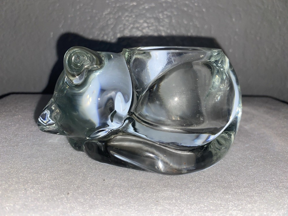 The Indiana Glass VOTIVE TEALIGHT HOLDER is a vintage piece featuring a clear glass design with a sleeping, curled up cat shape. This medium-sized candle holder is perfect for all occasions and is suitable for use with votive candles. Made in the United States in the 1980s by Indiana Glass, this art deco style piece is a charming addition to any decor, especially for cat lovers. The clear finish adds a touch of elegance to the overall design, making it a unique and eye-catching piece for any home.