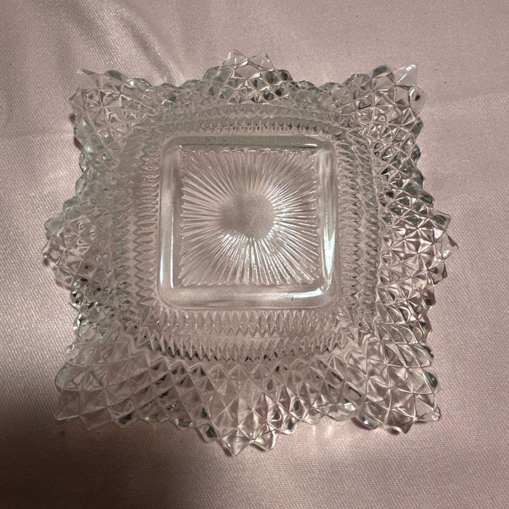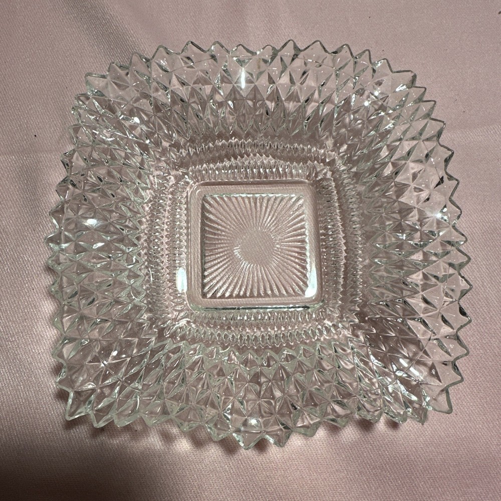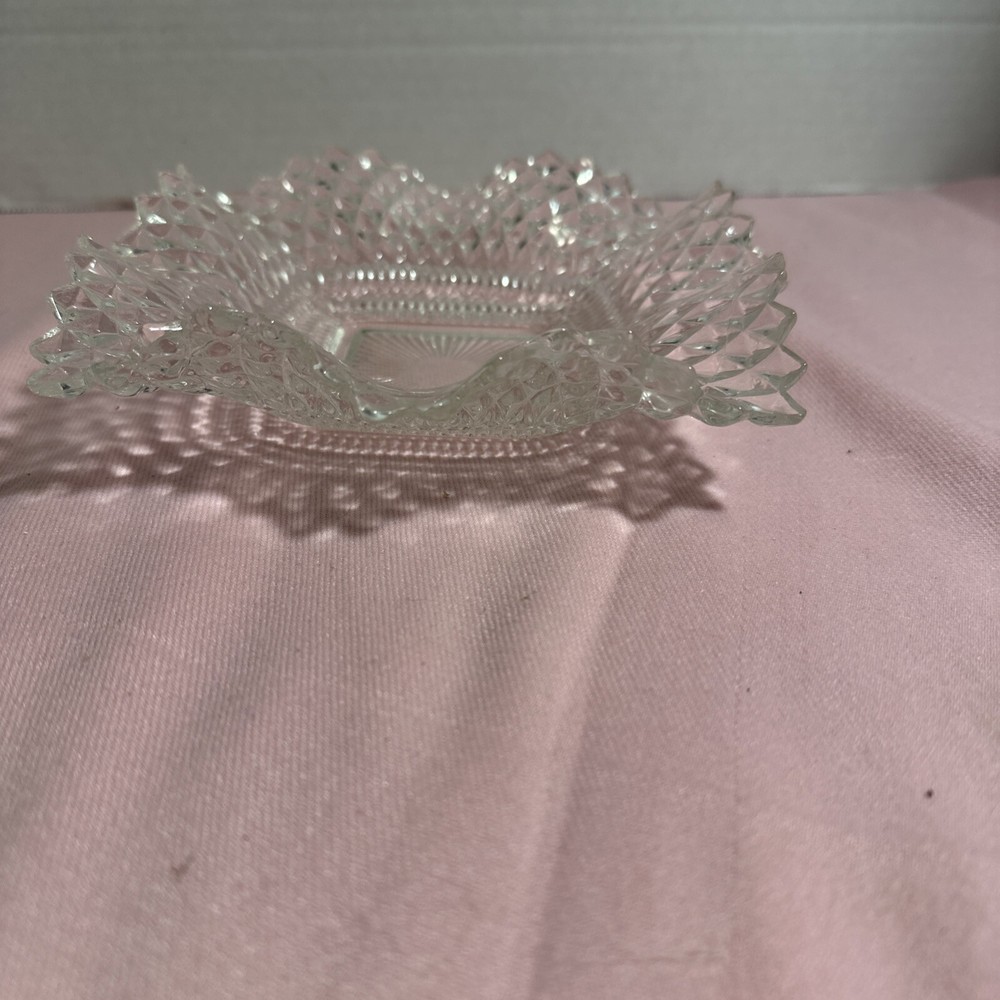 Vintage Clear Indiana Glass Co Square Ruffled Diamond Point Candy Nut Dish Bowl is a mid-century modern bowl made by Indiana Glass Company in the 1940s/1950s/1960s. The bowl is square-shaped with a diamond pattern and ruffled edges, measuring 7 inches in length and width. It is made of pressed glass and features a clear color. This original vintage piece showcases a production style of pressed glass and a fused glass technique, representing the mid-20th-century era. Lot F