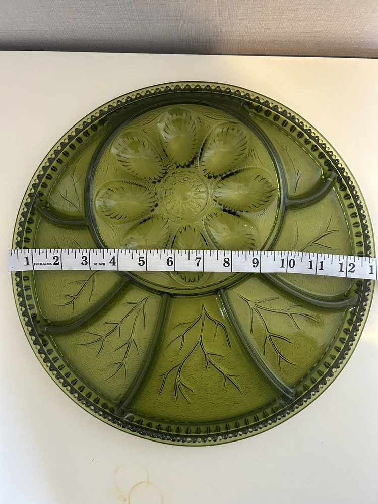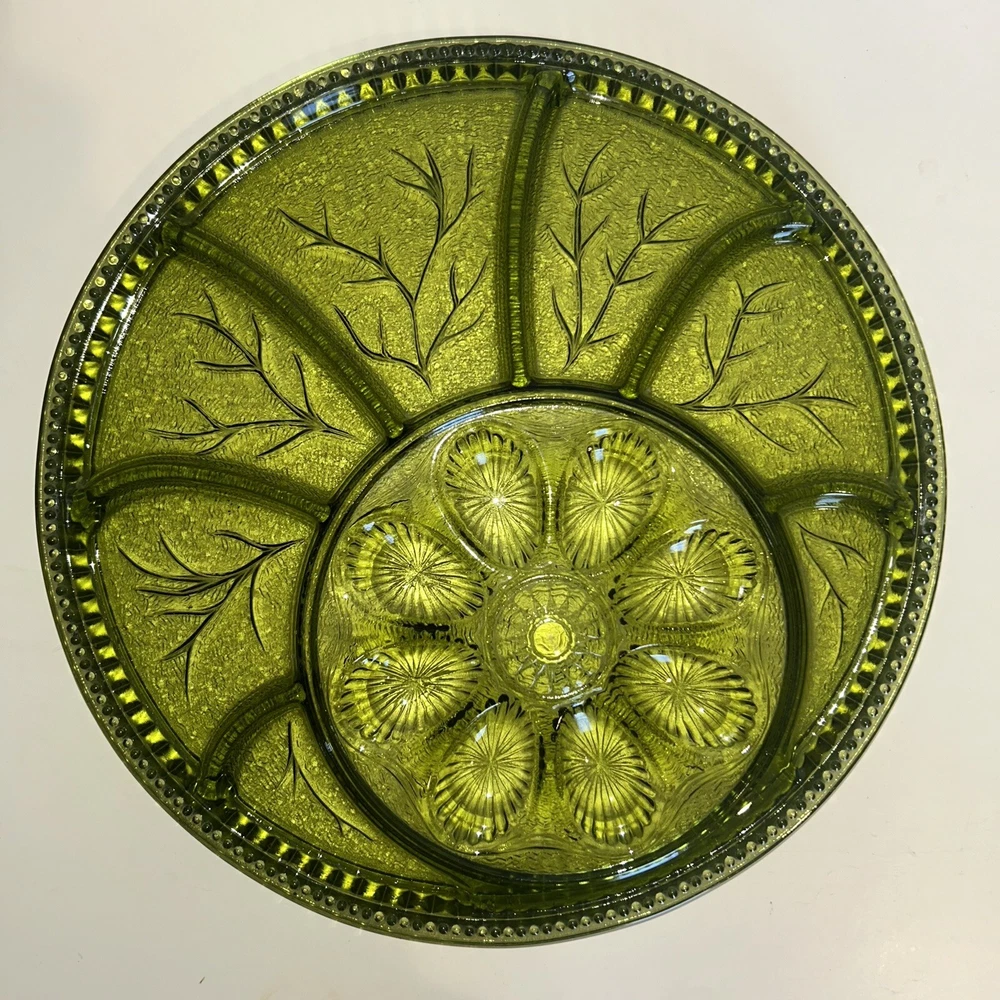 This vintage Indiana Glass deviled egg plate is a stunning addition to any collection. The green divided platter features a beautiful pattern and is perfect for all occasions. The round shape and mid-century modern style make it a great choice for any decor. Crafted from high-quality glass, this plate is durable and long-lasting. The Century product line ensures that you are getting a vintage piece that is both stylish and functional. Add this unique plate to your collection today!