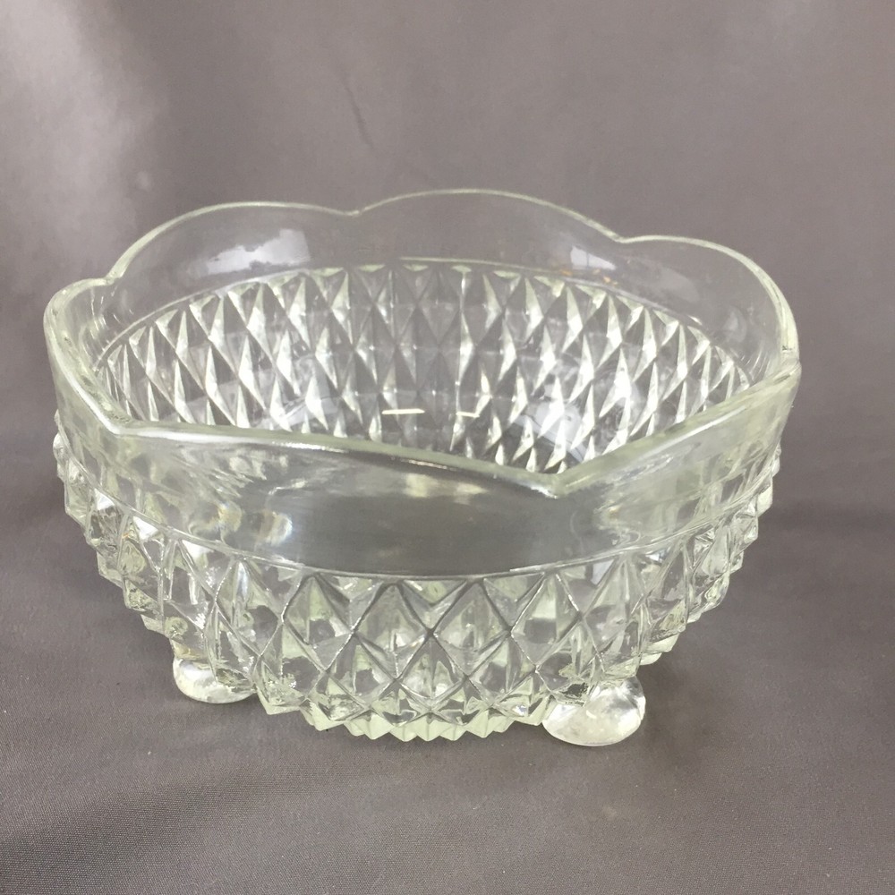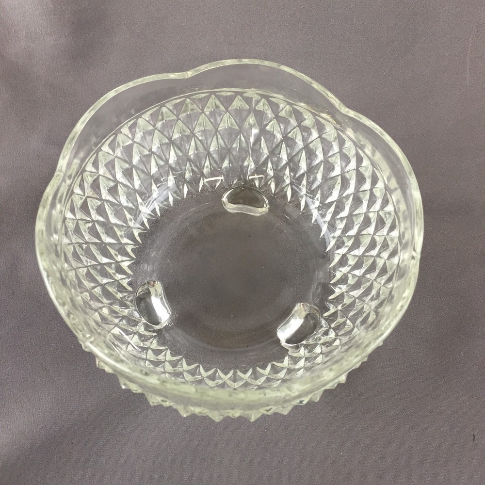 Vintage Indiana Glass Diamond Point Clear Bon Bon Footed Round Candy Bowl Measures: 3" tall and 5" diameter No breaks, cracks or chips