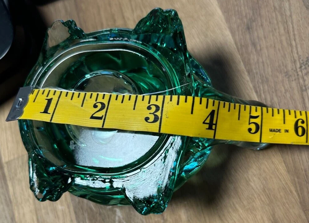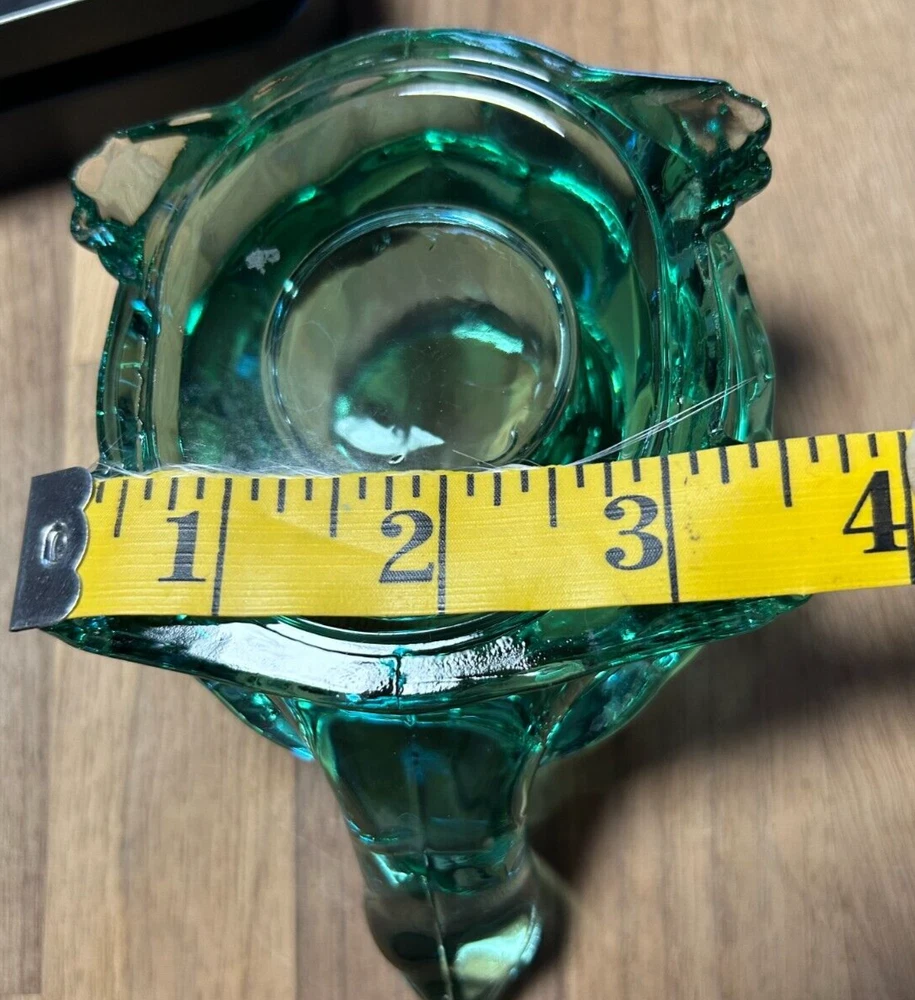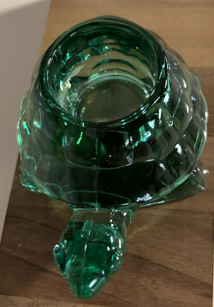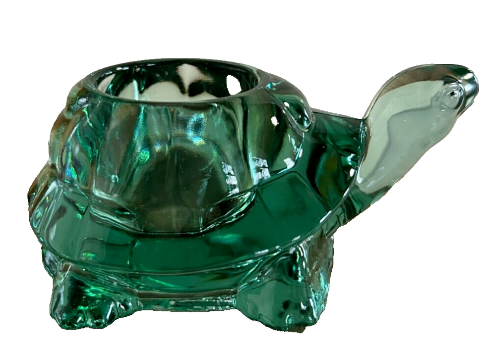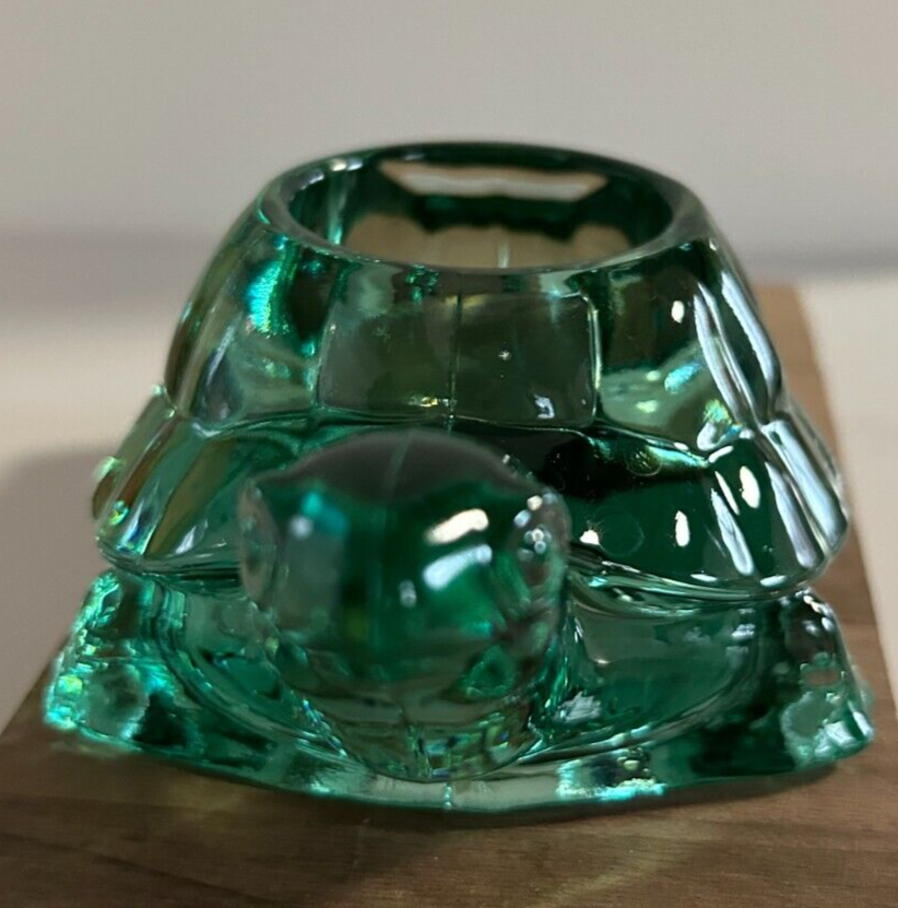 Vintage Indiana Glass Green Turtle Figurine Tea Light Votive Candle Holder 5.5" inches long 3.75" inches wide 2.5" inches tall Beautiful Emerald green color Vintage Indiana Glass Green Turtle Figurine Tea Light Votive Candle, is in great vintage condition. It does have a slight chip on one of its hind legs, which does not take away from how it is displayed. It has never been used. Please review all pictures for proper assessment of its great vintage condition.