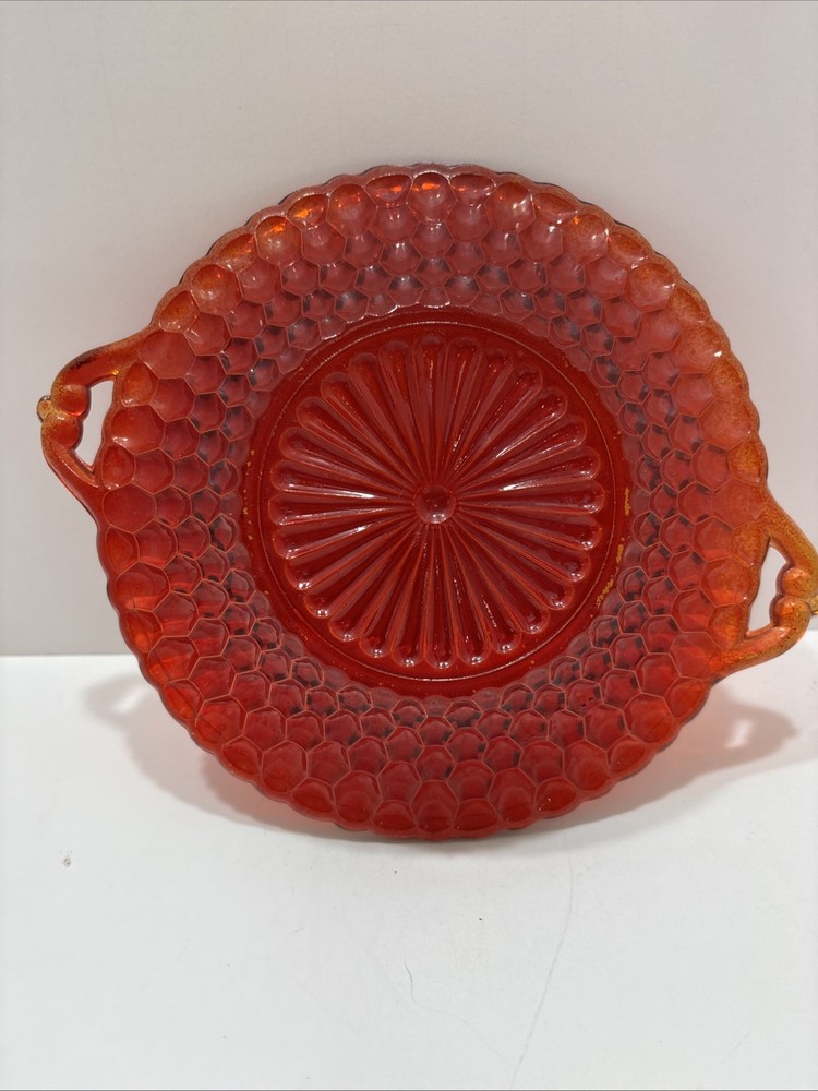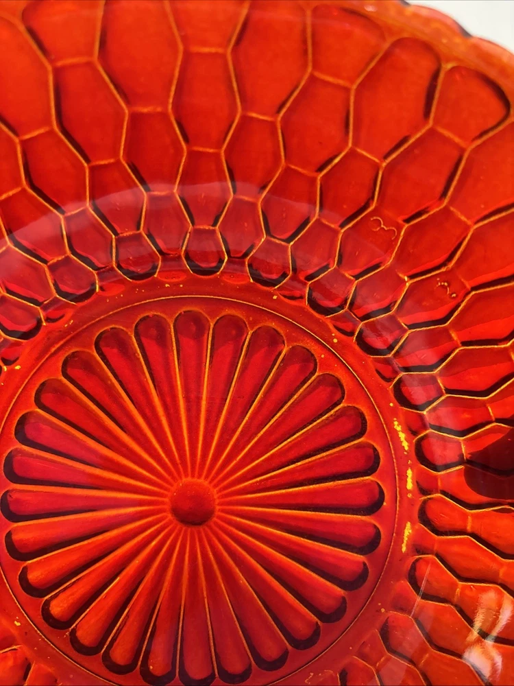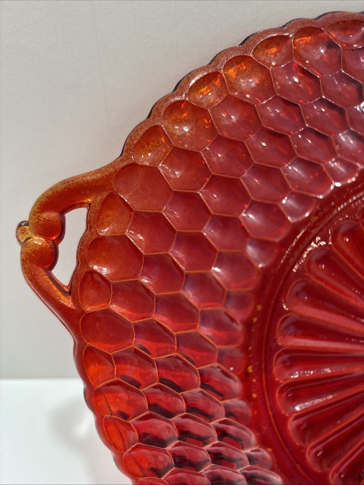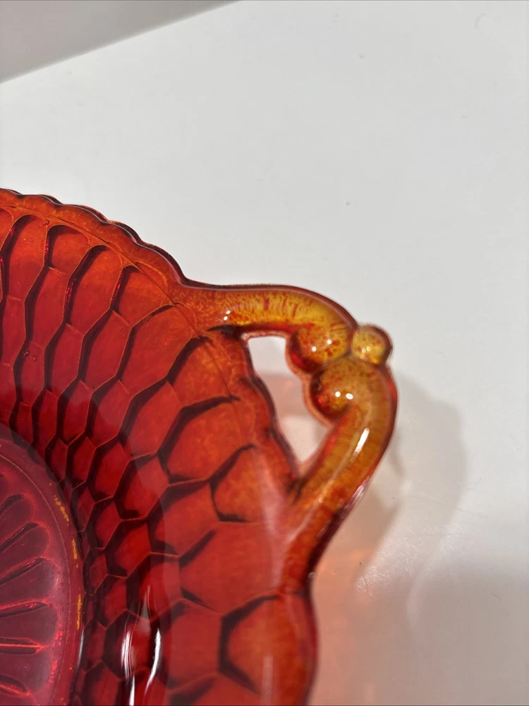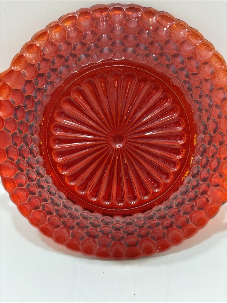The Vintage Indiana Glass Honey Comb Pattern Serving Dish is a charming 8" round candy dish made of red glass in the United States. This decorative piece features a unique honey comb pattern design that adds a touch of retro elegance to any table setting. Perfect for serving candies, snacks, or desserts, this Indiana Glass dish brings a touch of nostalgia to your dining experience.