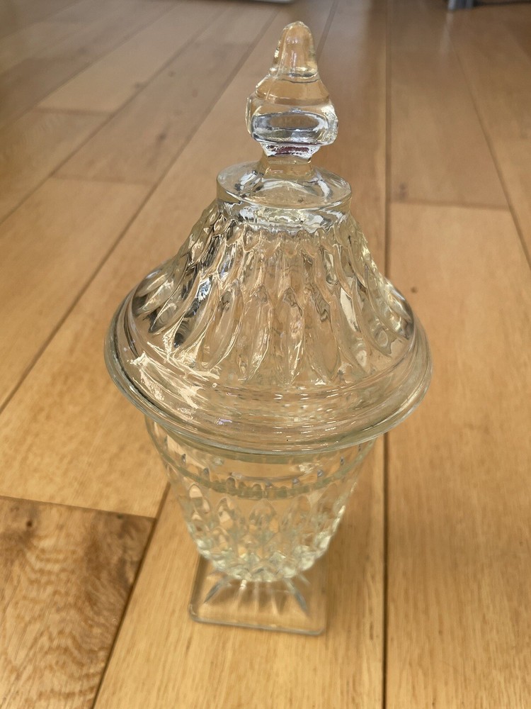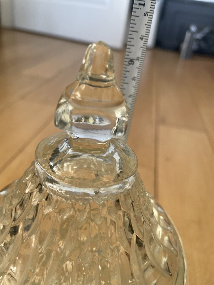 This vintage Mount Vernon candy dish by Indiana Glass Company is a round pedestal bowl with a lid, perfect for storing and displaying sweets. The design features a cut glass pattern in clear glass, giving it a timeless mid-century modern style. The dish is dishwasher safe, making it easy to clean and maintain. A lovely addition to any home, this covered candy dish is both functional and decorative, ideal for serving treats in style.