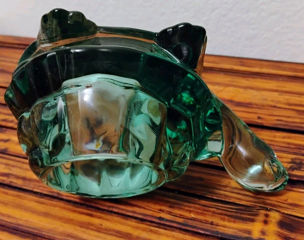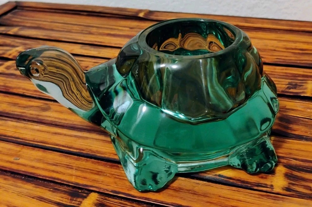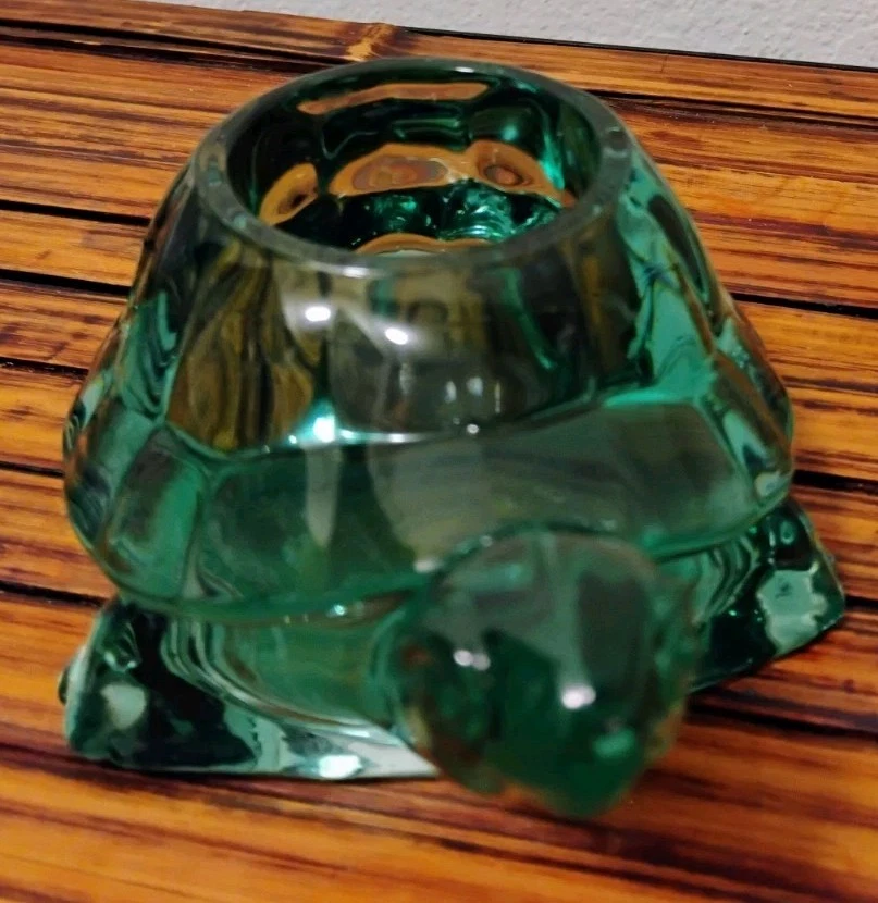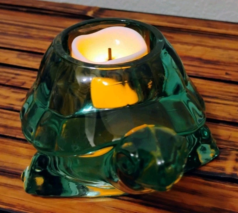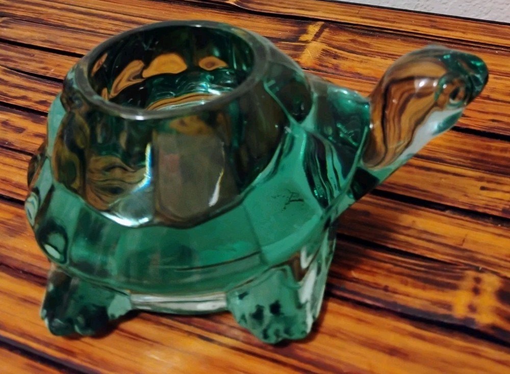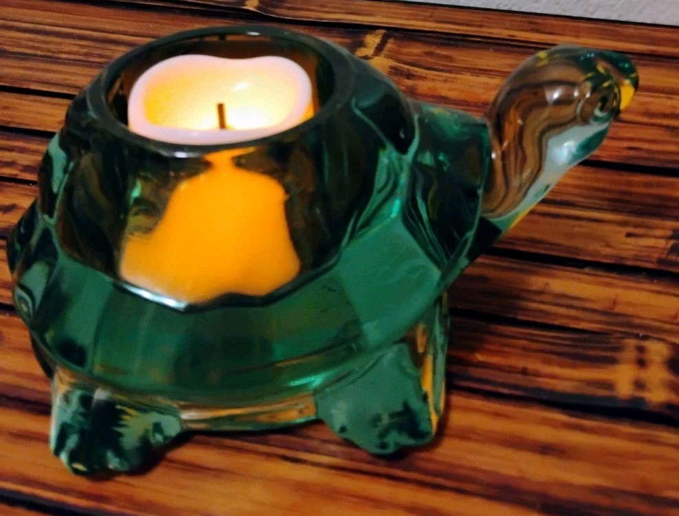 The Vintage Indiana Glass Turtle Green Spanish Tealight Votive Candle Holder is a unique and charming decorative collectible. Made of green glass with a Spanish style design, this candle holder features a turtle character design that adds a whimsical touch to any space. Perfect for adding a touch of vintage elegance to your home decor, this candle holder is a perfect addition for turtle enthusiasts or collectors of decorative glassware.