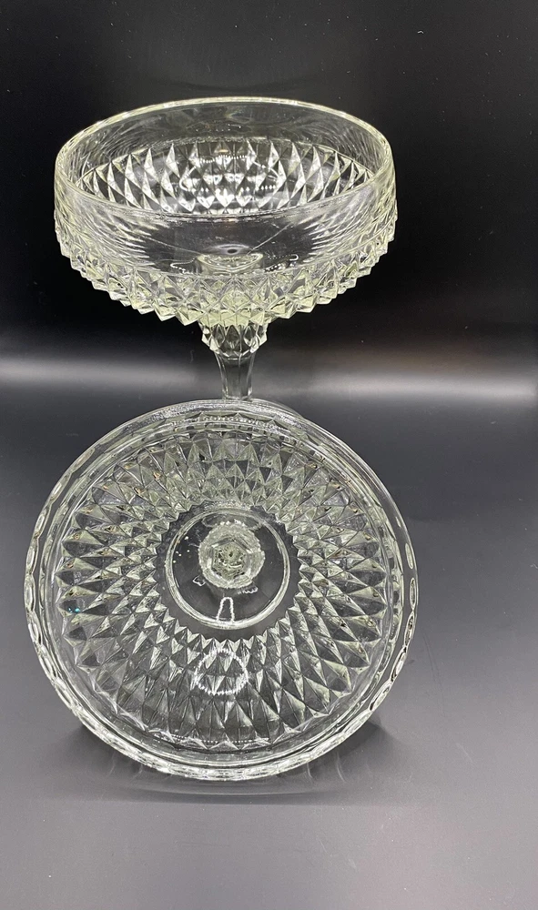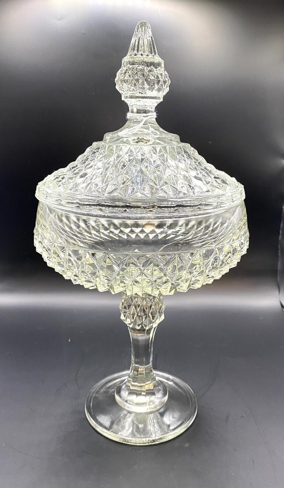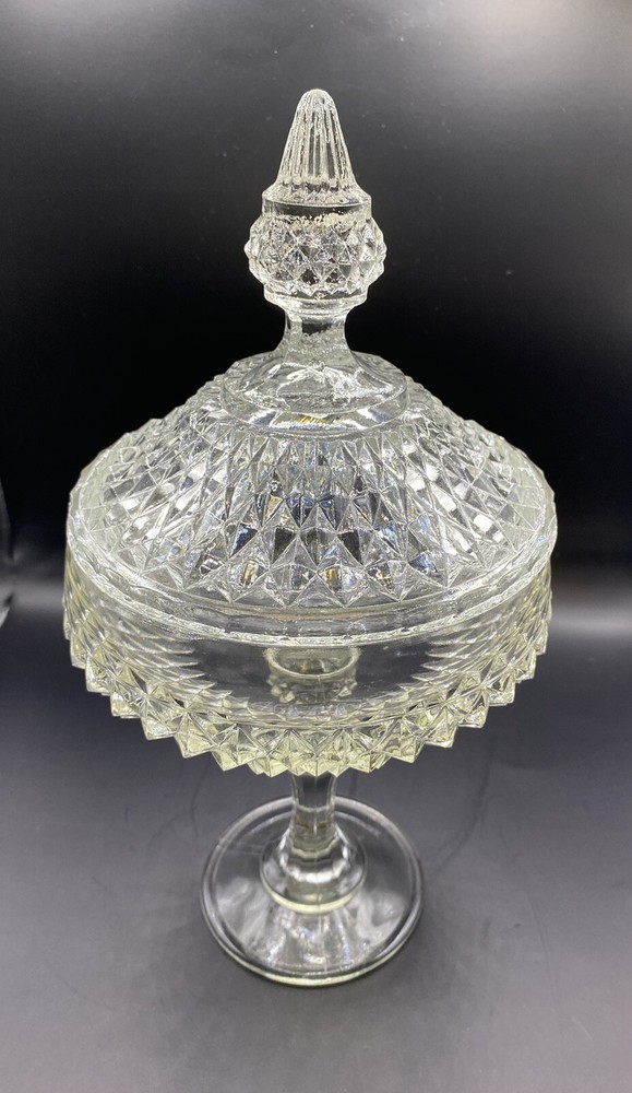 This vintage compote is a stunning piece that will add elegance to any occasion. Made by Indiana Glass, this cut glass crystal compote features a diamond point pattern and comes with a lid. The clear glass material gives it a timeless appeal, while the contemporary style makes it suitable for all occasions. The compote is 12'' tall and 6 1/2'' wide, with a weight of 3lb 2oz. It is recommended to hand wash only, and is perfect for decorative purposes. This antique item is a vintage original, and is ideal for collectors and enthusiasts alike.
