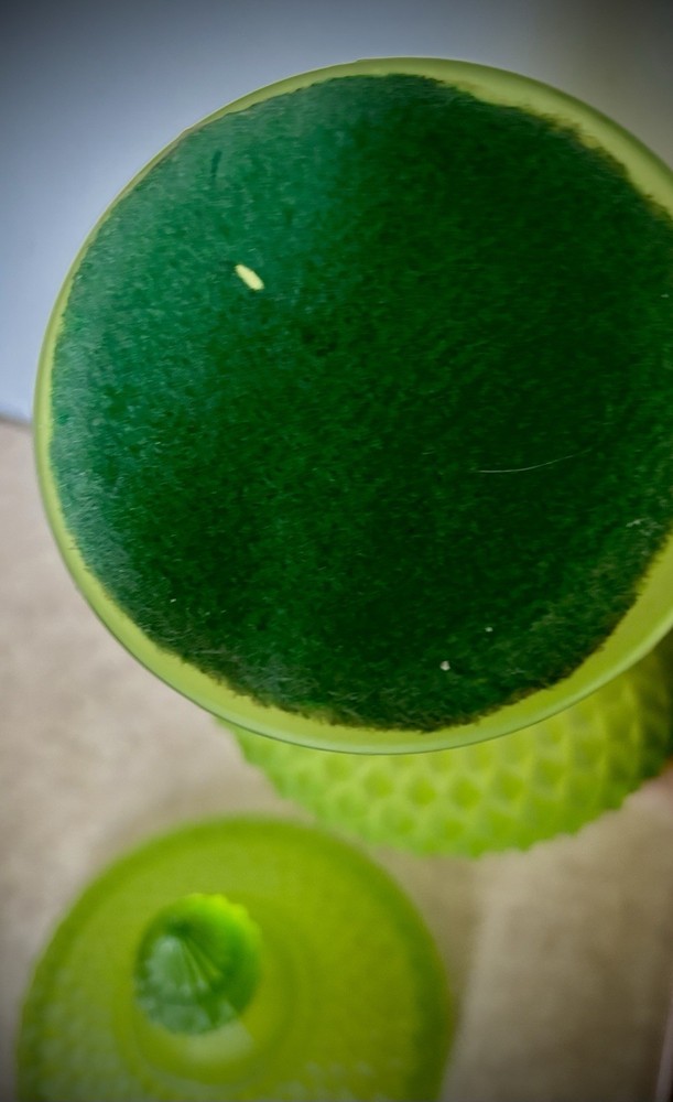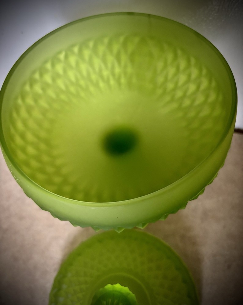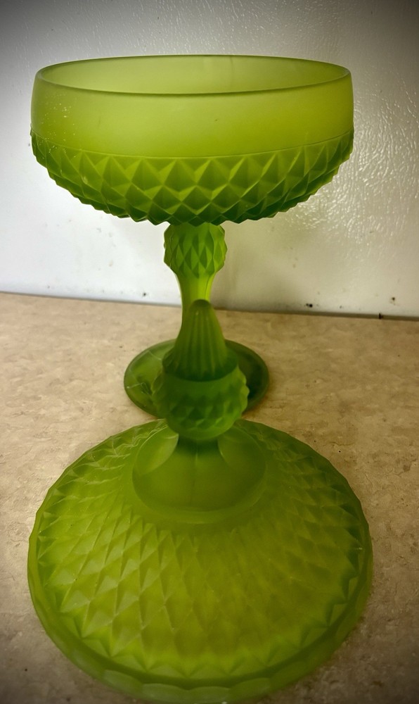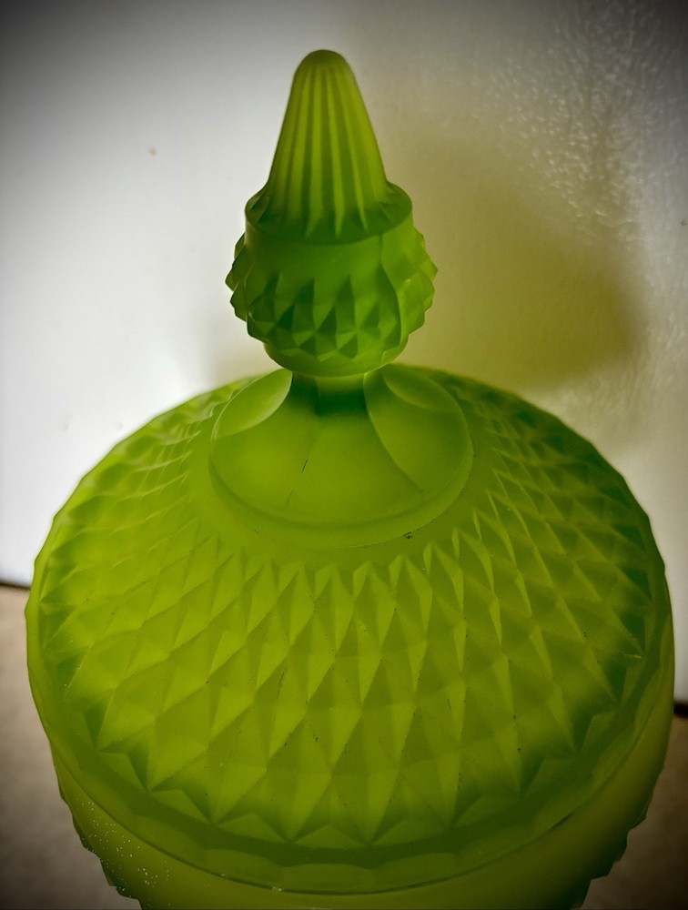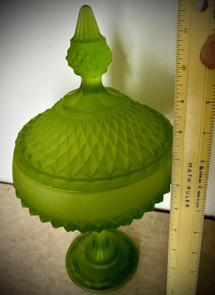 vintage Indiana Green Satin Glass Pedestal Candy Dish with a diamond point pattern, produced in the 1970s. • Material: Pressed satin glass. • Design: Diamond point pattern. • Style: Mid-Century Modern. • Features: ◦ Round dish with lid. ◦ Pedestal base. ◦ Frosted green (or green satin) finish. • Dimensions: Approximately 12 inches tall and 5-7/8 inches in diameter. • Era: 1960s-1970s. • Use: Suitable for storing and serving candies or as a decorative display piece. please note original owner applied a felt piece to the bottom of this piece to apparently protect the surface of where it sat
