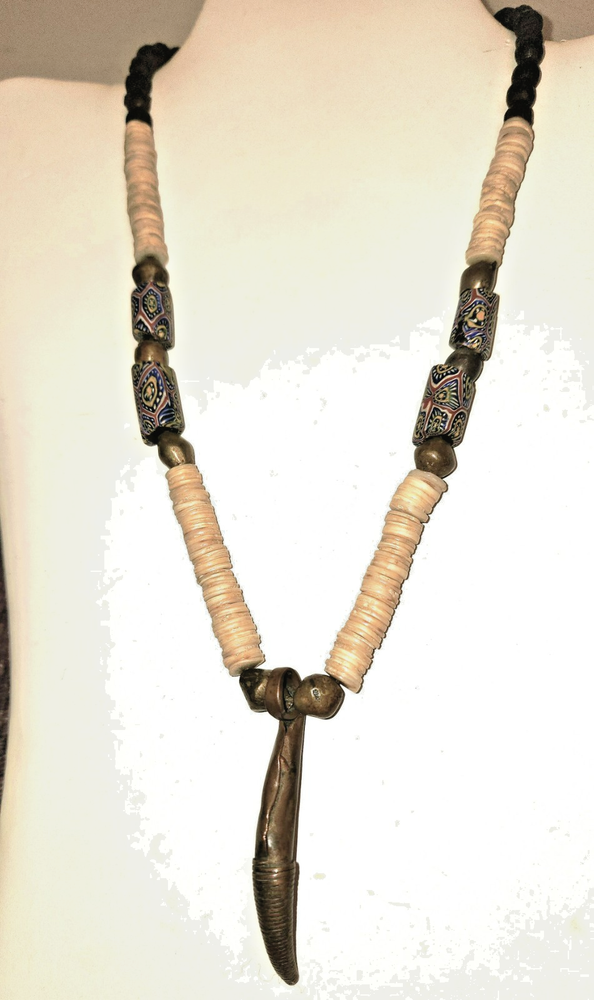 This necklace is a one of a kind, original vintage piece of jewelry that showcases rare Millefiori trade beads in a vibrant multicolor design along with handmade brass and bronze bicone beads and a centerpiece fertility amulet that drops 2 1/2 inches from the center of the 18 inch necklace. The necklace is crafted with shell disks, very intricate millefiori trade beads from Murano, and the handmade accents. The millefiori beads were made in a very intricate bundled fashion with deep blue, coal yellow, shite and brick red on black cores. The ends were ground to fit in a circlet and one has a chip. This was likely a Baule man's necklace - a standout piece of craftsmanship with a rich history and cultural significance. Ground Advantage; add other small things that I can fit in the same box and pay no extra for postage.
