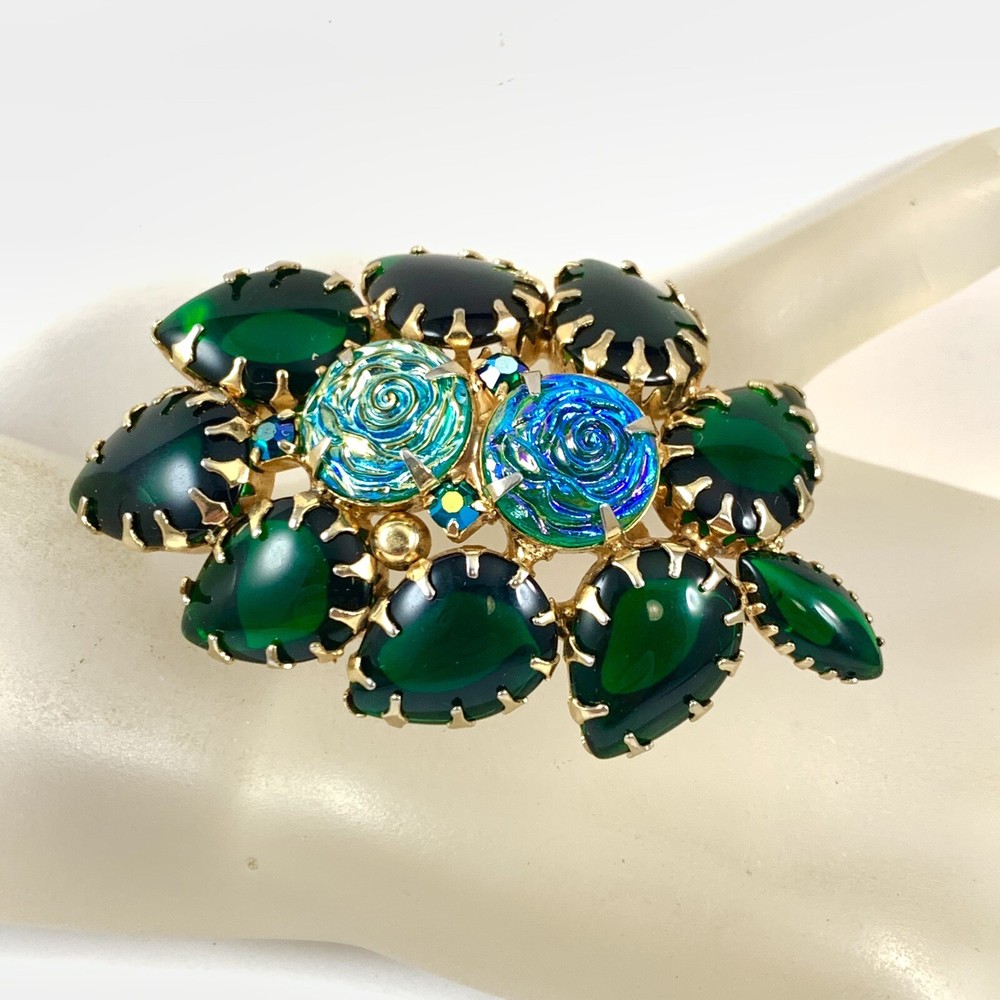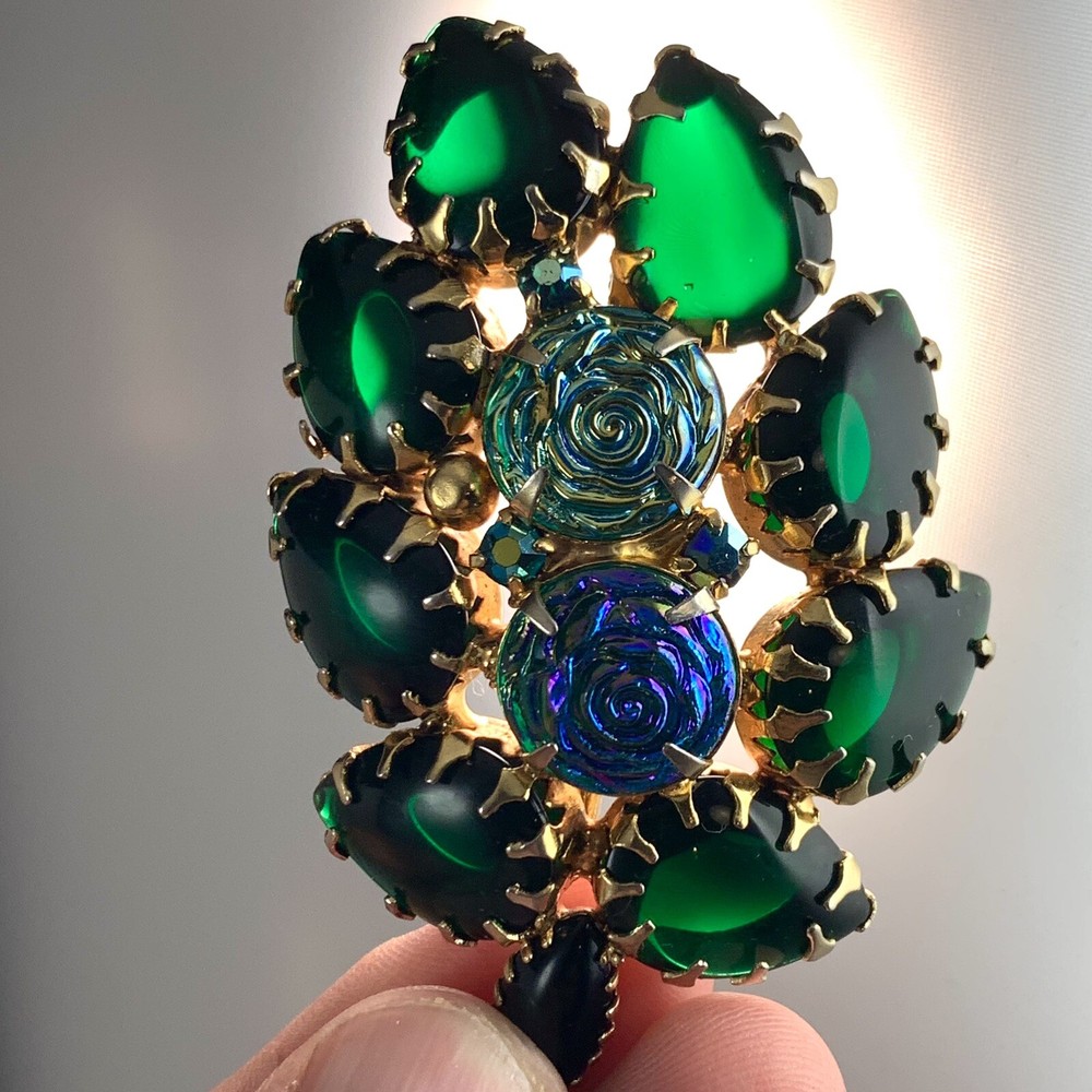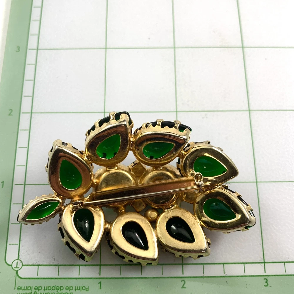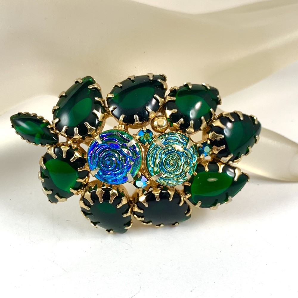 Stunning Vintage Green Glass Cabochons Iridescent Rosettes Gold Tone Brooch. Pre-Owned Estate Jewelry in Very Good Condition. Ready to wear, give as gift or add to a collection. Our Vintage items are mostly from estate sales and vary in age from 100+ years old to more modern pieces. Please use your judgement. Items are photographed on a measuring matte with one-inch squares to give you an idea of size. Any photography props / holders you see are not included.