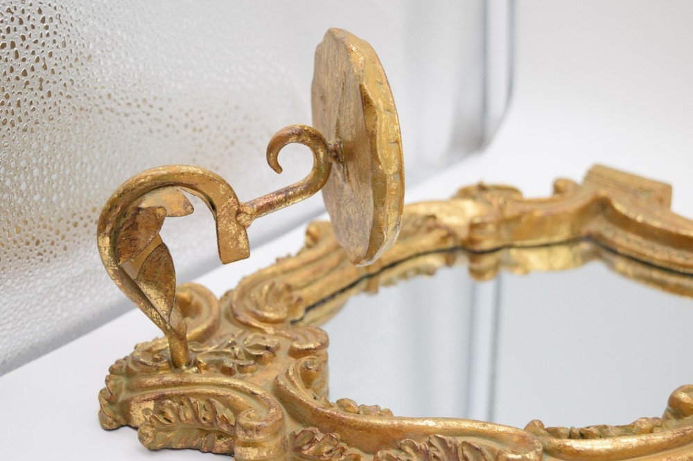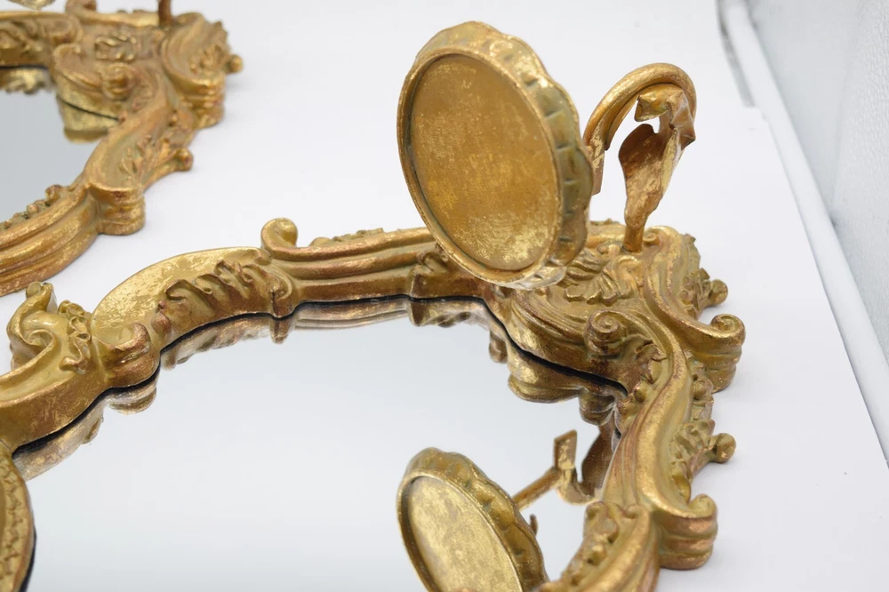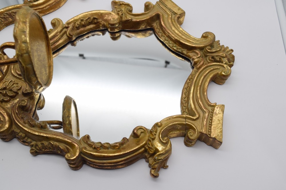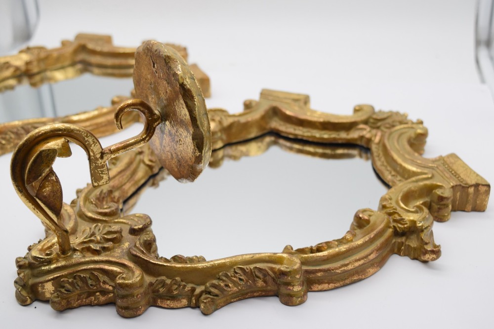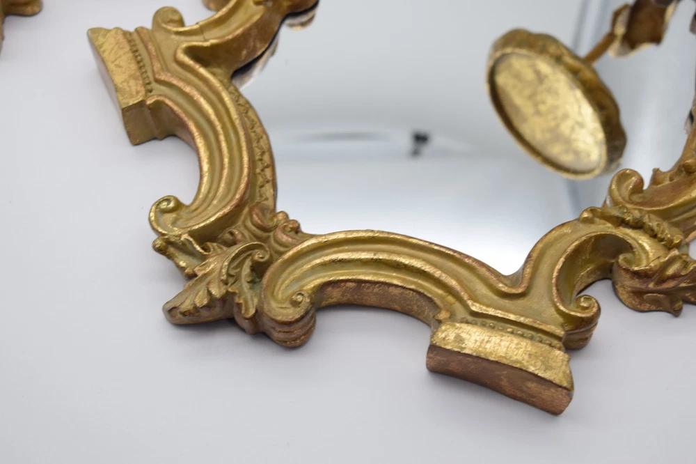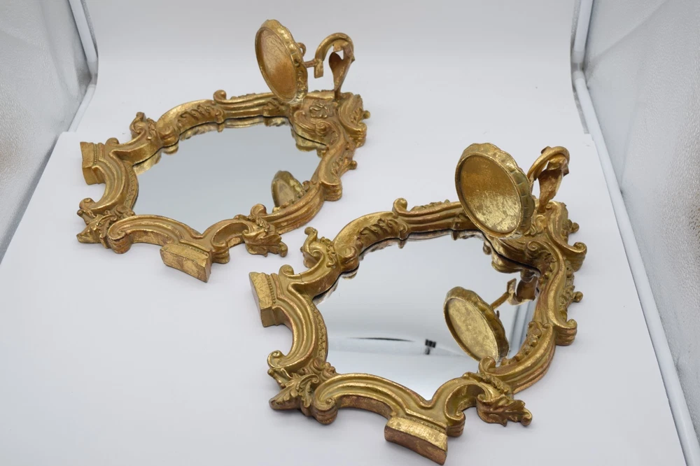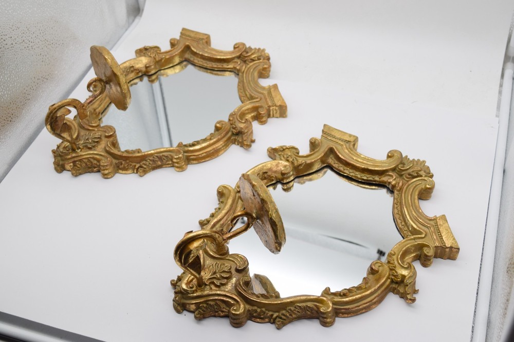 Striking vintage pair of Italian-style gilt gold wall mirror sconces featuring ornate baroque scrollwork and integrated candle holders. Highly decorative pieces with strong Hollywood Regency / vintage European aesthetic—perfect for wall decor, entryway, or accent lighting display. Mirror centers reflect beautifully and the sculptural frames give a high-end antique look. Brand: Unmarked Type: Wall Mirror Sconce Candle Holders (Pair) Material: Resin/Composite w Gilt Finish Style: Italian Baroque Hollywood Regency Mounting: Wall mount (hardware on back) Measurements: 14.5"x11.5" each Weight: approx 3 lb each Condition: Good vintage condition overall with visible wear to gilt finish including rubbing and patina. One piece has a noticeable crack in the frame (shown in photos) but remains structurally intact. Mirrors are in good shape with minor age wear. 📦 Shipping Information: We use eBay’s Calculated Shipping for all our items. Shipping costs are automatically determined by eBay based on the weight and dimensions of the package, as well as the buyer’s location relative to Connecticut . Please note, we do not control these rates and make no additional profit on shipping fees. Each piece weighs approximately 3 lb , and due to their size and careful packing requirements, the total shipping weight will be higher to ensure safe delivery.