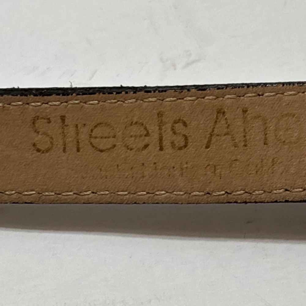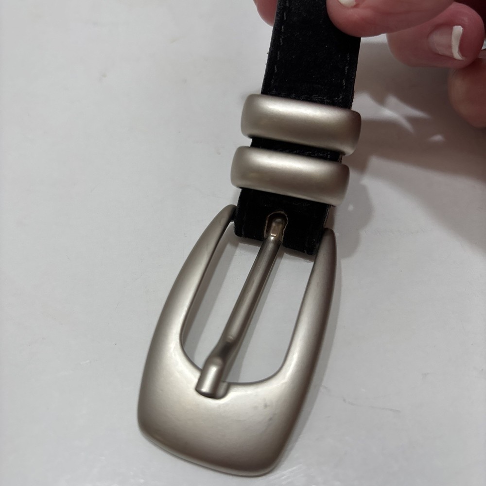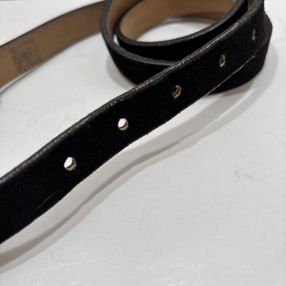 This vintage Italian suede leather belt from Streets Ahead is a stylish addition to any wardrobe. The solid black color, 1" belt width, and buckle accents give it a classic and timeless look. Made from high-quality leather with a European metal buckle, this size large belt is perfect for a waist size of 38-39 inches. Ideal for women who appreciate vintage fashion, this belt is a statement piece that adds a touch of sophistication to any outfit. Made in the United States, this belt is a durable and fashionable choice for everyday wear.