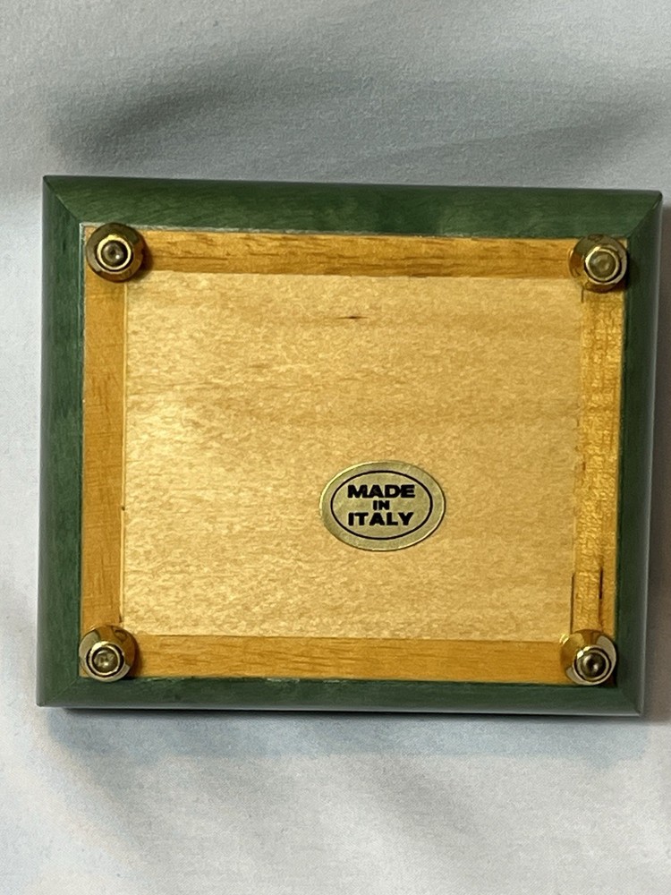 This Italian craftsmanship vintage suede wood jewelry box in emerald green with a poinsettia design exudes elegance and charm. The rectangular shape and Italian style make it a perfect addition to any room, suitable for all occasions. Handmade in the 1980s, this original piece from the keepsake boxes collection is a unique and timeless collectible. Care instructions recommend cleaning with a damp cloth, ensuring its longevity and preserving its beauty for years to come.