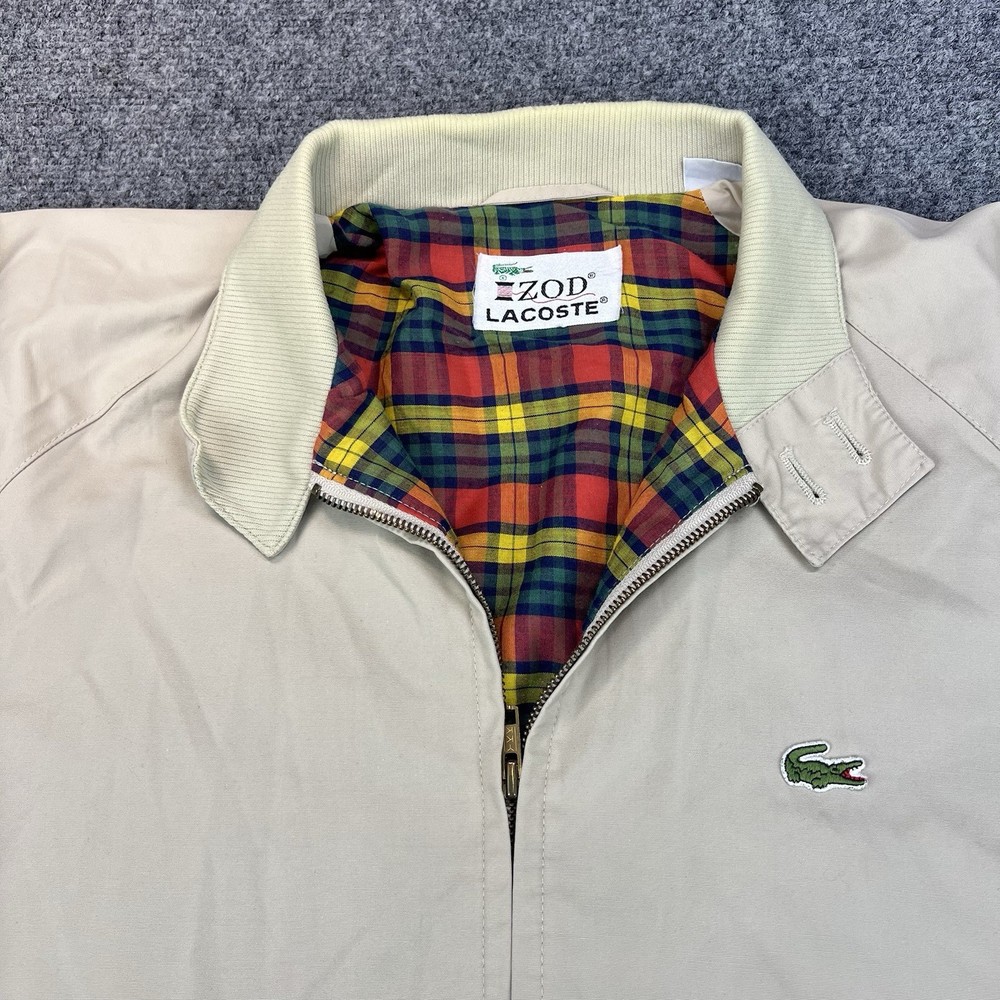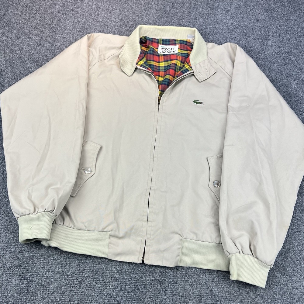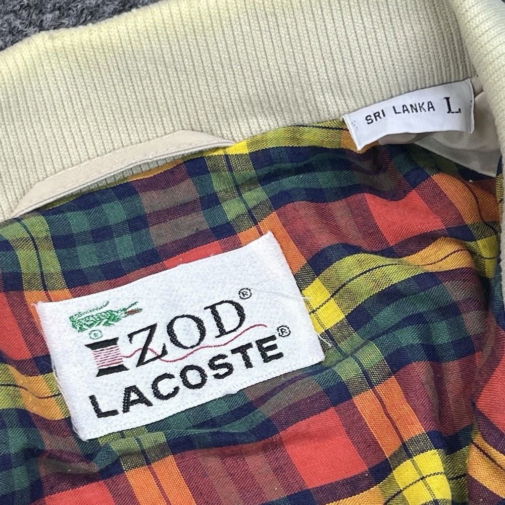 Size:LOccasion:CasualTheme:90sJacket/Coat Length:ShortBrand:LacosteStyle:Bomber JacketColor:BeigeClosure:ZipAccents:LogoSize Type:RegularOuter Shell Material:Cottongtin13:Do Not ApplyFeatures:LightweightModel:NADepartment:MenFit:RegularType:JacketCountry of Origin:Sri LankaPattern:SolidUPC:Do Not ApplyVintage:YesFabric Type:Softshell