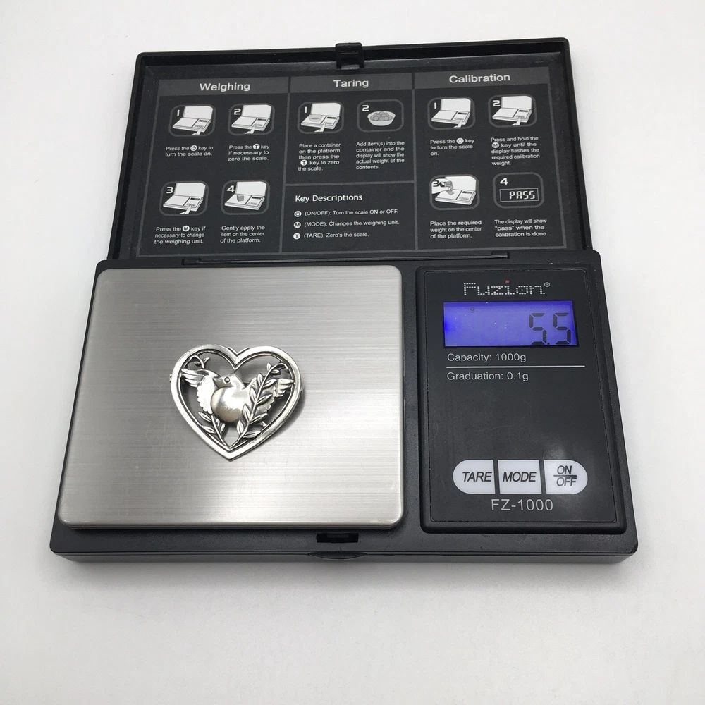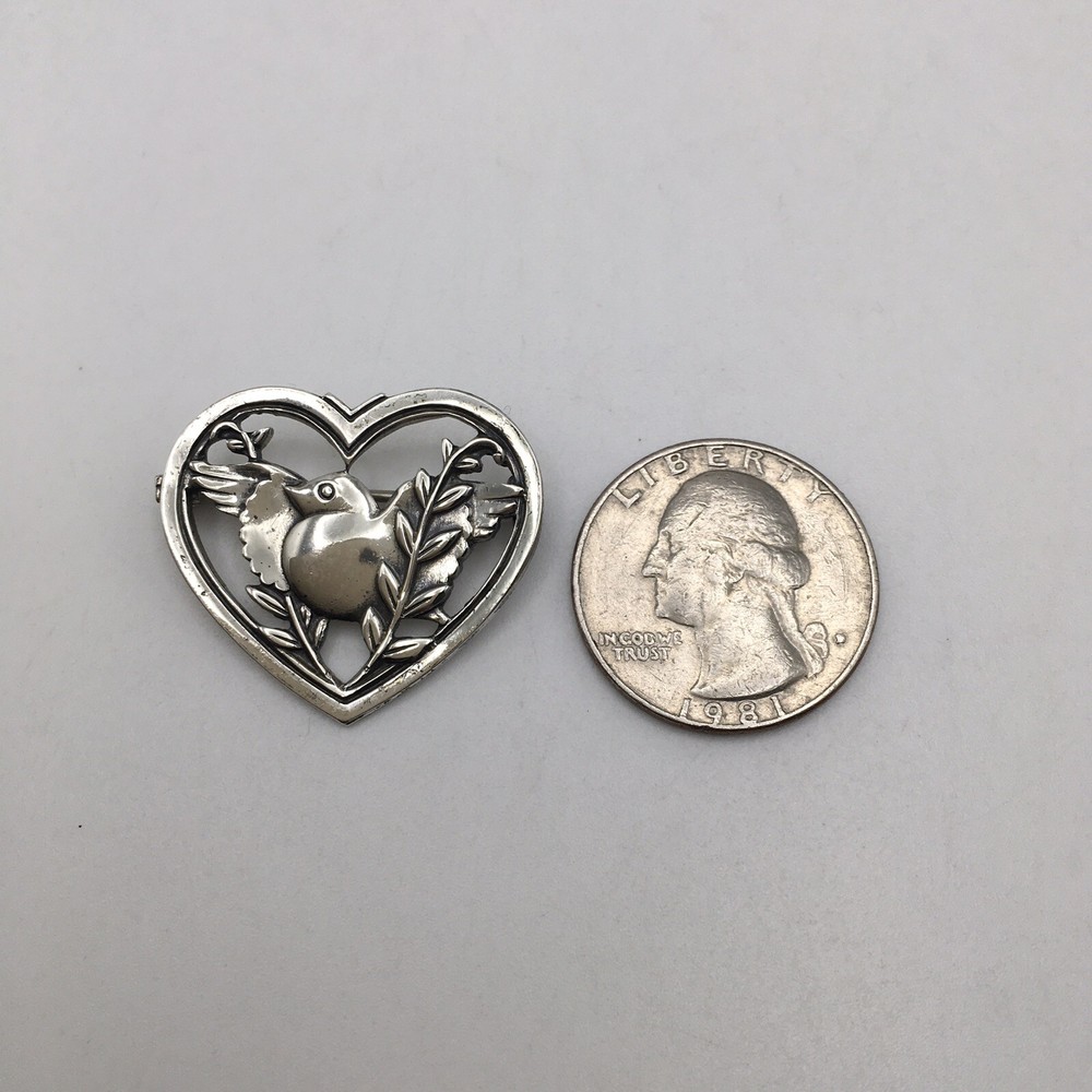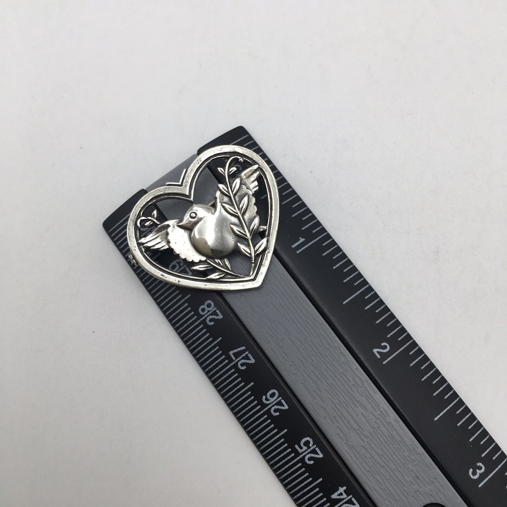 925 Sterling Silver Vintage Signed J Coro Bird with Peace Olive Branch in Heart Pin Broach #2878 Hand polished but this is a truly vintage piece and still holds tarnish and age. Measuring Tools not included. Combined Shipping! 1st item $4.59, each additional item is $1. Max shipping cost $10. Combine shipping for up to 7 days! We value YOU! Items are returnable and fully refundable! SilverSchark began as a hobby that grew into a business. We take old retired sterling silver jewelry and revitalize it to wearable condition. Utilizing an ultrasonic machine with sterling silver solution most items are restored to their original beauty. Occasionally scratches are buffed out and some minor repairs are made to bring these tired pieces back to life. Diamonds are always tested. If a piece is not stamped or is suspected of not being sterling silver, the item is acid tested for confirmation. Tests will always be listed in the description. We understand that patina is desired on vintage or antique items so some of the listings will not be cleaned and polished. The description of each listing will tell its tale of restoration. Combined shipping is always welcome! Just ask for an invoice if your cart doesn't look correct. Max shipping cost is $10 per shipment regardless of number of items!