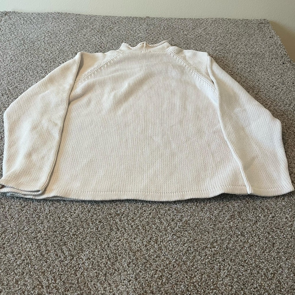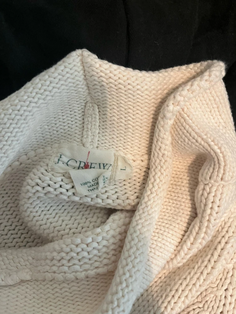 The Vintage J Crew Oarsmen Sweater in men's large ivory features a classic roll neck design with a chunky-knit fisherman's style. Made from breathable cotton fabric, this pullover sweater is perfect for travel, casual wear, or work. The sweater's nautical theme and 90s preppy style make it a timeless addition to any wardrobe, suitable for all seasons and outdoor activities like walking, golf, or hiking. The heavyweight knit construction ensures warmth and comfort, while the collarless design adds a modern touch to this vintage piece from J.CREW.