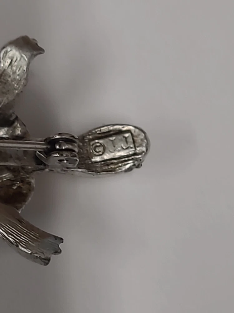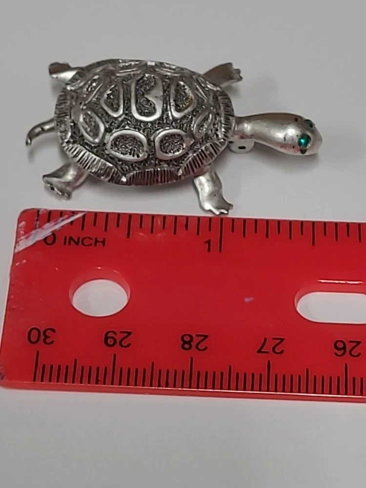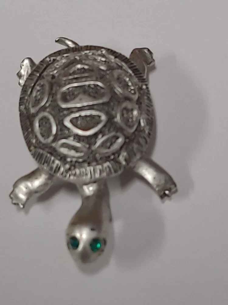 This vintage brooch from J&J features a charming turtle design with green rhinestone eyes. The silvertone metal adds a touch of elegance to any outfit. It is signed by the designer and is ideal for special occasions such as Christmas, anniversaries and birthdays. The piece is perfect for collectors of vintage and antique jewelry, with its unique animal and insect theme.