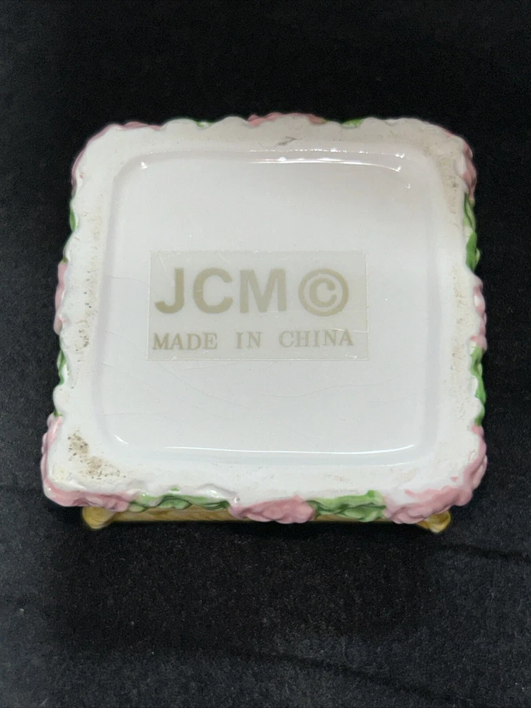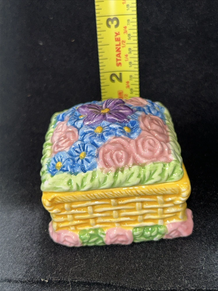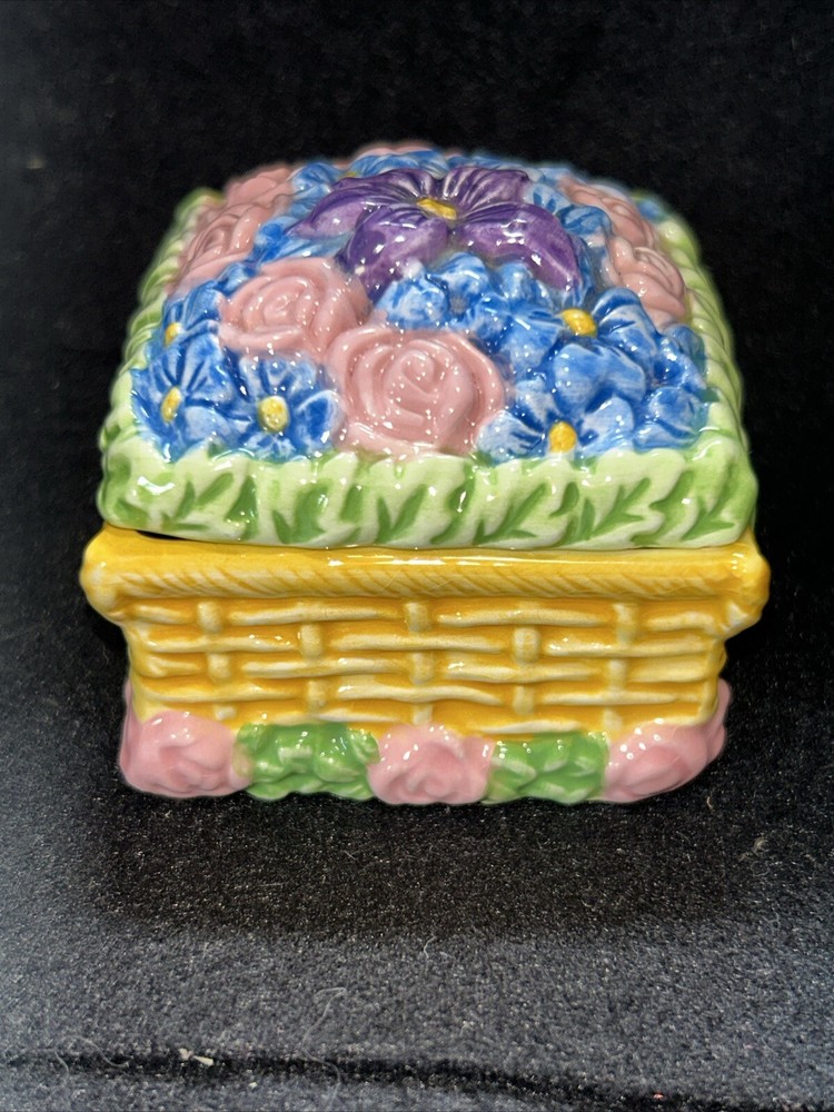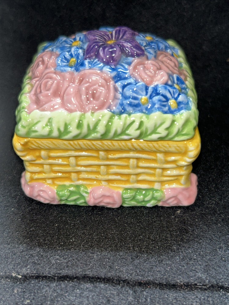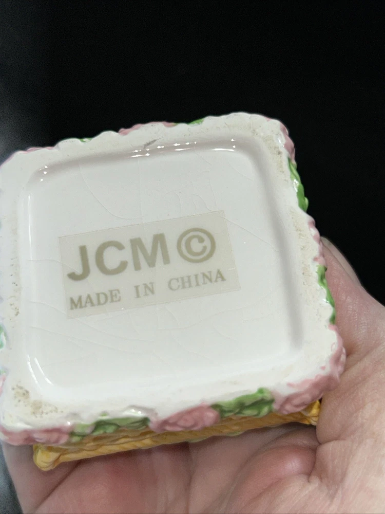 This vintage small square flower basket trinket box by JMC is a charming and delicate porcelain piece that serves as a perfect gift for teens and adults alike. The multicolor flower pattern and spring-themed design make it a lovely addition to any collection of decorative keepsake boxes. The square shape and small size of the trinket box make it a unique and eye-catching piece, while the JMC brand adds a touch of authenticity and quality to the product. Made in China, this boxed trinket box is a lovely way to store small treasures or jewelry. Has a little crazing on bottom as seen in pictures, no chips or cracks.