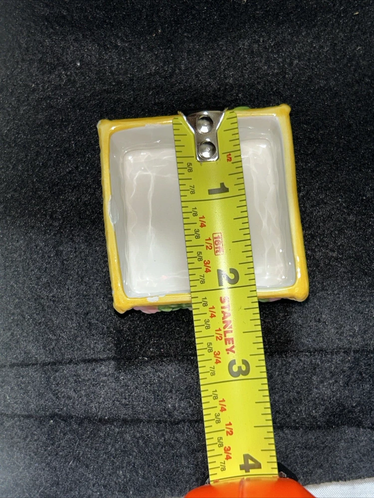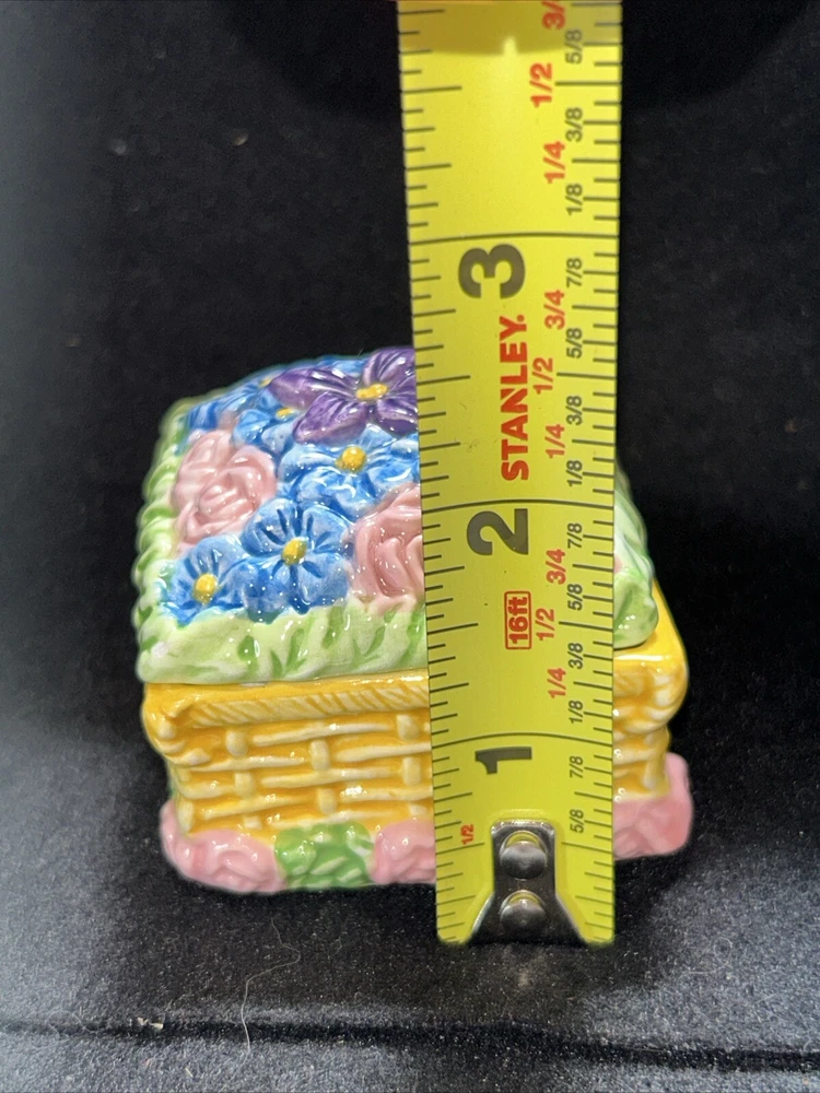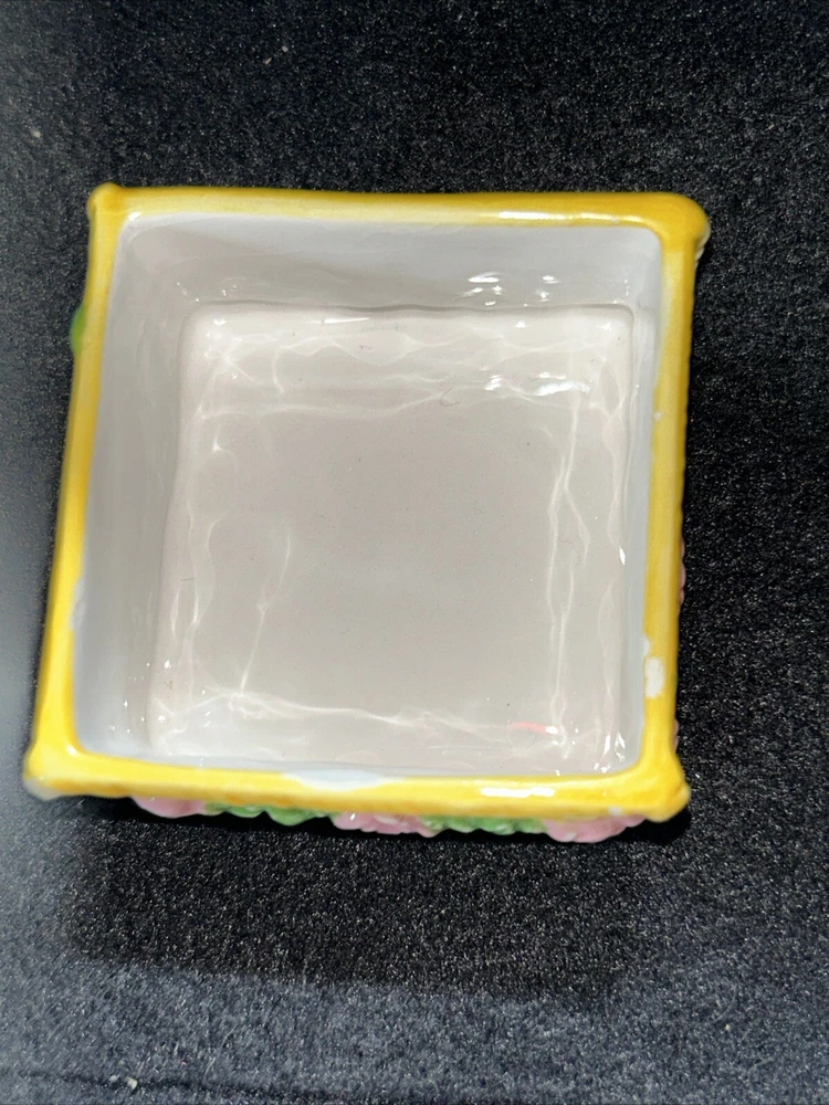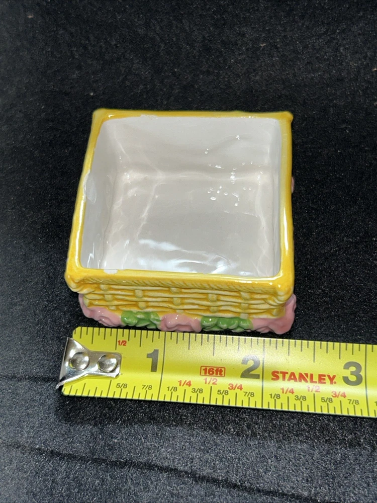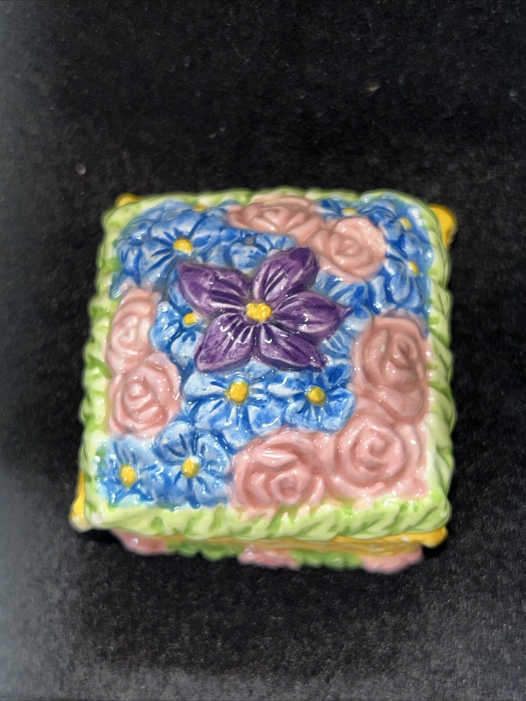 This vintage small square flower basket trinket box by JMC is a charming and delicate porcelain piece that serves as a perfect gift for teens and adults alike. The multicolor flower pattern and spring-themed design make it a lovely addition to any collection of decorative keepsake boxes. The square shape and small size of the trinket box make it a unique and eye-catching piece, while the JMC brand adds a touch of authenticity and quality to the product. Made in China, this boxed trinket box is a lovely way to store small treasures or jewelry. Has a little crazing on bottom as seen in pictures, no chips or cracks.