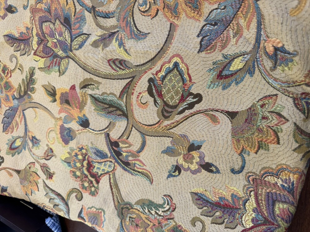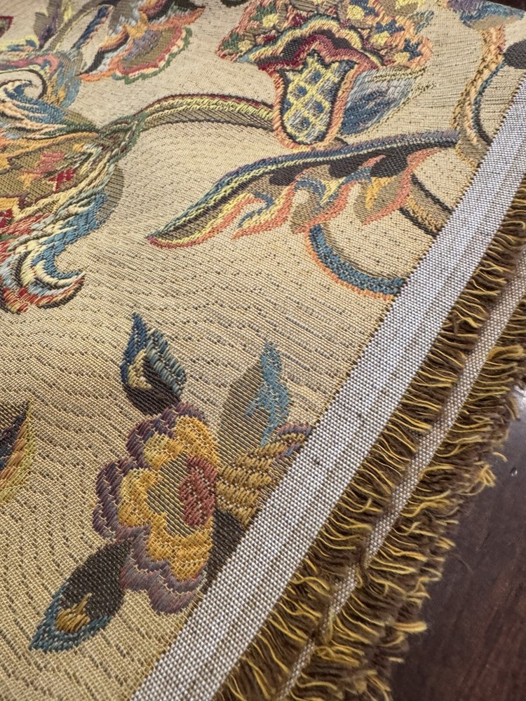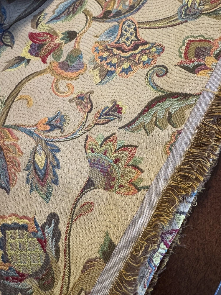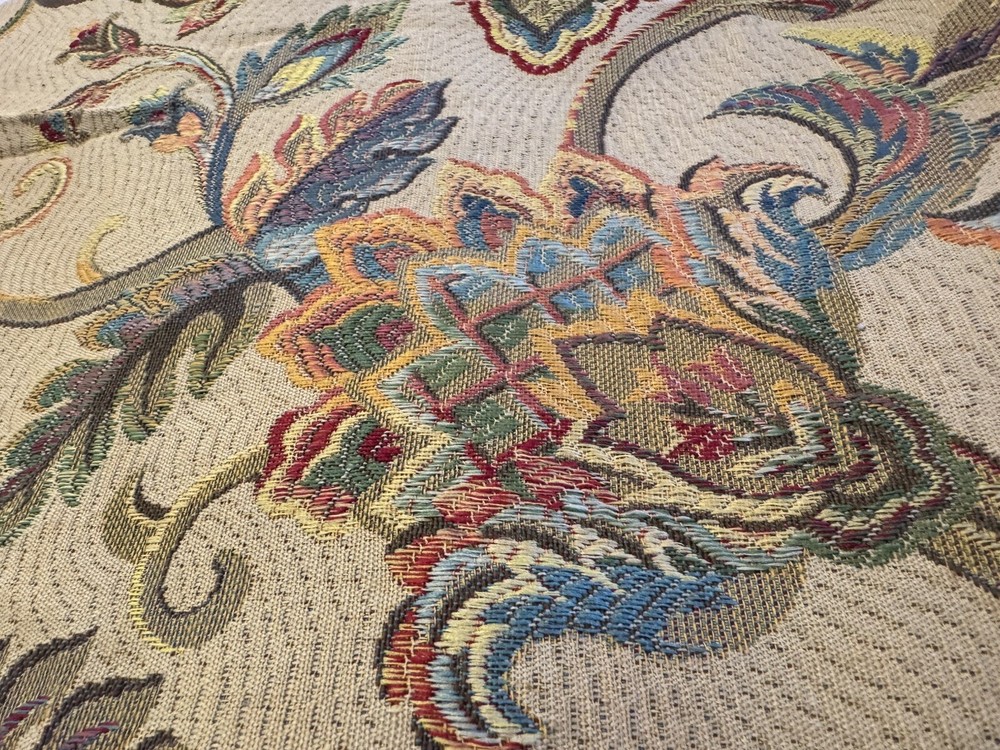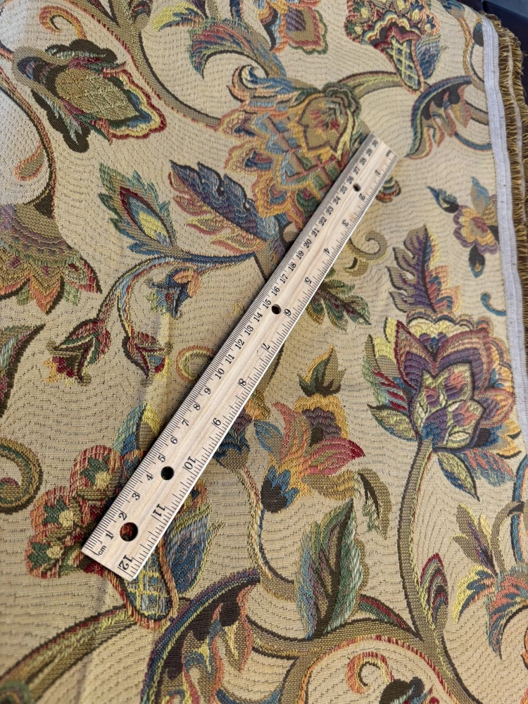 This vintage Jacobean floral upholstery fabric is a classic piece with an antique vibe, perfect for Victorian cottage interiors. The heavy fabric features a multicolor floral pattern, adding a touch of botanical charm to any space. Measuring 90 x 55 W inches, this original United States-made fabric is ideal for various occasions and exudes a timeless style that will enhance the aesthetic of any room. Please see all photos Smoke Free Home ALWAYS happy to COMBINE for SHIPPING SAVINGS$$$