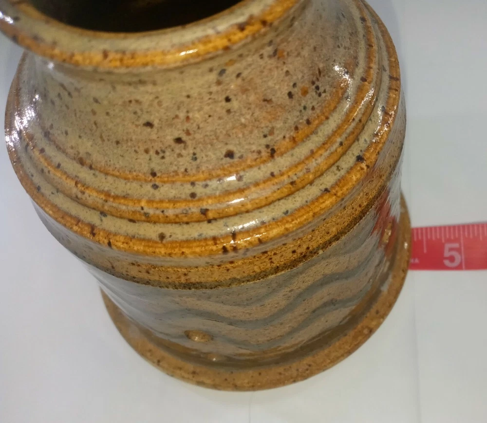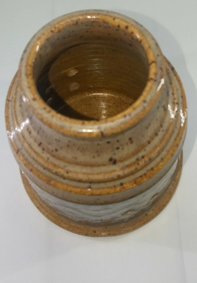 Material: Stoneware Brand: Handmade Model: Tie Light Holder Origin: United States Product Line: Janice Rowell Theme: Stones Pattern: Abstract Country/Region of Manufacture: United States Time Period Manufactured: 1970-1979 MPN: NA Backstamp: Impressed Production Technique: Pottery Style: Arts & Crafts/Mission Style Subject: Sand Production Style: Art Pottery Color: Brown Type: Vase Features: Decorative, Etched