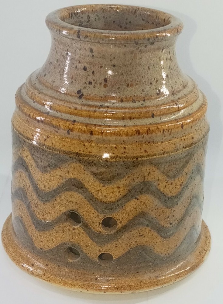 Janice Rowell Mid Century Sand Stone Pottery Sage Burner or Tie Light Holder. I had a very hard time finding anything about this pottery artist. It has a diamond shape pierced element all the way around the vase. I think it can be used to burn incense or sage. There is no damage to this stunning statement piece. If you have any questions, please message me back on eBay messenger. Thank you for reading this post from Foxy Stang Upcycler Store. 🦊 Have A Wonderful Foxy Stang Day!!!🦊