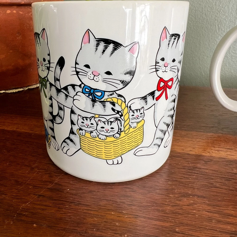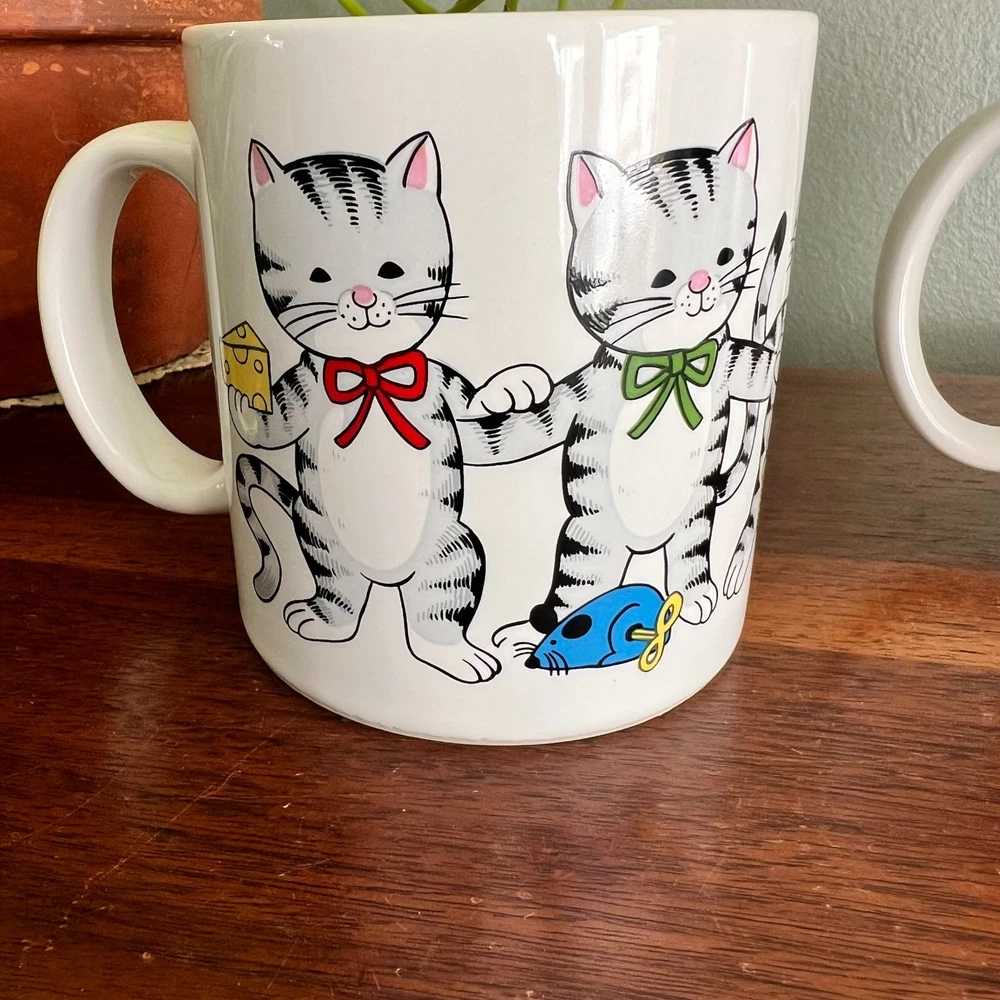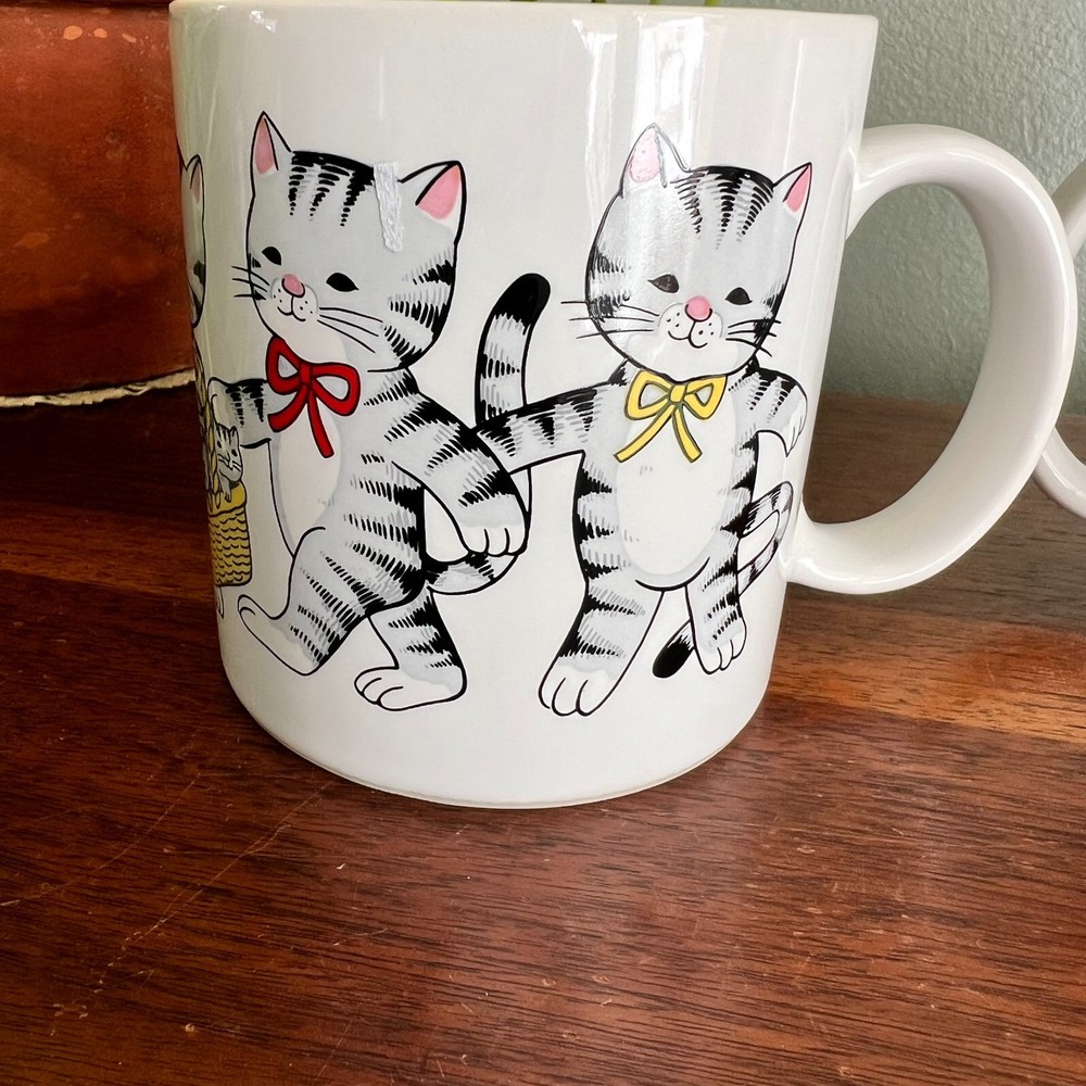 Adorable pair of vintage ceramic cat mugs made in Japan featuring playful gray tabby kittens with colorful bows and whimsical scenes. These mugs have a cheerful, nostalgic style that fits perfectly in a cottage kitchen, coffee bar, or cat-lover collection. Both mugs are sturdy and comfortable to hold, ideal for daily coffee or tea. Good vintage condition with light signs of normal use. No chips or cracks observed. Bottoms are marked "Japan."