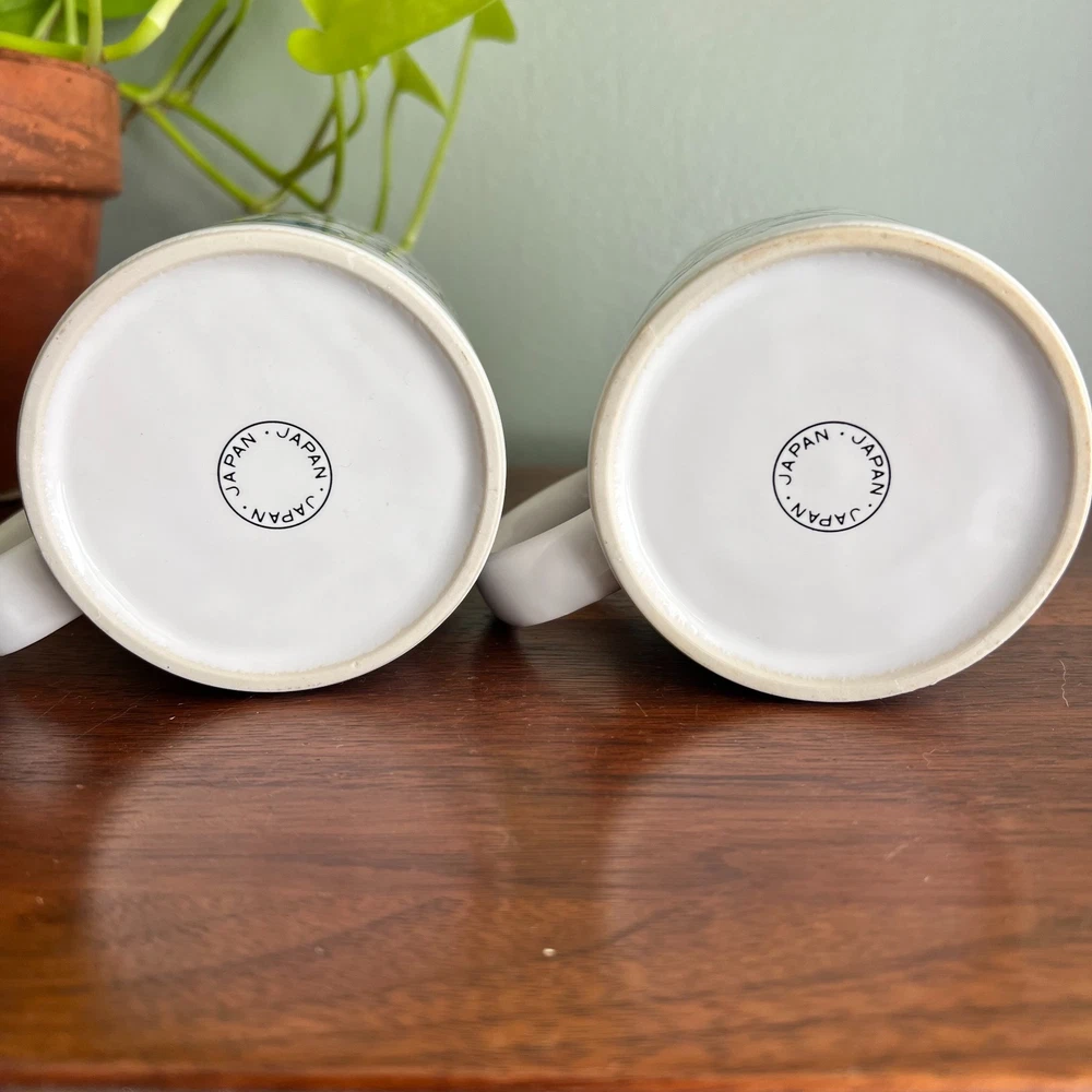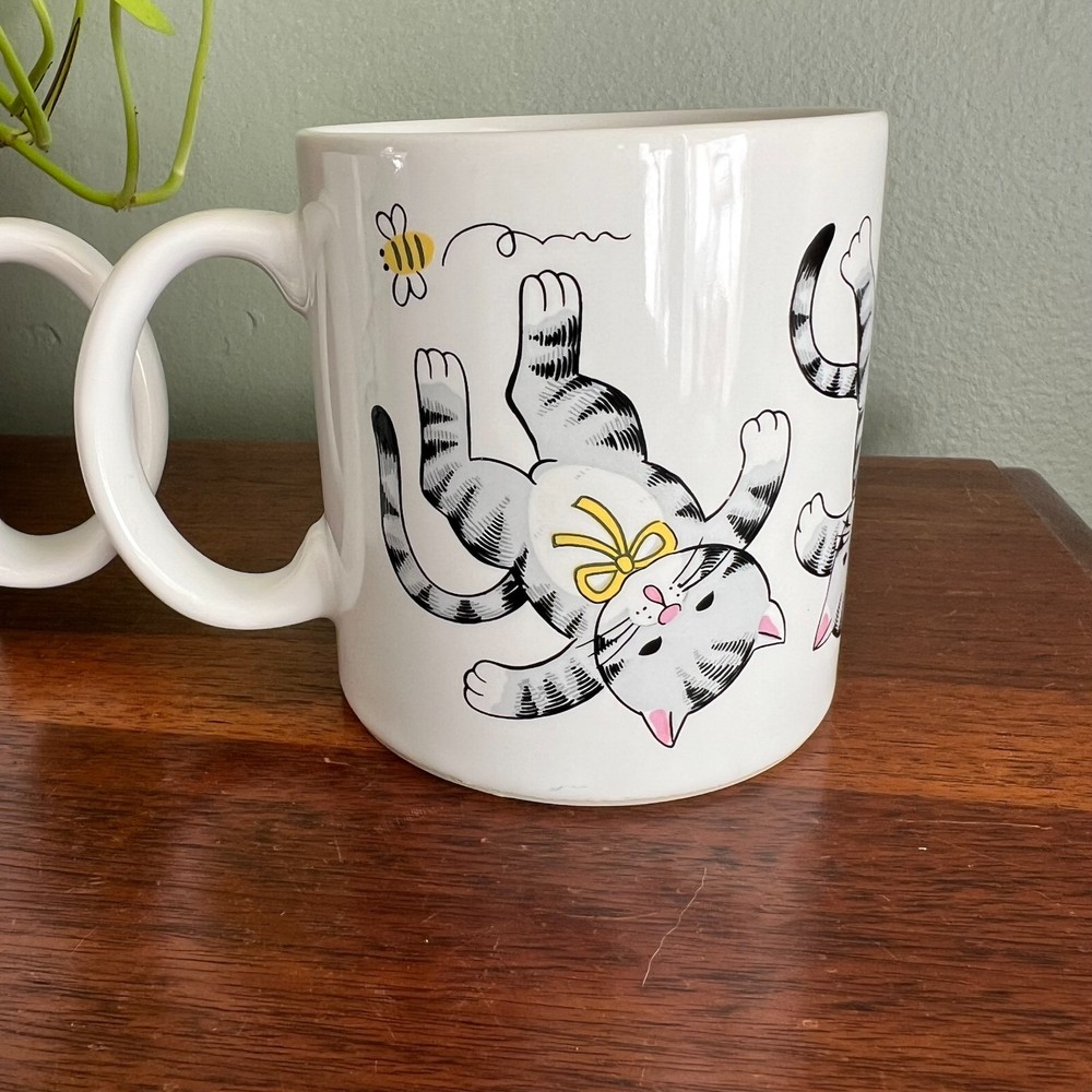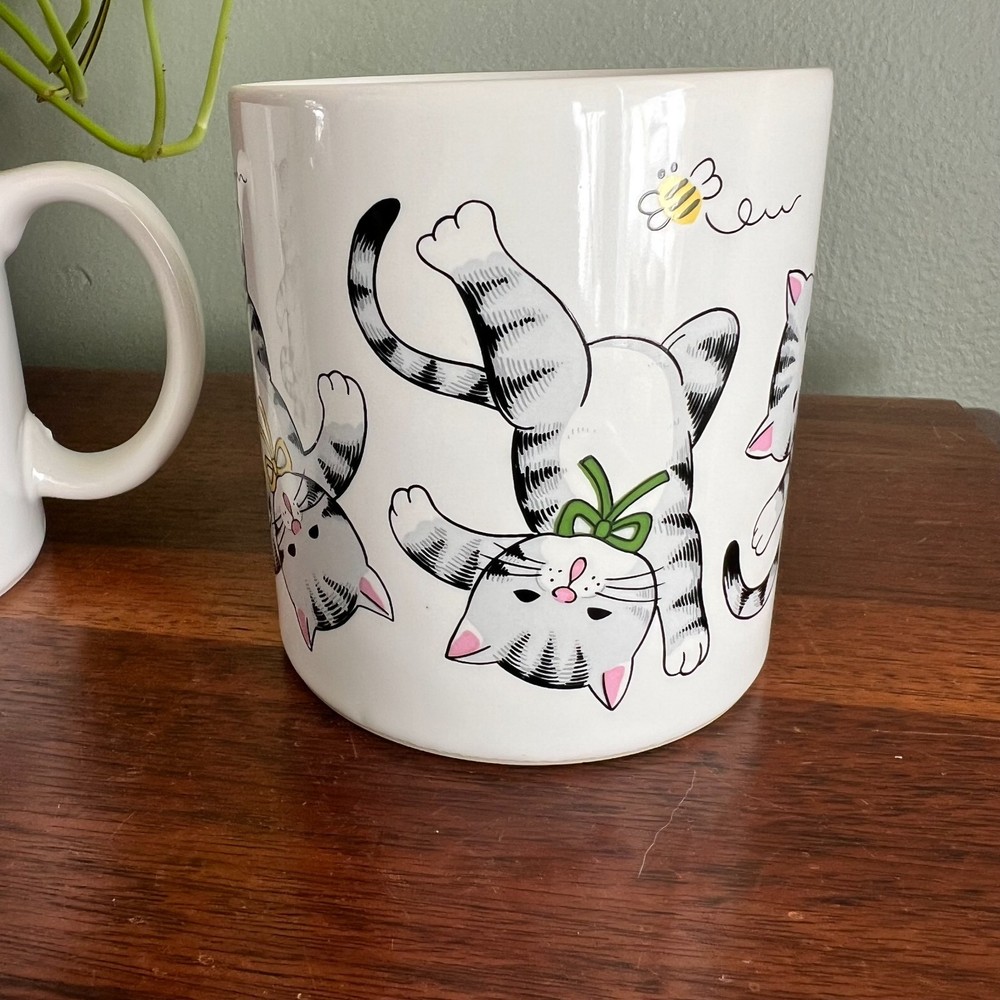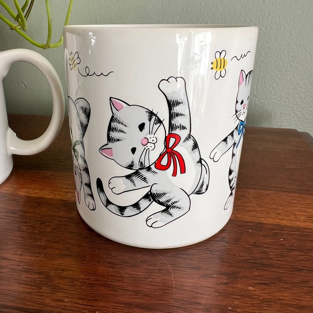 Adorable pair of vintage ceramic cat mugs made in Japan featuring playful gray tabby kittens with colorful bows and whimsical scenes. These mugs have a cheerful, nostalgic style that fits perfectly in a cottage kitchen, coffee bar, or cat-lover collection. Both mugs are sturdy and comfortable to hold, ideal for daily coffee or tea. Good vintage condition with light signs of normal use. No chips or cracks observed. Bottoms are marked "Japan."