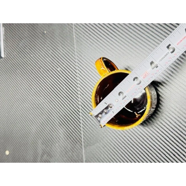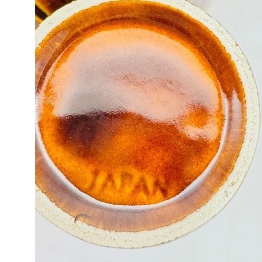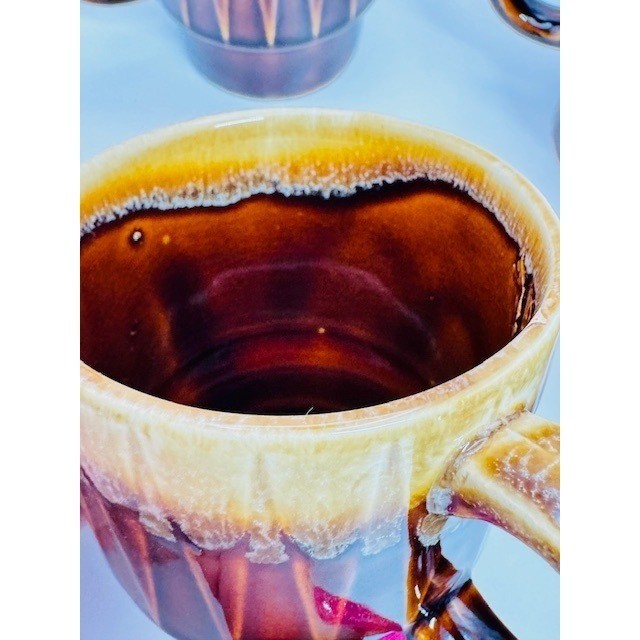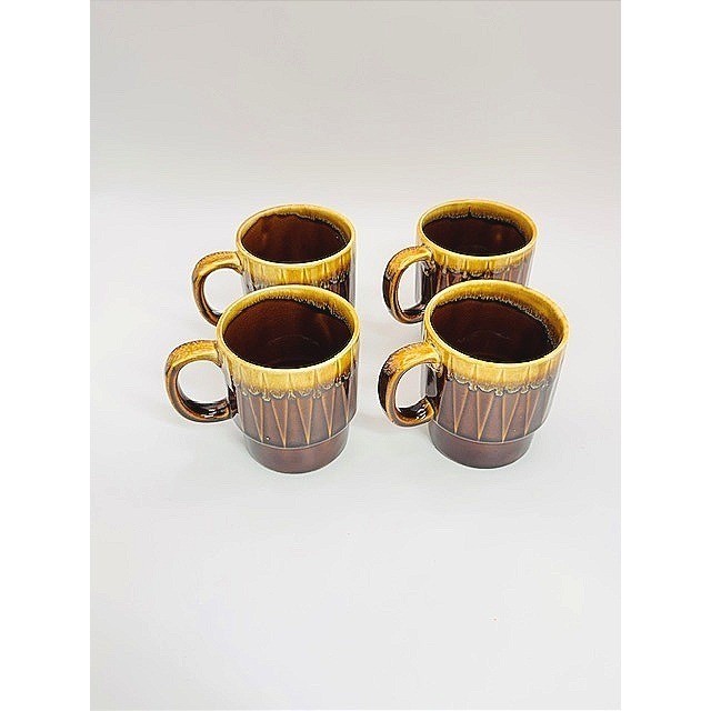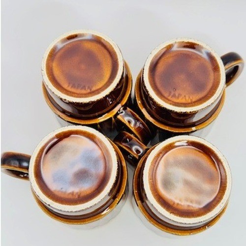 Vintage drip glaze coffee mugs in a rich brown and ochre color palette, crafted in Japan. These mid-century modern style mugs feature a textured, geometric relief pattern around the base and a classic glossy drip glaze along the rim. The stackable design makes them practical for storage while adding a retro aesthetic to any kitchen or coffee bar. Each piece is marked "Japan" on the bottom, showcasing quality vintage stoneware craftsmanship. Measurements: • Height: 4" • Rim Diameter: 3" • Total Weight (Set of 4): 3lb 11.4oz