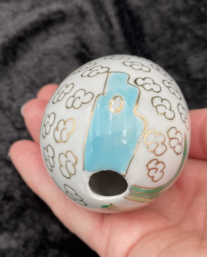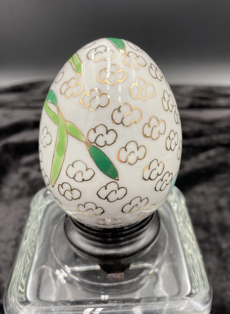 This vintage Japanese porcelain egg is a beautiful addition to any collection. The egg is hand-painted with delicate purple irises, green leaves, and a lovely floating butterfy, all surrounded by, and highlighted with, gold gilt. The egg stands at 2.7 inches tall and measures 2.1 inches in width. The egg comes with a wooden three-footed stand, adding to its charm and ease of display. Its weight is 3.2 ounces with the stand, making it easy to move and display in any room of your home. This is a beautiful egg in excellent condition. There are no chips, cracks or signs of wear. I have another egg of similar design, but with pink lotus flowers. If you would like both, I am happy to combine shipping and give you the savings. Please see my listing at 2cuddlebugs24. Thank you!