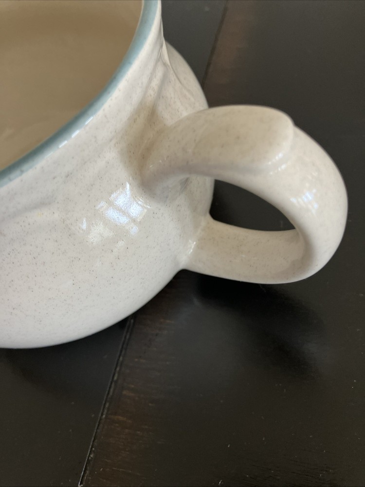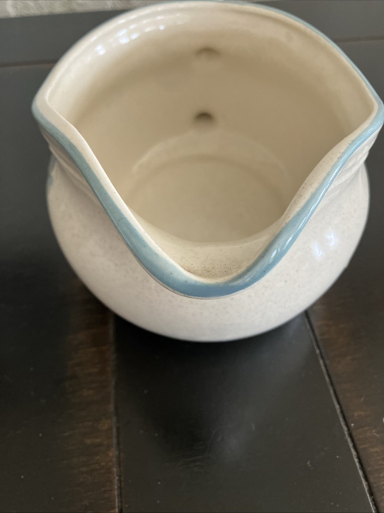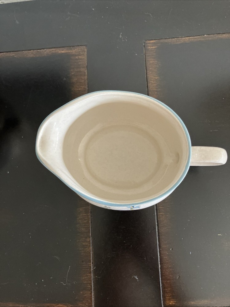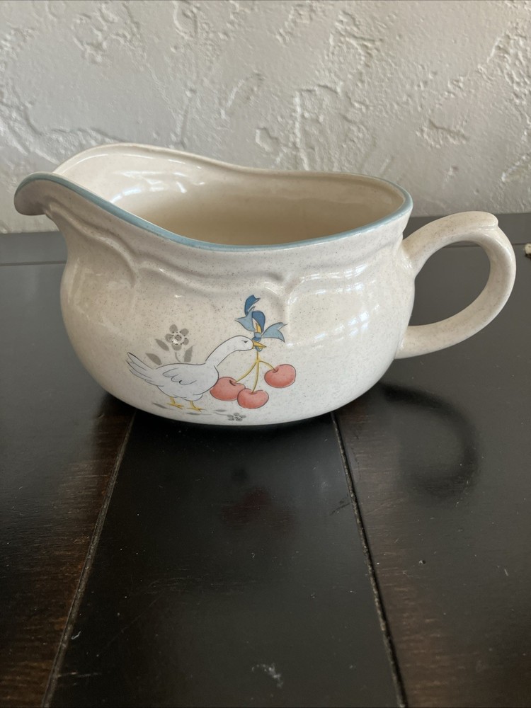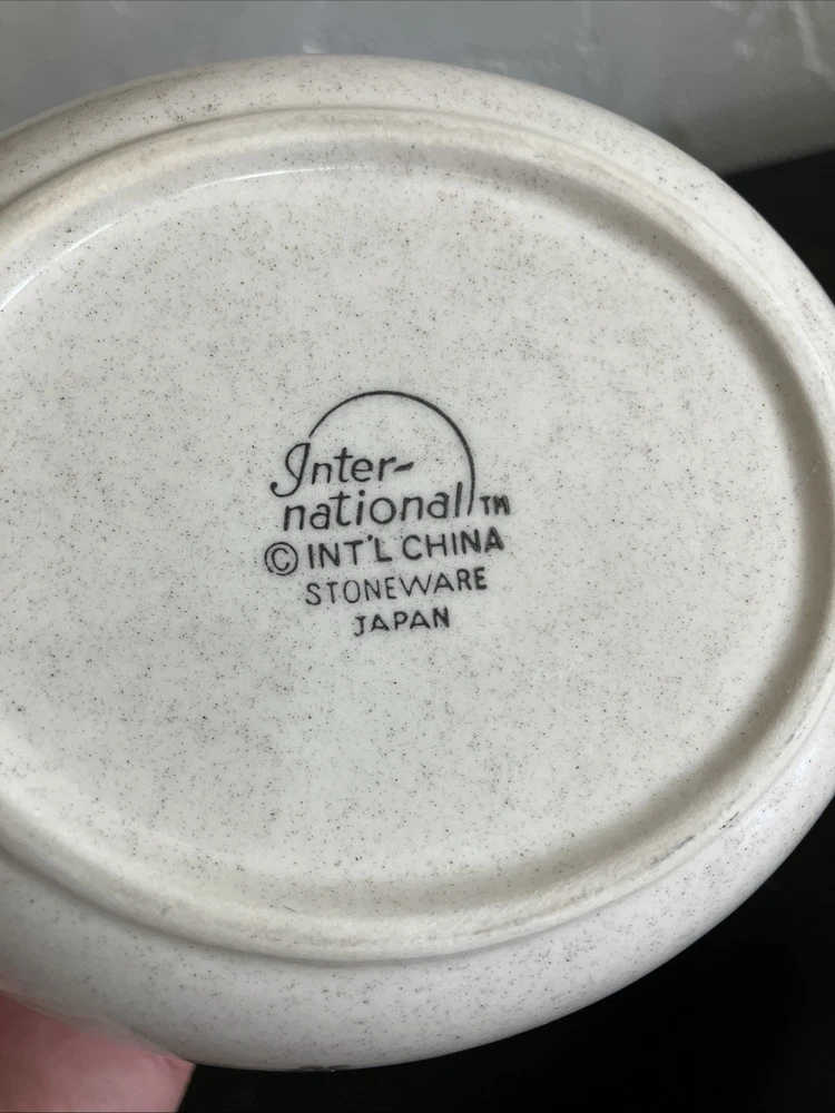 This vintage gravy boat from International China is a charming addition to any collection. Made from stoneware and originally manufactured in Japan, this piece features a lovely Marmalade pattern with a white background and blue trim. The boat is in great shape and ready to be displayed or used for its intended purpose.