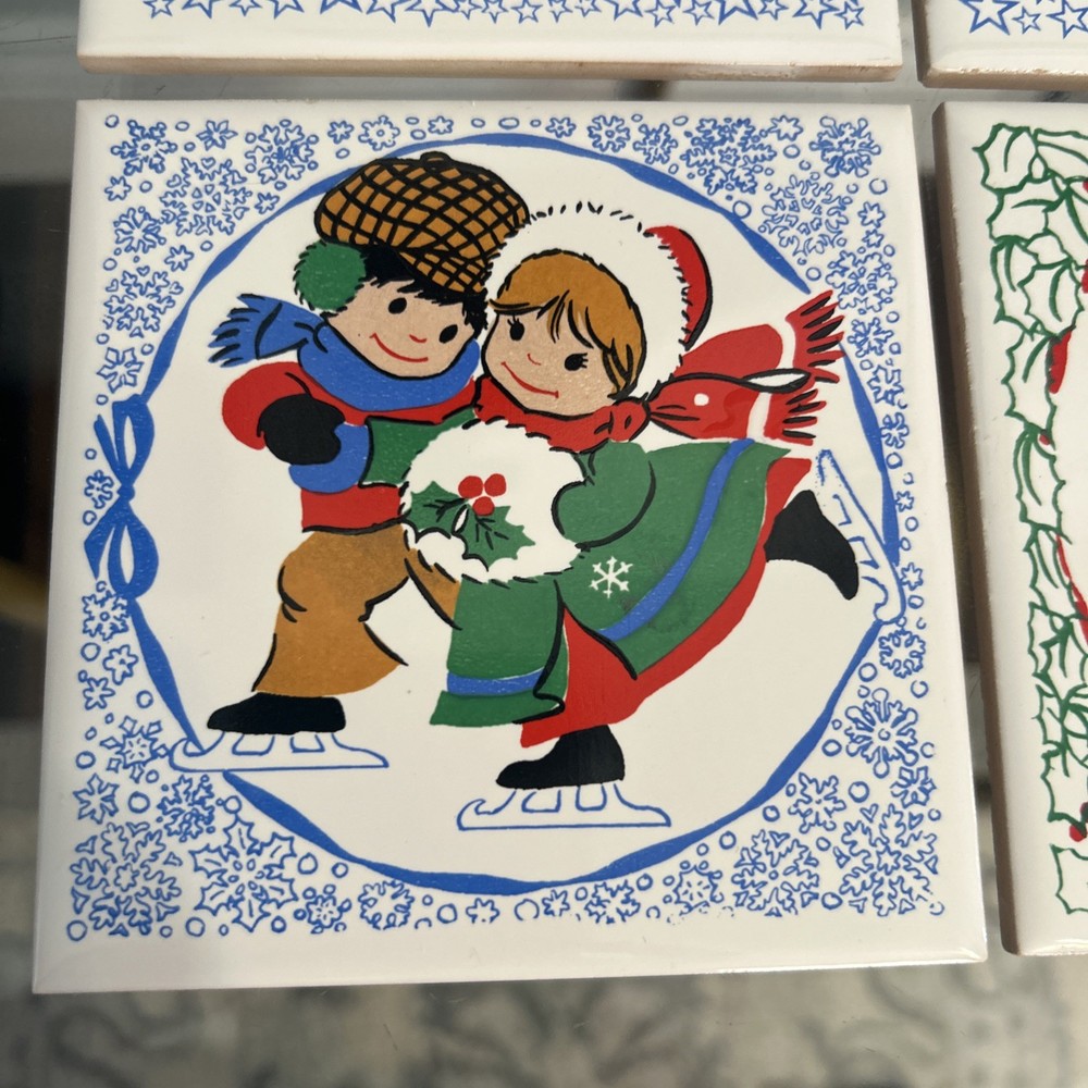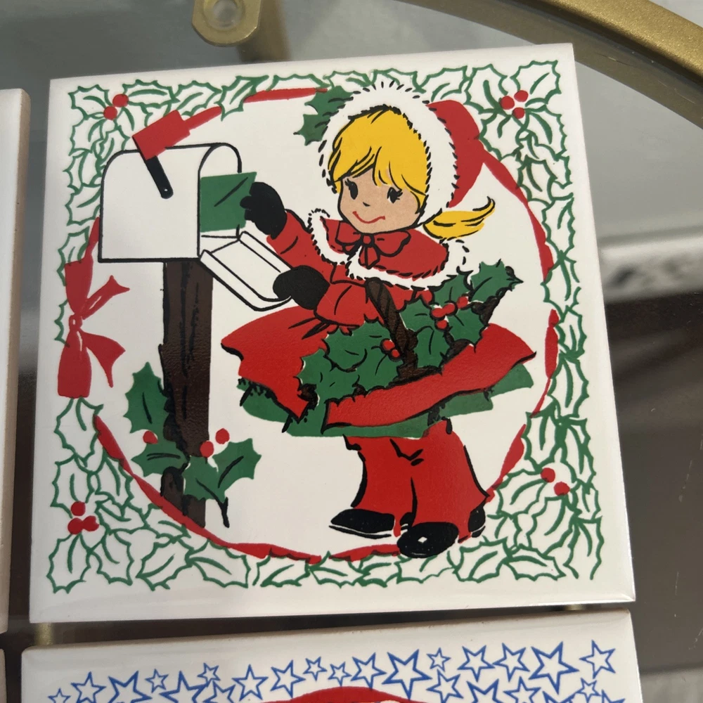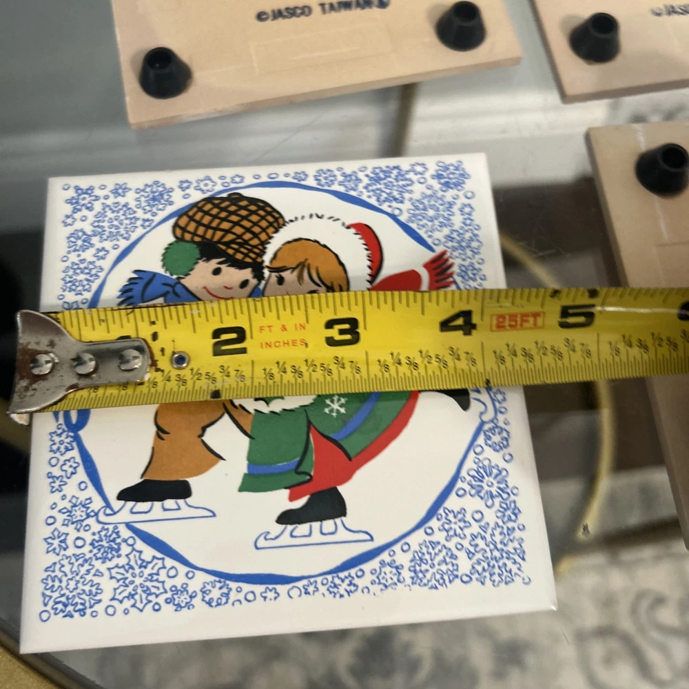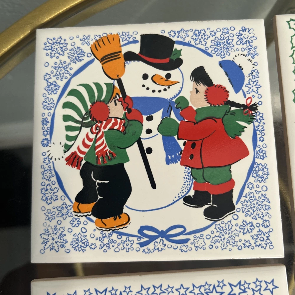 The Vintage Jasco Christmas Holiday 4" Ceramic Tile Trivet 6 pieces Set features a festive multicolor design perfect for the holiday season. Made of ceramic, these trivets add a touch of charm to any Christmas table setting. This set is ideal for adding a decorative and functional element to your holiday celebrations.