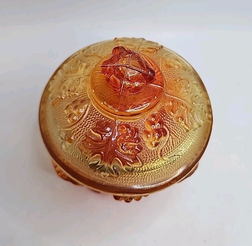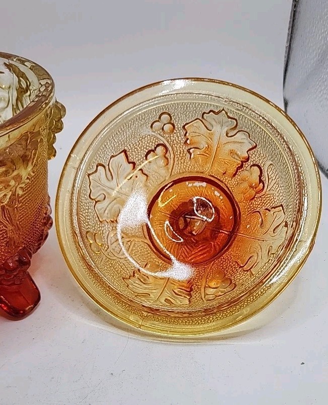 The Vintage Jeanette 1960s Amberina Grapes & Vine Footed Candy/Trinket Dish with Lid is a decorative collectible made of glass. Featuring a beautiful amberina color and a design of grapes and vines, this original piece from the 1960s adds a touch of retro charm to any space. The footed design and lid make it a unique and functional addition to a collection of decorative items, showcasing the craftsmanship and style of the Jeanette brand during this time period. No chips or cracks. Has some color fading on bottom of feet due to rubbing on surface probably