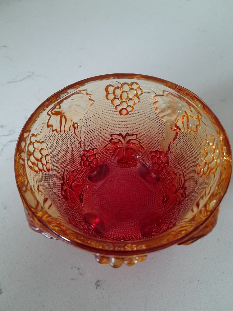 This vintage Jeanette candy dish is a round red glass compote with a lid. It is American-made, dating back to the 1960s. The pressed glass technique gives it a unique appearance, and it has a capacity of 1 cup. Its amberina color adds to its vintage appeal, making it a charming addition to any collection. Some color wear on lid