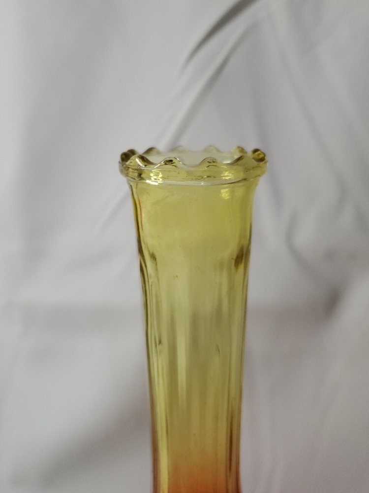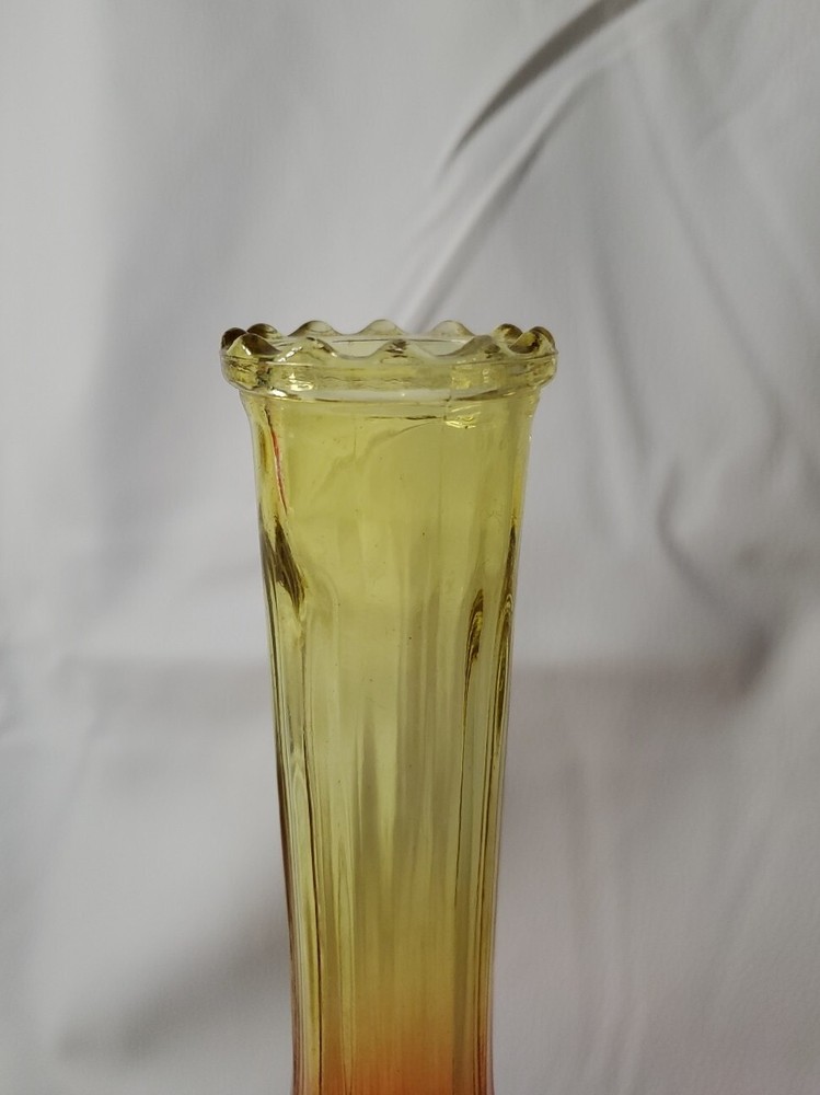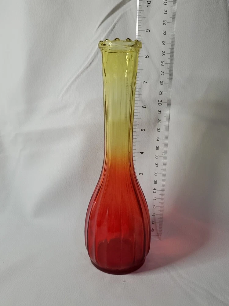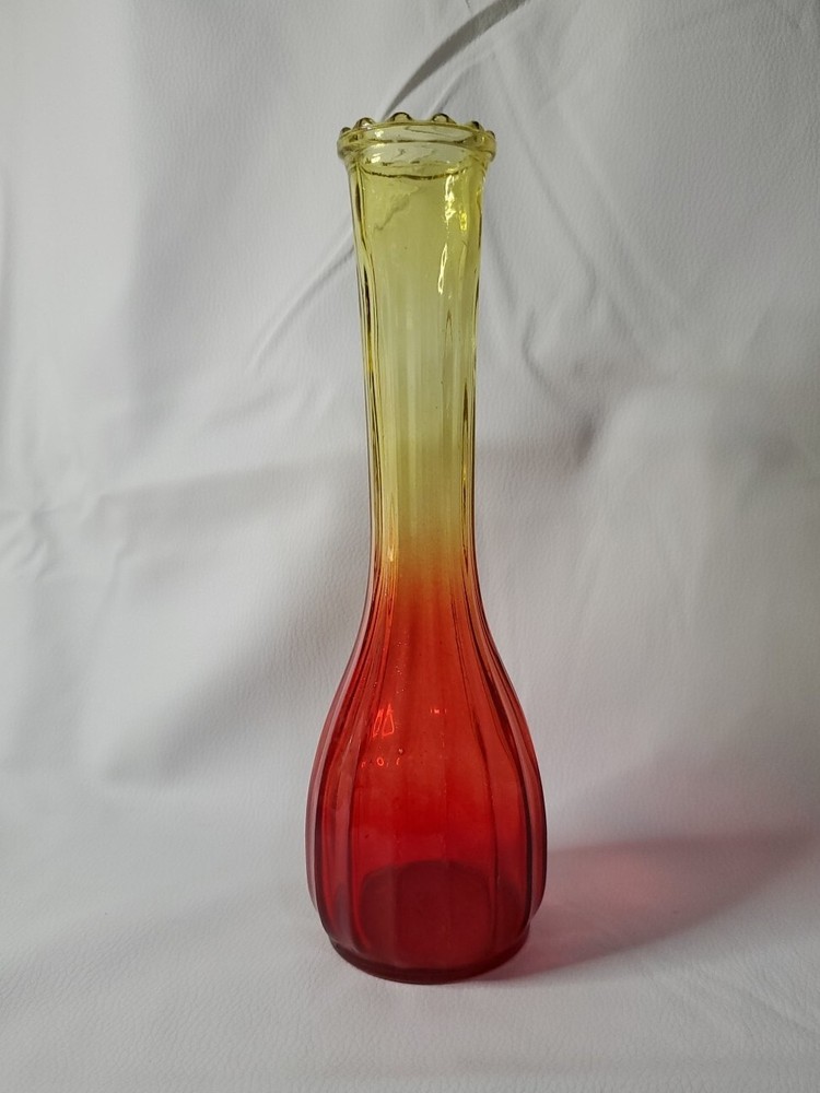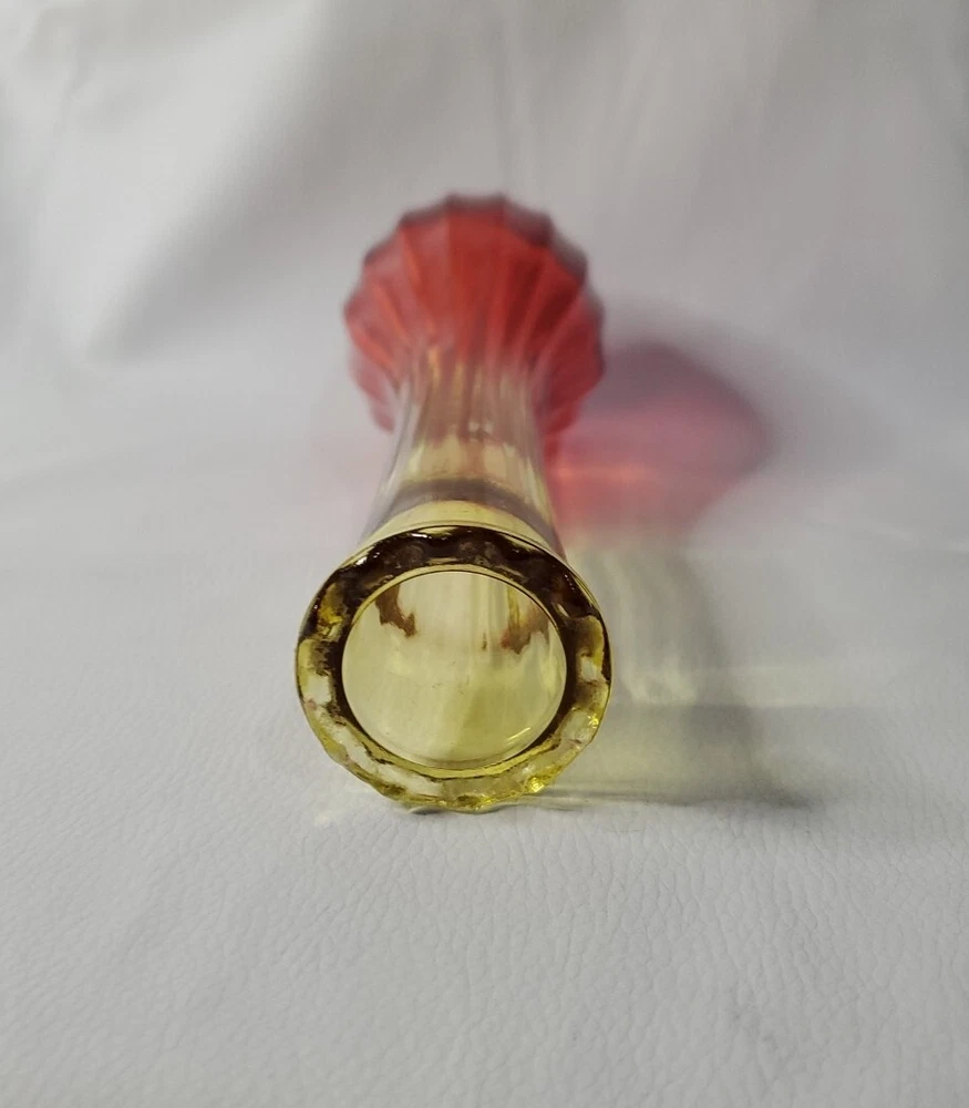 This vintage Jeannette glass bud vase is a charming addition to any collection. The yellow and red ombre effect on the vase creates a unique and eye-catching look. Measuring 8.5 inches in length, this small vase is perfect for displaying a single flower or small bouquet. Made of high-quality glass, this vase is durable and will last for years to come. Perfect for collectors and home decor enthusiasts alike, this yellow and green vase is a must-have piece. Excellent Condition-- no chips or cracks.