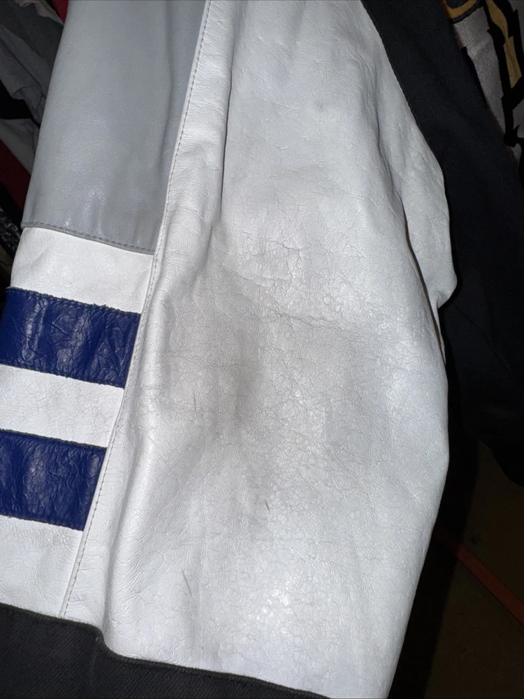 This vintage Jeff Hamilton bomber jacket is a must-have for any NASCAR fan. The jacket features the iconic Wildcats design and is perfect for those chilly days at the race track. The jacket is in great shape and will keep you warm while you cheer on your favorite driver. The jacket is a size large and is made of high-quality materials, ensuring that it will last for years to come. This jacket is a rare find and a great addition to any fan's collection. Please see photos for wear. This has been loved. Sold as is. Hanging