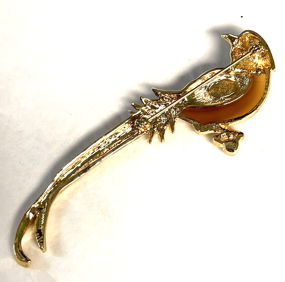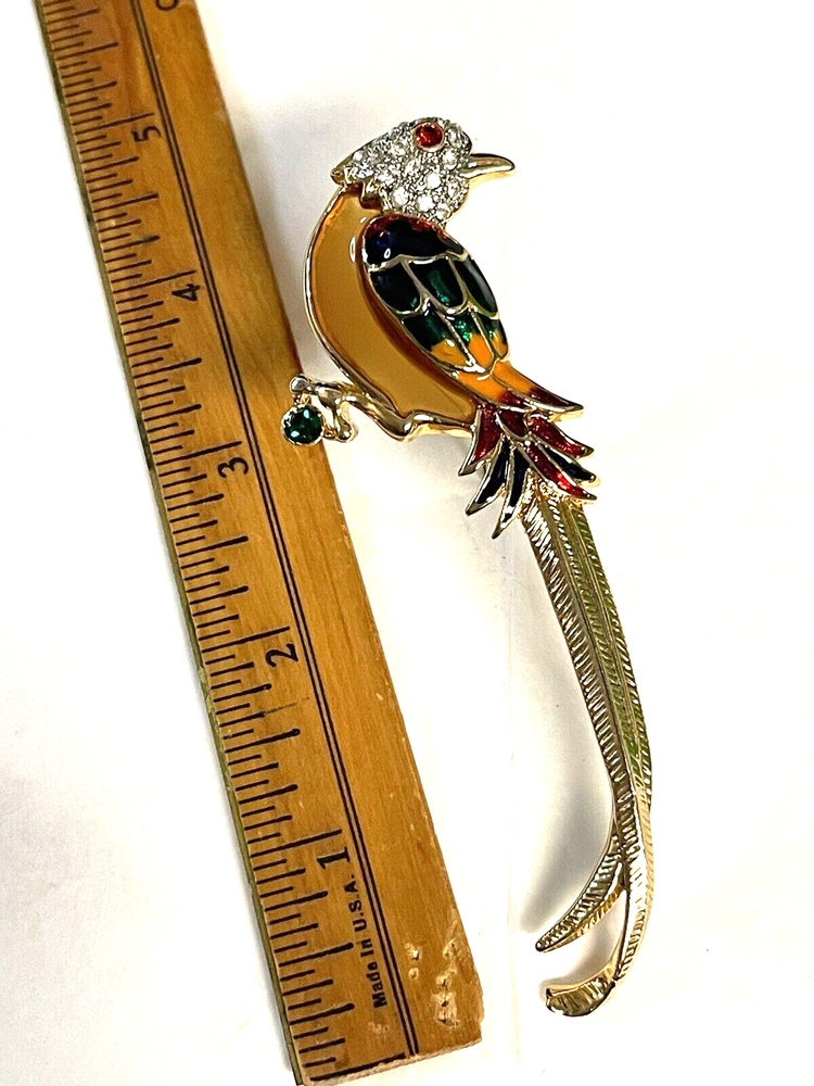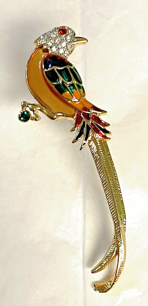 Add a touch of whimsy to your outfit with this Premier Design Jelly Belly Fanciful Bird Parrot Enamel Rhinestone Figural Brooch. The brooch features a colorful enamel design with sparkling rhinestones that will catch everyone's eye. The intricate details of the bird and parrot make this brooch a unique addition to any jewelry collection. Perfect for a gift, Christmas, or birthday, this brooch is sure to please any fashion-forward woman. The brooch is 5" in length and is an original piece from an undated era. This brooch is not handmade and comes with no seller warranty. Add this Premier Design Jelly Belly Fanciful Bird Parrot Enamel Rhinestone Figural Brooch to your collection today! T hank you for looking. This item is from a smoke free home. Please view all the photos. Check out all my other items.