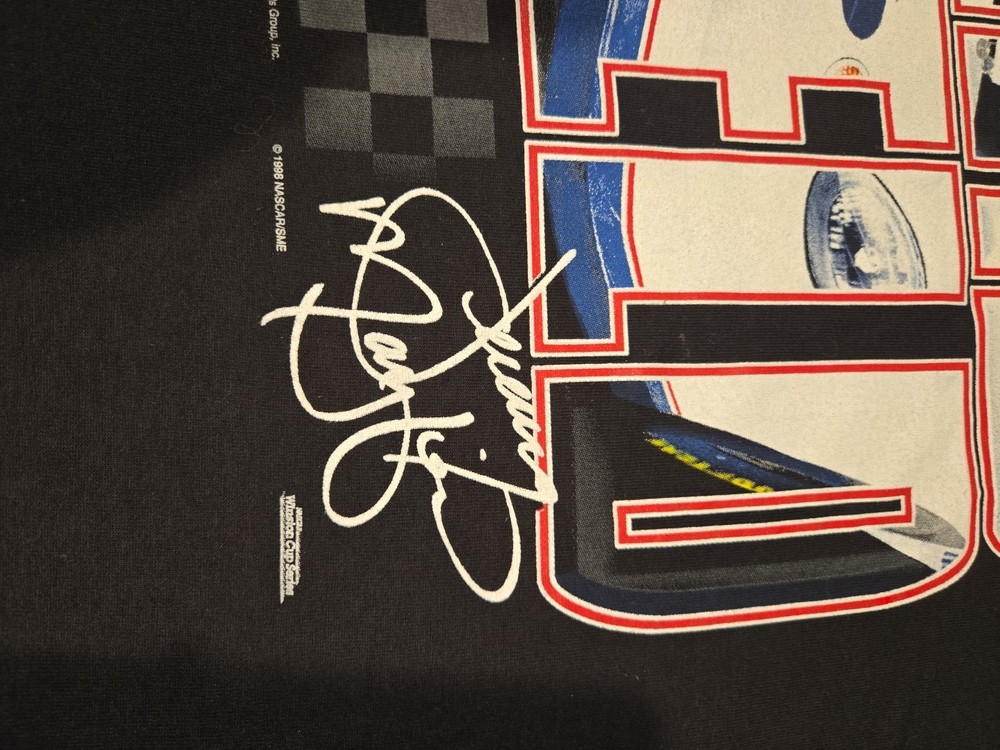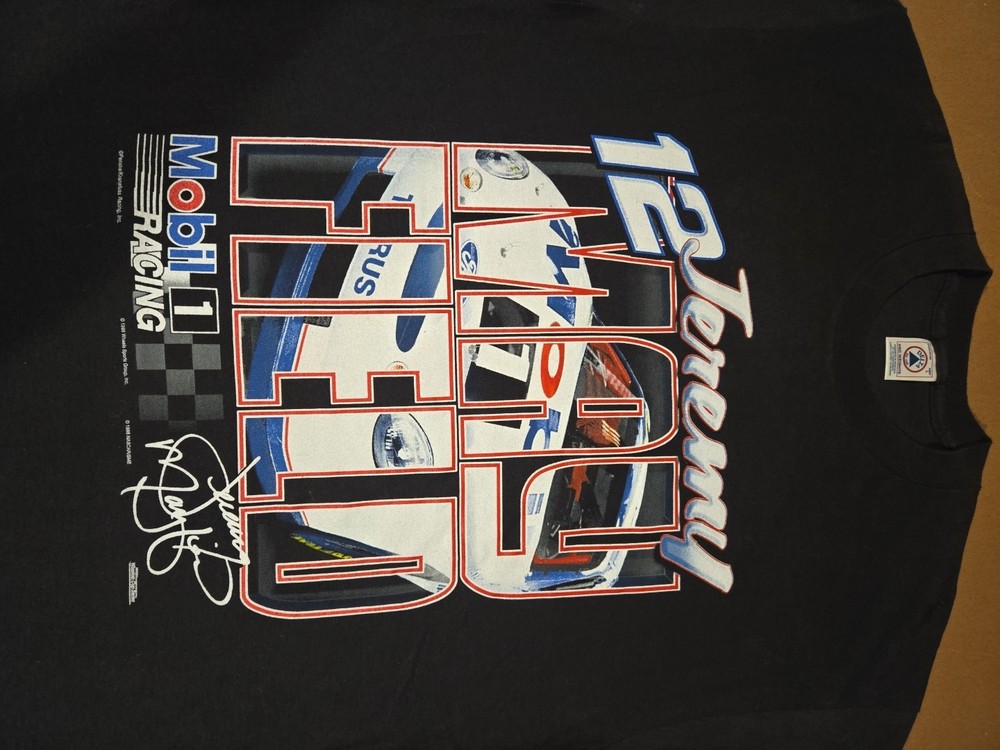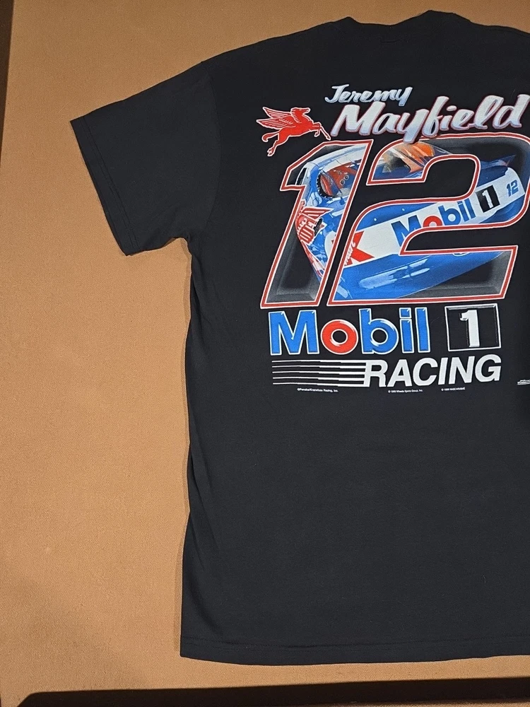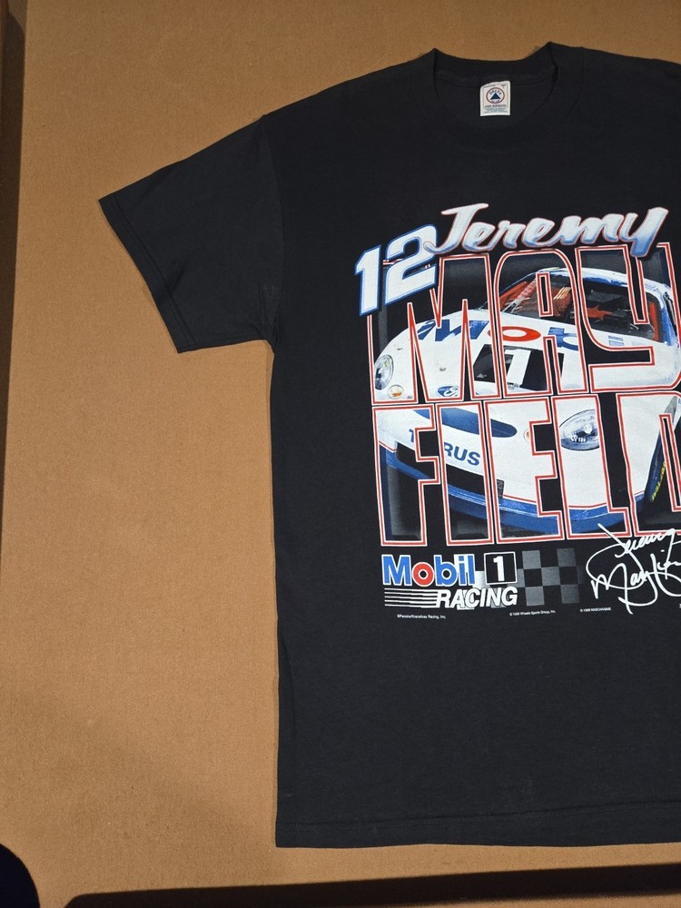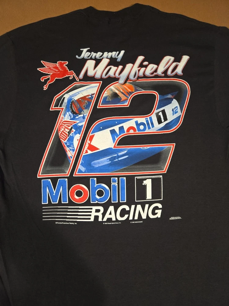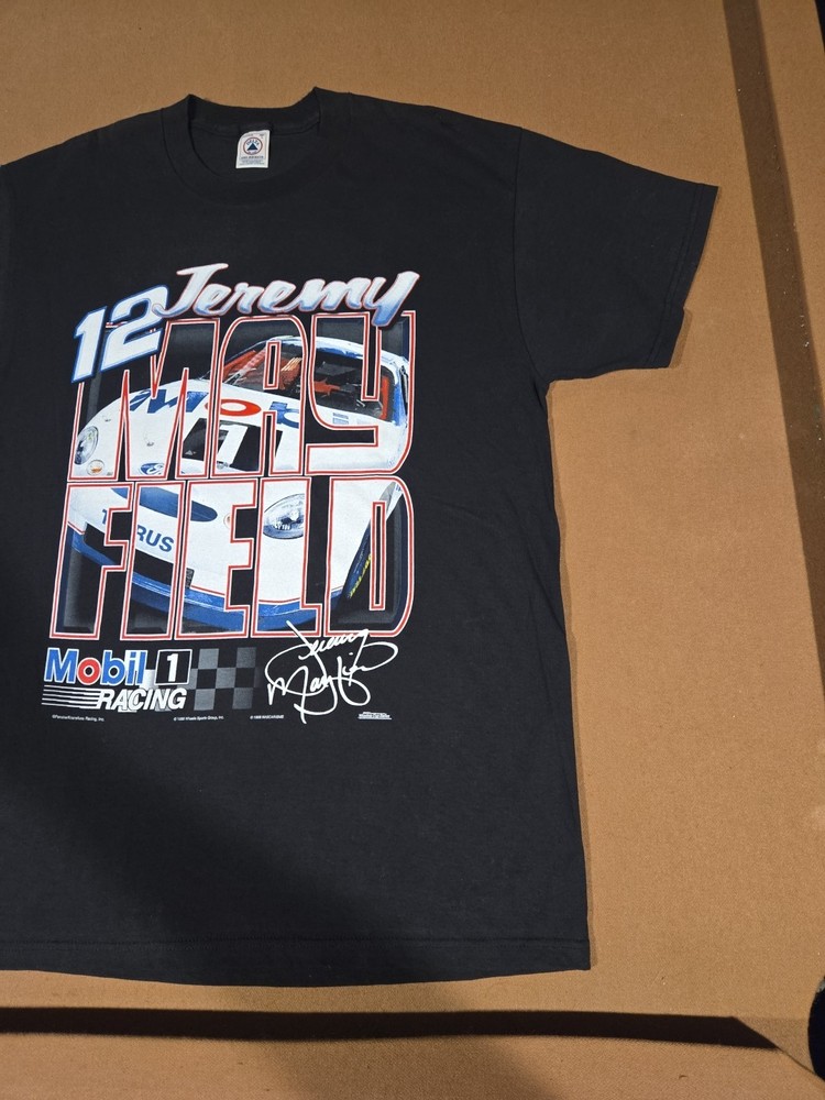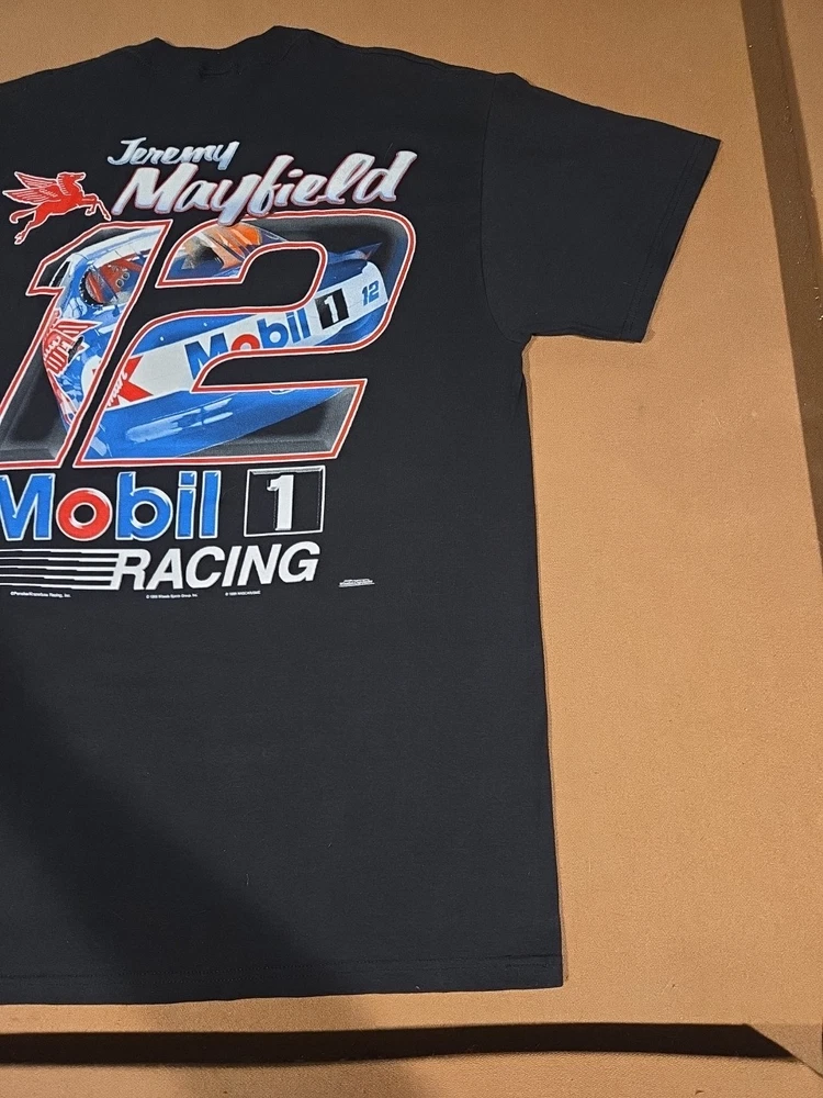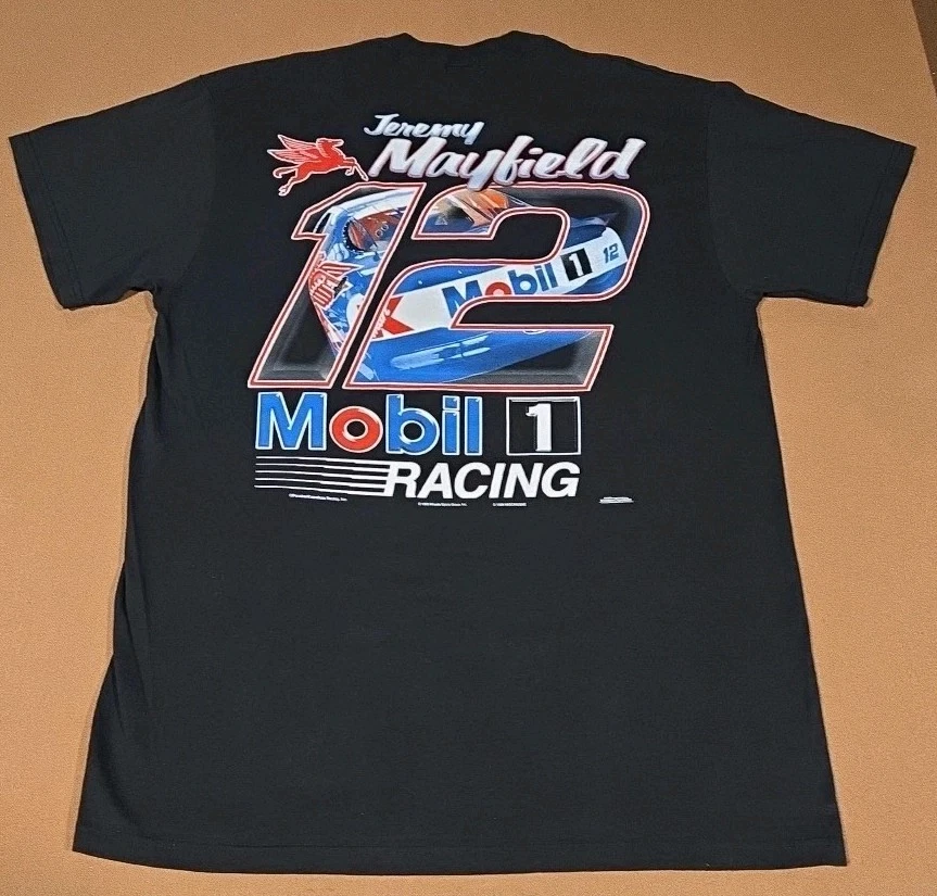 23 pit to pit 32 length Excellent Used Condition graphic print is very crisp. The product is a vintage Jeremy Mayfield Nascar shirt from the 1998 season featuring Mobil 1 Racing. This officially licensed shirt by Delta is a size L and is designed for men. The black shirt showcases the driver's team, Penske Racing, and is perfect for fans of auto racing and Jeremy Mayfield. Made in Honduras, this shirt is a great addition for collectors of fan apparel and souvenirs in the sports memorabilia category.