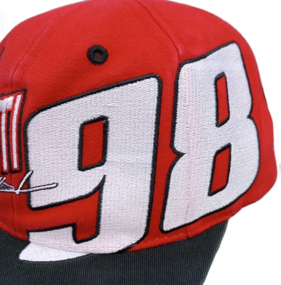 Capture the excitement of the race track with this vintage John Andretti NASCAR Snapback Cap. Proudly showcasing the #98 RCA Racing team, this hat is a must-have for any auto racing enthusiast. The bold red color and classic design make it a timeless piece of fan apparel. Crafted by H3 Sportsgear and officially licensed by NASCAR, this cap ensures both quality and authenticity. Whether you're at the event or just celebrating the legacy of John Andretti, this hat is the perfect accessory for expressing your passion for the sport. Some imperfections, please refer to pictures for condition details, see last 2 pictures in particular.