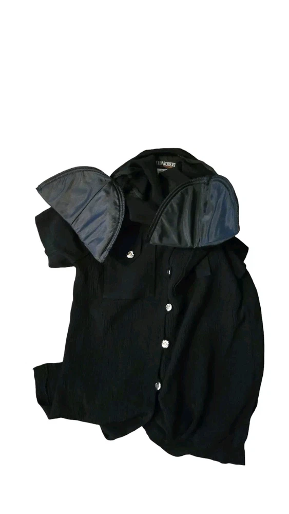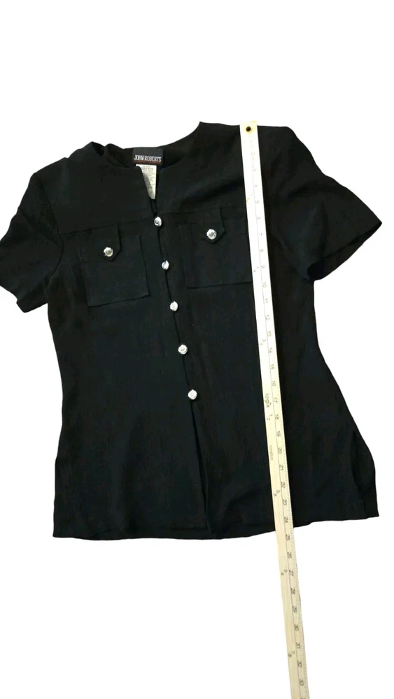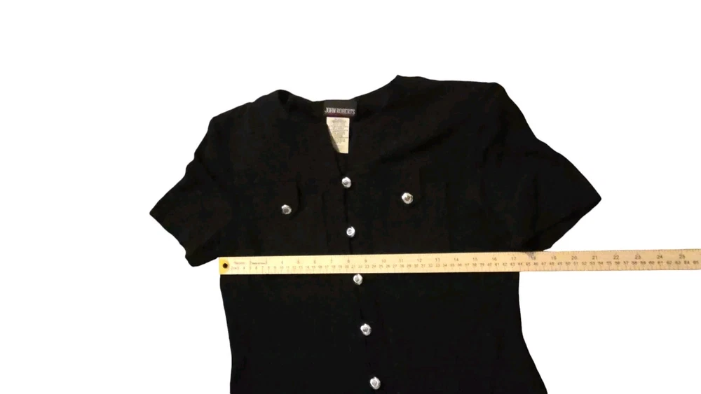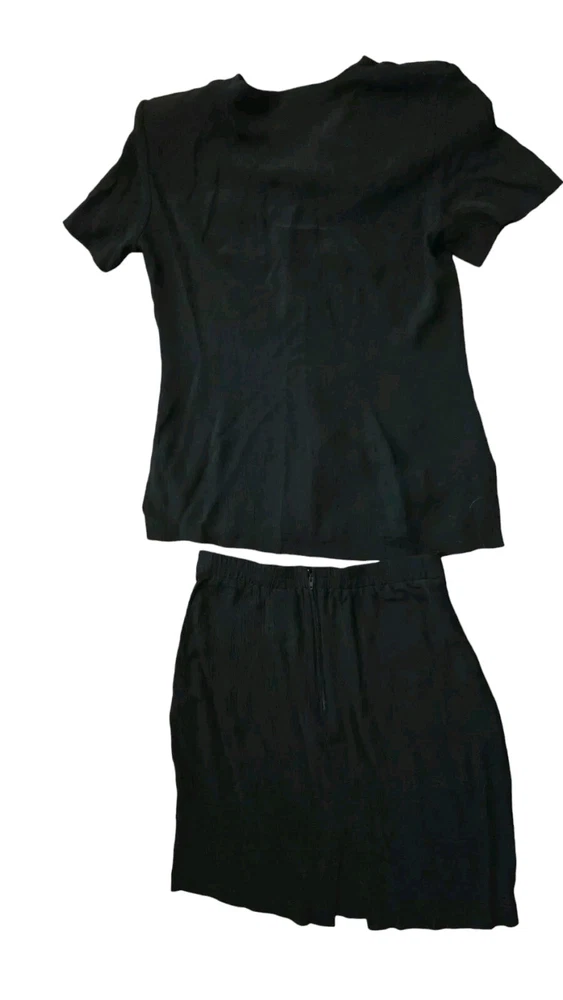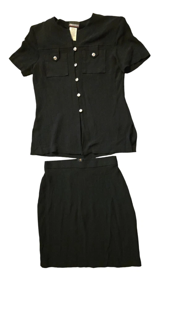 Vintage 80's John Roberts Shoulder Pads Black Skirt Set Paper Tags Non Iron Liquid Knit Size 10 77% Acetate 23% Rayon Made In USA