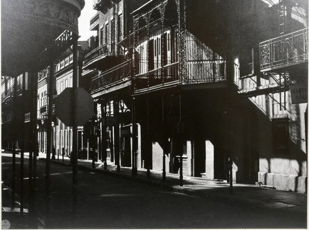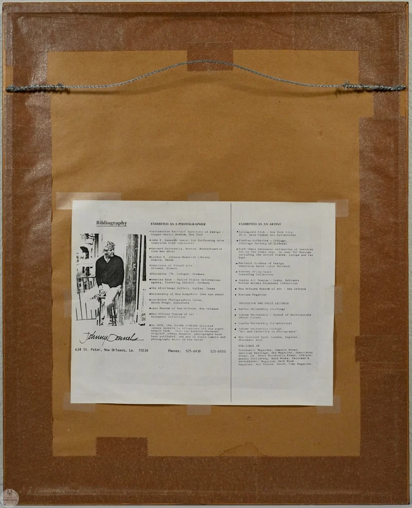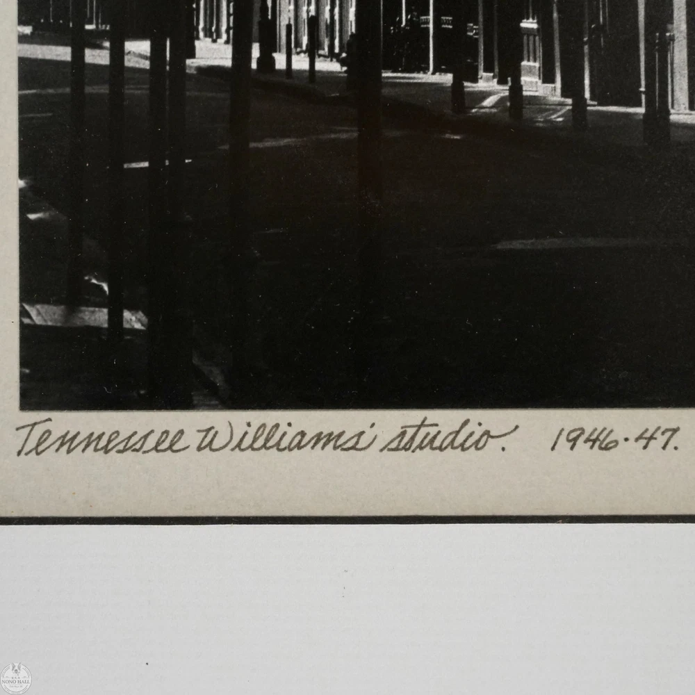 The Vintage Framed Original Gelatin Silver Photographic Print "Tennessee Williams' Studio", Signed in Graphite By Photographer Johnny Donnels ( American, 1924-2009 ) in Lower Right. It Captures the Quiet Architectural Poetry of New Orleans' French Quarter in the Immediate Postwar Year. Identified By the Artist As "Tennessee Williams' Studio", the Image Documents the Atmospheric Streetscape Associated with the Early Creative Life of the Celebrated American Playwright. Donnel's Refined Composition Highlights Wrought Iron Balconies, Layered Facades, and Dramatic Shadows Stretching Across the Street. The Absence of Figures Enhances the Contemplative Mood, Allowing Architectural Rhythm and Light to Define the Scene. Rich Tonal Contrast and Subtle Gradations are Characteristic of Period Silver Printing and Underscore the Photographic Print's Mid Century Sensibility. The Photographic Print Shows Minor Toning, and Wear on the Frame Consistent with Age, In Good Condition. Title: "Tennessee Williams' Studio" Artist: Johnny Donnels ( American, 1924-2009 ) Time Period: 1980s Medium: Gelatin Silver Photographic Print Condition: Good Condition Frame Size: 21" By 17" Sight Size: 13" By 9-3/4" Available For Domestic Shipping and International Shipping. Thanks!