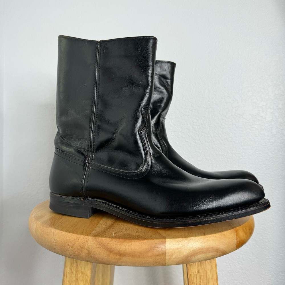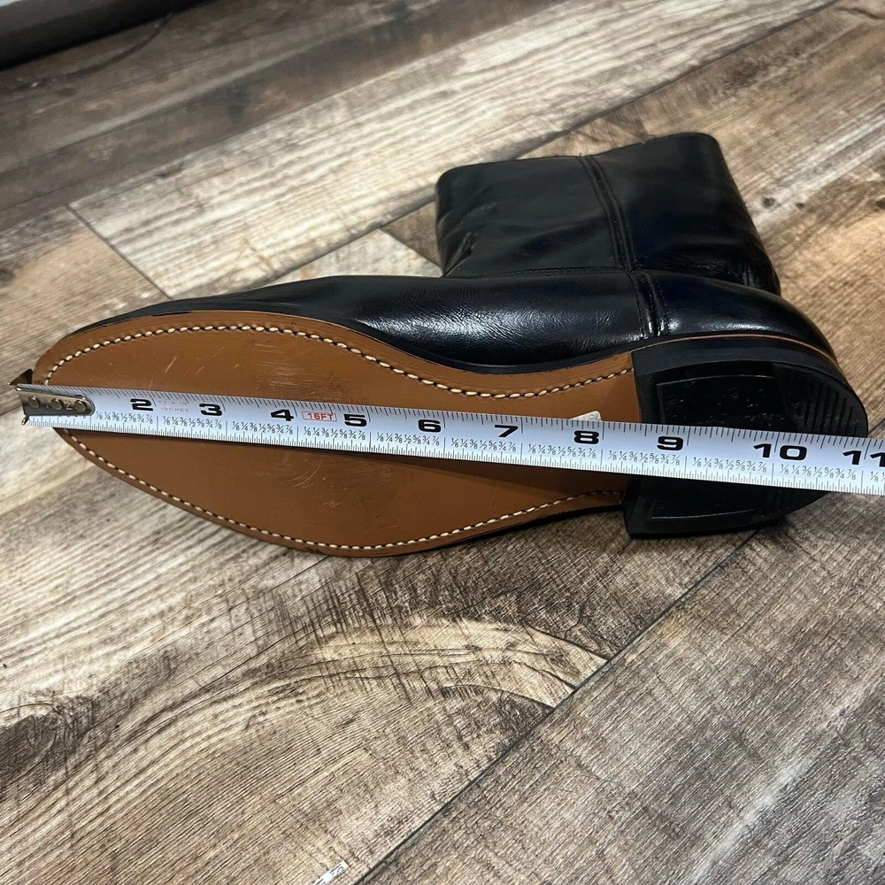 Very rare custom made leather Wellington Style army office dress boots made by the Johnsonian in good condition. We believe they were made in the 40s. Because they were custom made, they do not have a marked size. Please see all measurements to confirm your fit. The inside leather feels so nice. The boots have slightly more heel wear on one side and there is a little black missing, mostly on the back of the heels where one foot was probably used to get the other boot off but also around the top edge and a few other tiny dings. The rest is normal wear creasing and a few small scuffs. The insides are in good condition. There is one small leather ding in one near the top. Please take a look at the photos and the measurements before purchasing. We do not know what size they are so please measure your foot and look at our photos with the measurements.