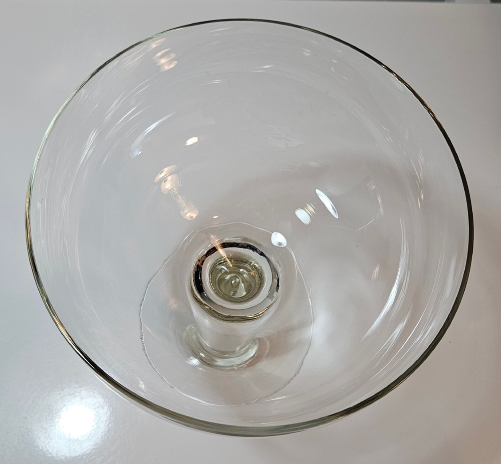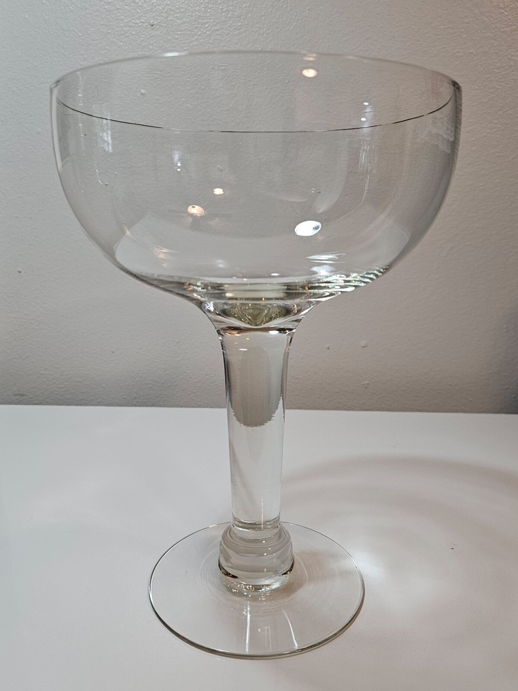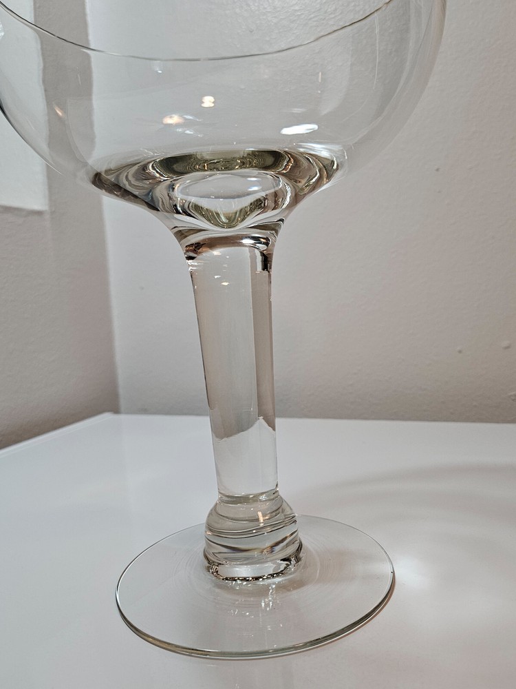 This vintage jumbo wine glass has a sturdy stem and a generous 48 liquid ounce capacity. Standing at 10.5 inches tall with a 7.5 inch diameter bowl, this round wine glass is both elegant and fun. Make this a centerpiece for your table at your next gathering. Makes a fun fruit bowl! Hand wash only to maintain its clarity and keep it looking its best for years to come.