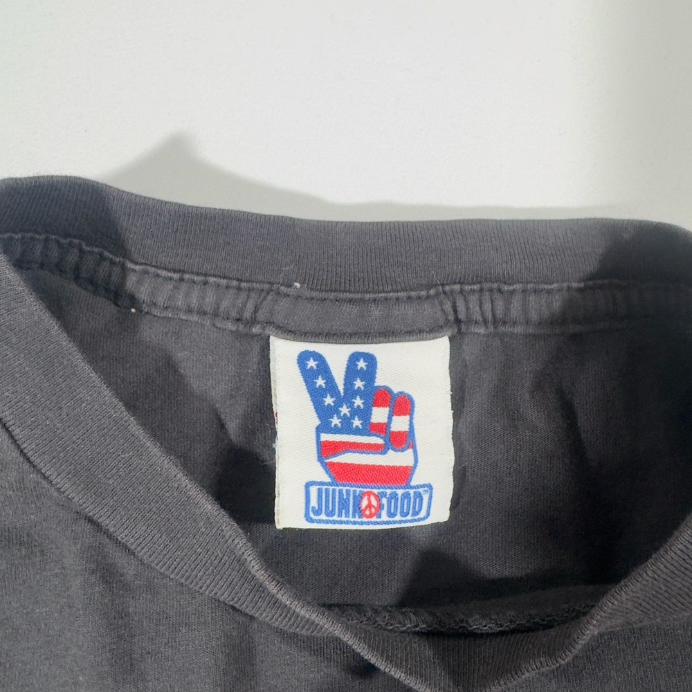 Vintage Junk Food Superman Graphic Tee Faded Black Vintage Junk Food Clothing Superman graphic t-shirt in a faded black wash. Features a distressed comic book style print for a classic Y2K or 00s streetwear look. Soft 100% cotton material with an effortless lived-in feel. #vintage #superman #junkfood #streetwear #y2k