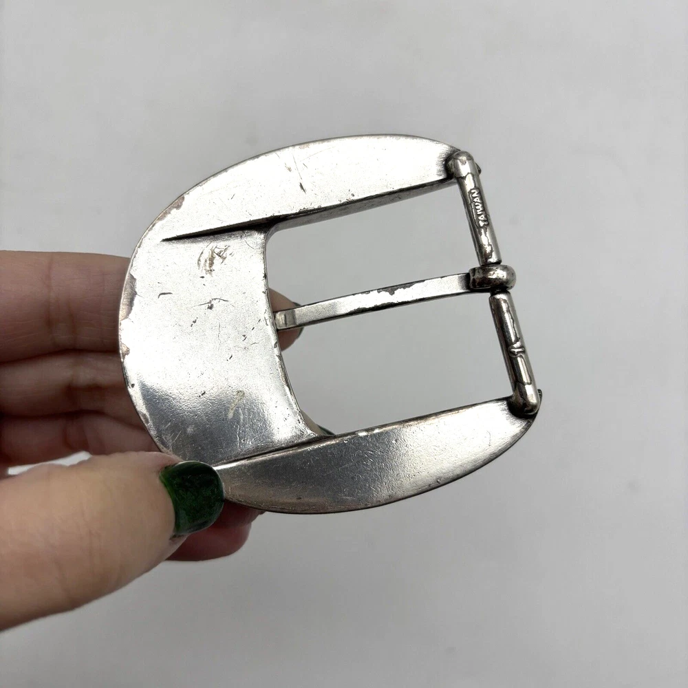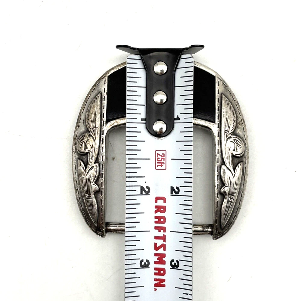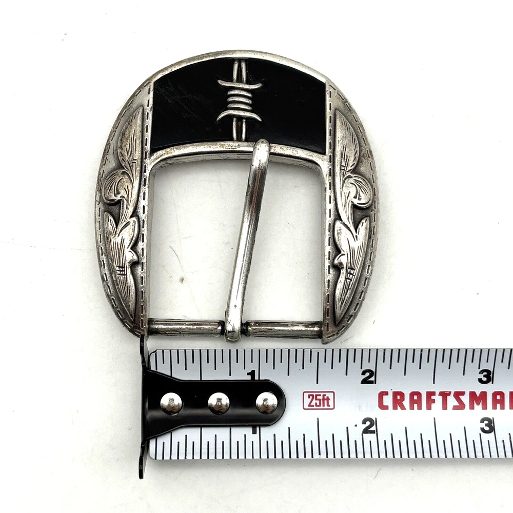 Vintage Justin 'Fenced In' Buckle Silver-tone Black Leather Inlay Barded Wire Design Western Filigree Accents Fits 1.5" Belt Measurements: 2.5" long 2.5" wide Great vintage pre owned condition. Gently owned. Some scuffing/scratches from age/use. Does not come with belt! Clean and from a smoke free home.