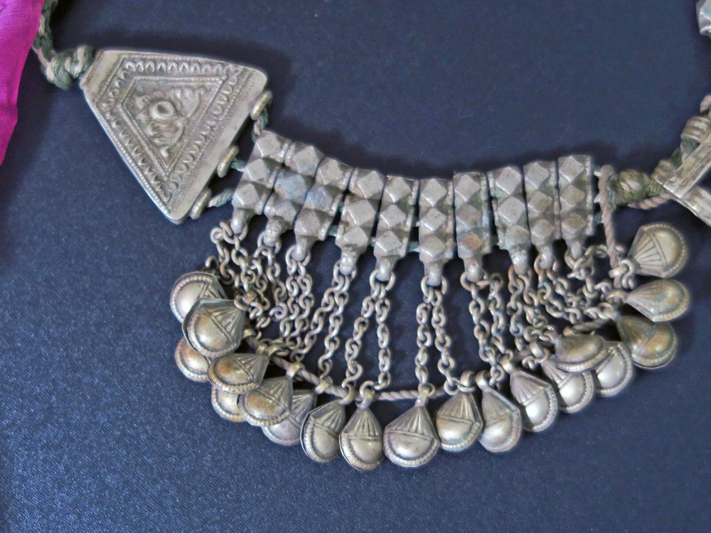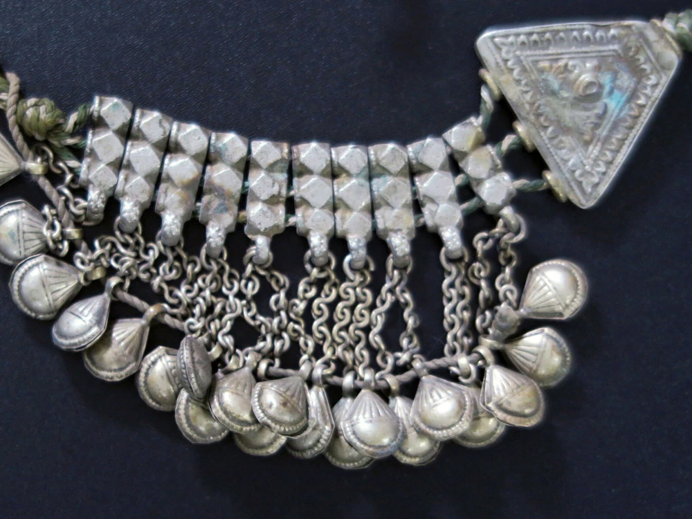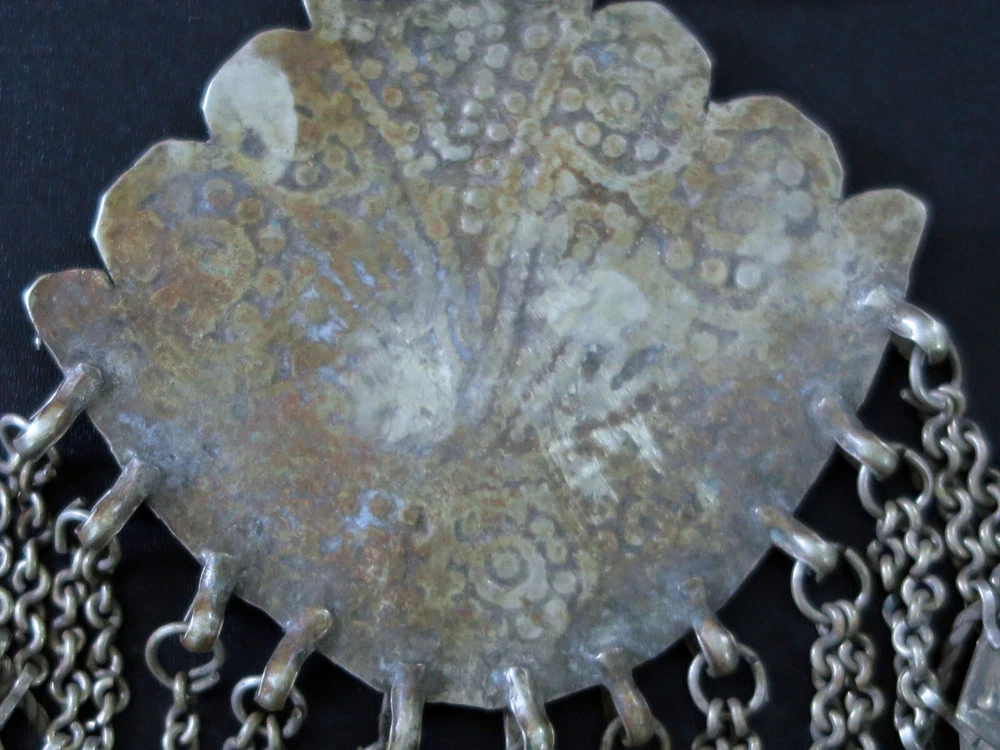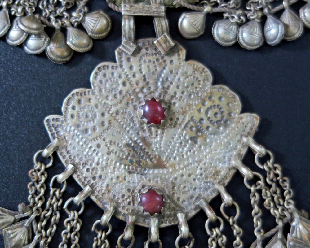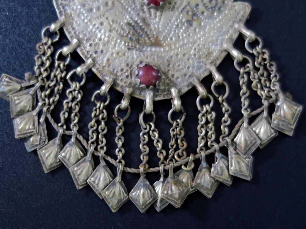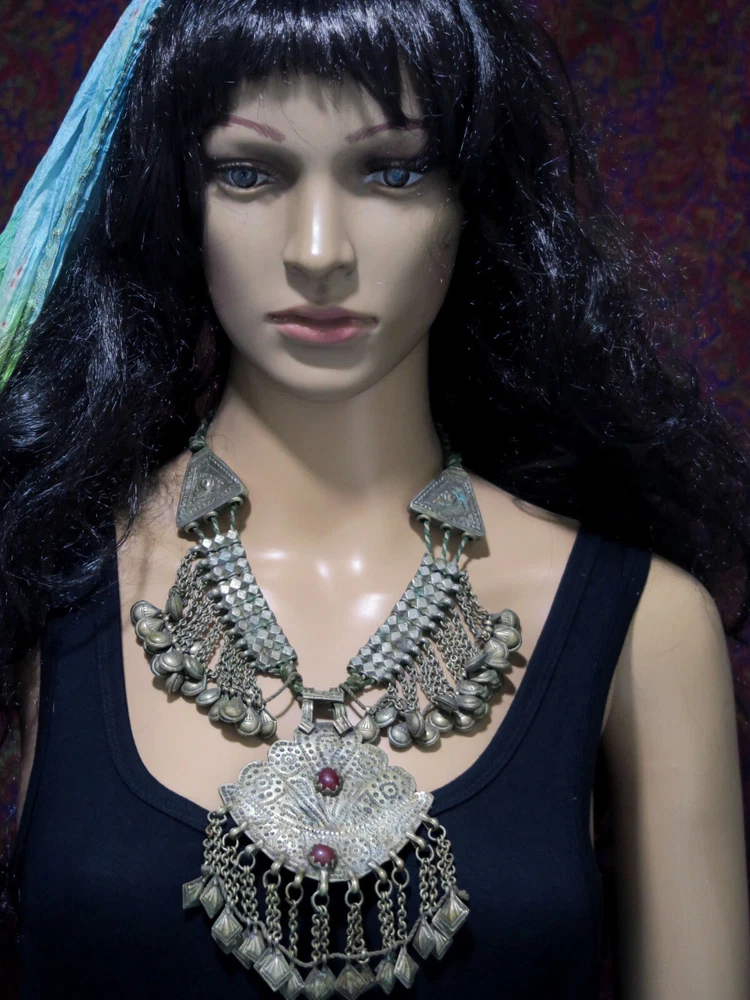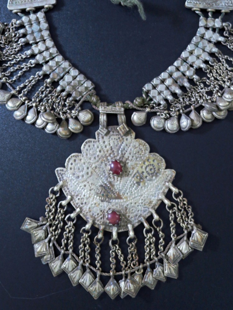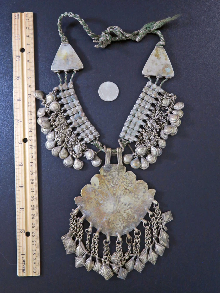 This is very-old necklace was handmade during the early to mid-1900's in Kashmir along the Old Silk Road of Central Asia. It is old vintage tribal jewelry, not a new reproduction. More measurements and relevant info are listed at the end of this description. This style of necklace is a traditional one, having been worn in Kashmir for generations - especially in the romantic Lake Dal region. The distinctive, large pendant in the center has incised floral designs with 2 vibrant red-beads to ward off the evil-eye. Long charm-dangles hang below, swaying with movement. It was very sturdily made, and does not bend. Lots of bold 3-lobed spacer beads extend up the sides, with more charm-dangles hanging freely below. Ornate cone-ends gather the necklace together near the back. There are more-recent ties for adjusting the length. This necklace is in excellent, collectible condition, with a rich age-patina and very mild wear-patterns. Patina reflects the light when photographed, so items often look brighter in images than they really are. Perfect for collectors of old Kashmiri jewelry, as well as for festivals, dance, theater and making a dramatic statement. MEASUREMENTS: Dimensions of Center Pendant = 6 inches long x 4 inches wide Length = Adjustable with ties Weight = 8.6 oz TM image library = 5-7-2025 Please read this about my old/vintage tribal-jewelry beforehand: Because of their age and distinguished history, old tribal and vintage pieces may have some of their dangles/charms/beads missing, replaced, damaged, or refurbished, along with other flaws, defects, and/or debris. Sharp and/or irregular edges are also possible. Because they were handmade, they are rarely symmetrical. Please note that age-patina reflects the light when photographed, so items look brighter in images than they really are. Sold as-is. Not for use by children. Returns gladly accepted within 30 days.