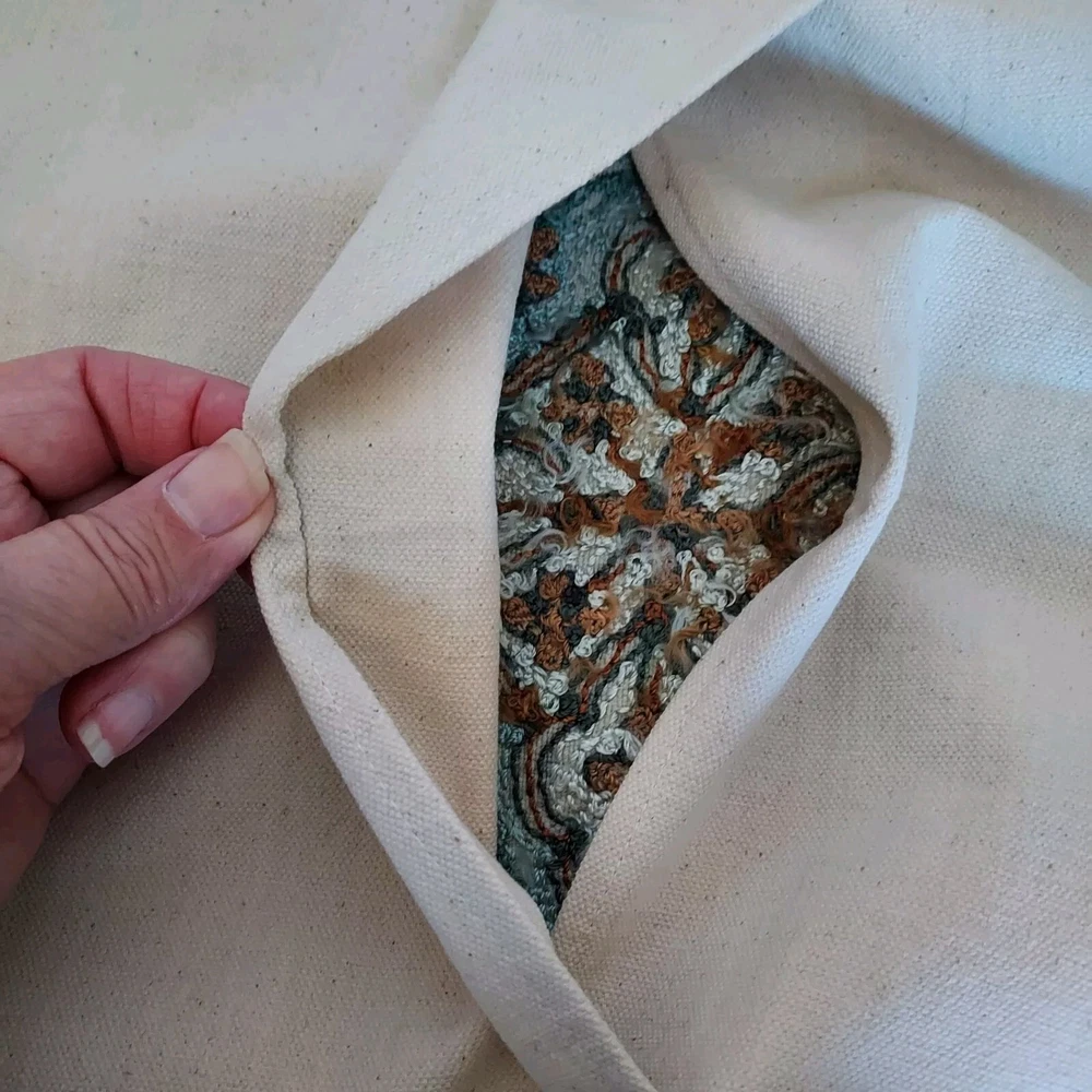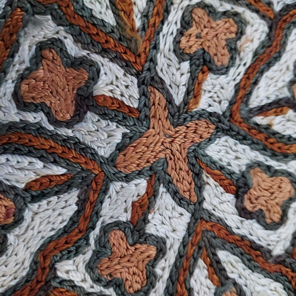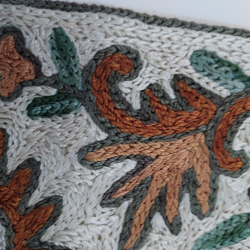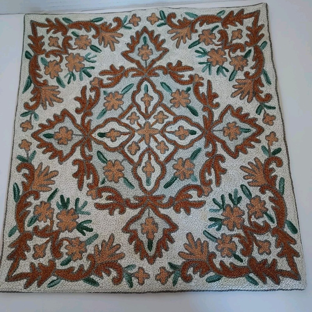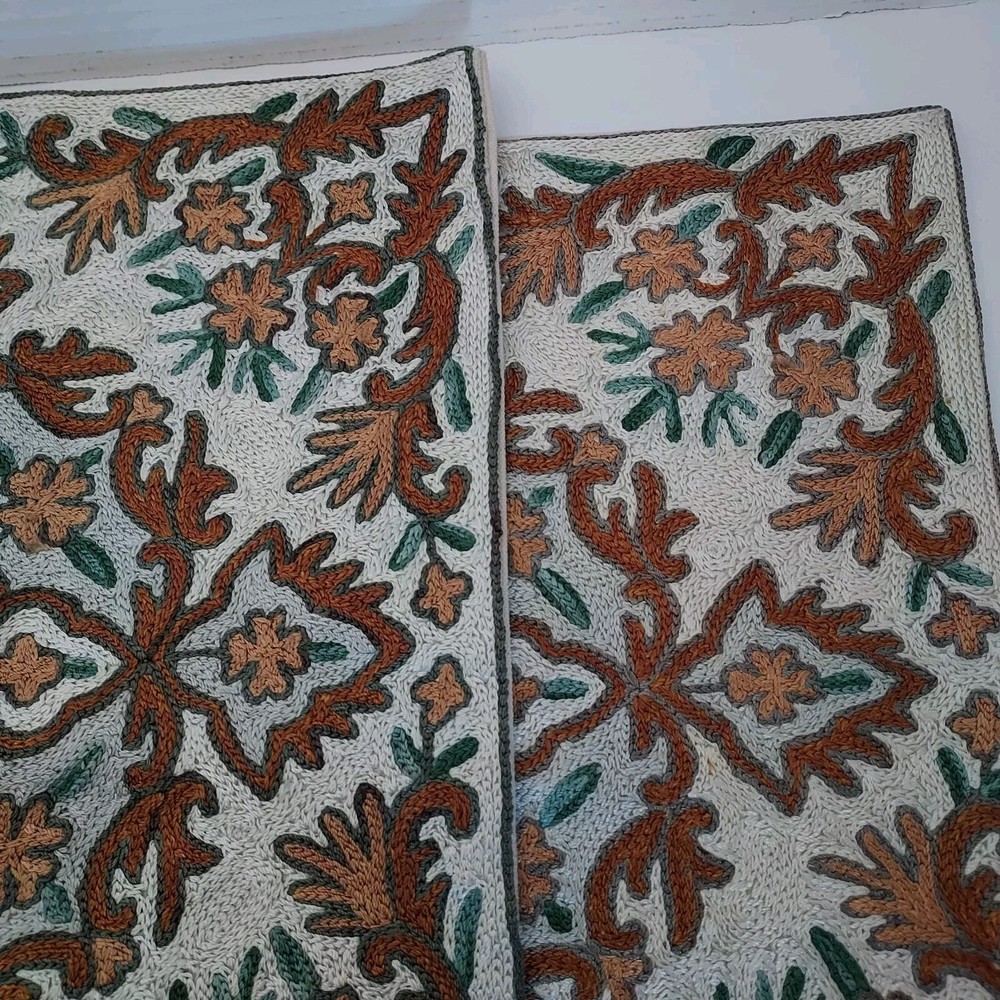 Unique hand crafted pillow covers featuring the traditional intricate chain stitch method of embroidery of Kashmir India. Wool yarn is used on handmade cotton canvas. The design uses varied shades of brown and green on a silverish white background. Due to their handcrafted nature, the covers are not exactly alike and are not totally square. They are approximately 15 inches wide and 15.5 inches high.