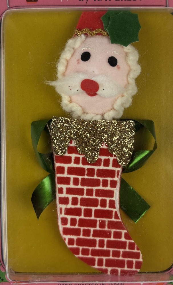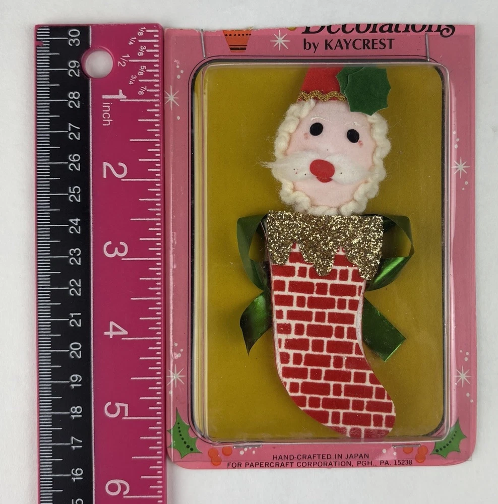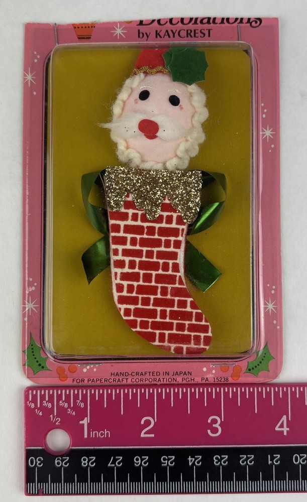 Add a touch of vintage charm to your Christmas decorations with these collectible package decorations from Kaycrest. Featuring a stick-on Santa design, these multi-colored decorations are made of a variety of materials. Manufactured in Japan. Perfect for collectors and enthusiasts, these decorations are a must-have for any holiday season. New, unused. Packaging has been cut/taped.