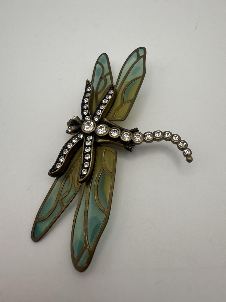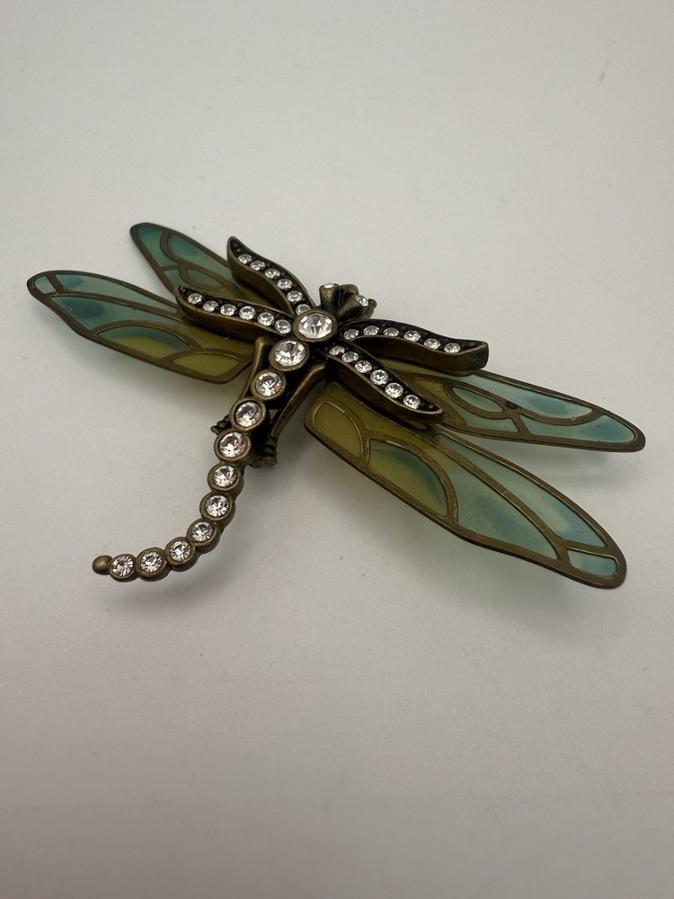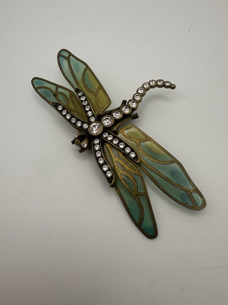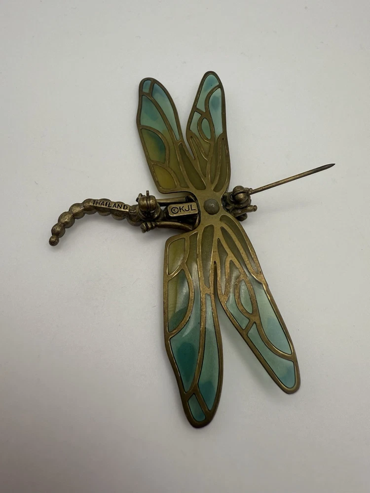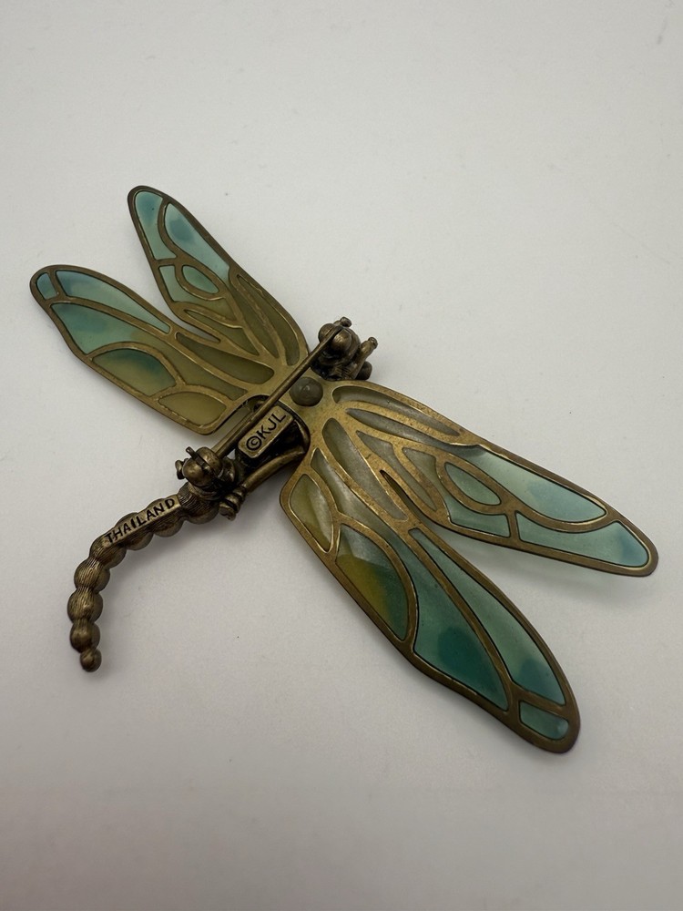 Vintage Kenneth Jay Lane (KJL) Dragonfly Brooch Enamel & Rhinestone β Thailand Bring whimsical elegance to your jewelry collection with this stunning vintage Kenneth Jay Lane (KJL) dragonfly brooch. Featuring translucent enamel wings in soft shades of blue and green and a body encrusted with sparkling rhinestones, this piece is full of Art Nouveau-inspired charm. β’ Designer: Kenneth Jay Lane (Stamped Β©KJL) β’ Material: Gold-tone metal, enamel, rhinestones β’ Origin: Stamped βTHAILANDβ β’ Style: Dragonfly insect brooch with intricate detailing β’ Condition: Excellent vintage condition β secure pin clasp, no missing stones This brooch is perfect for collectors of KJL, lovers of nature-themed jewelry, or anyone who enjoys a bold statement accessory. Pin it on a scarf, lapel, or handbag for a chic retro pop. π§βοΈ Timeless, elegant, and uniquely expressive β a must-have vintage treasure! β¨πβ¨π Open to offers