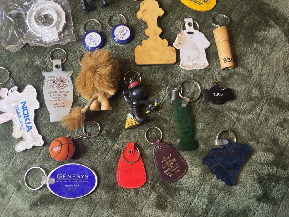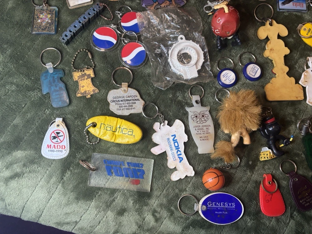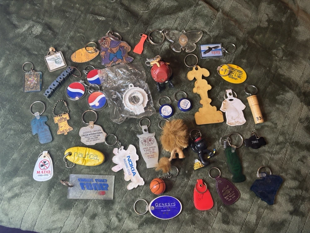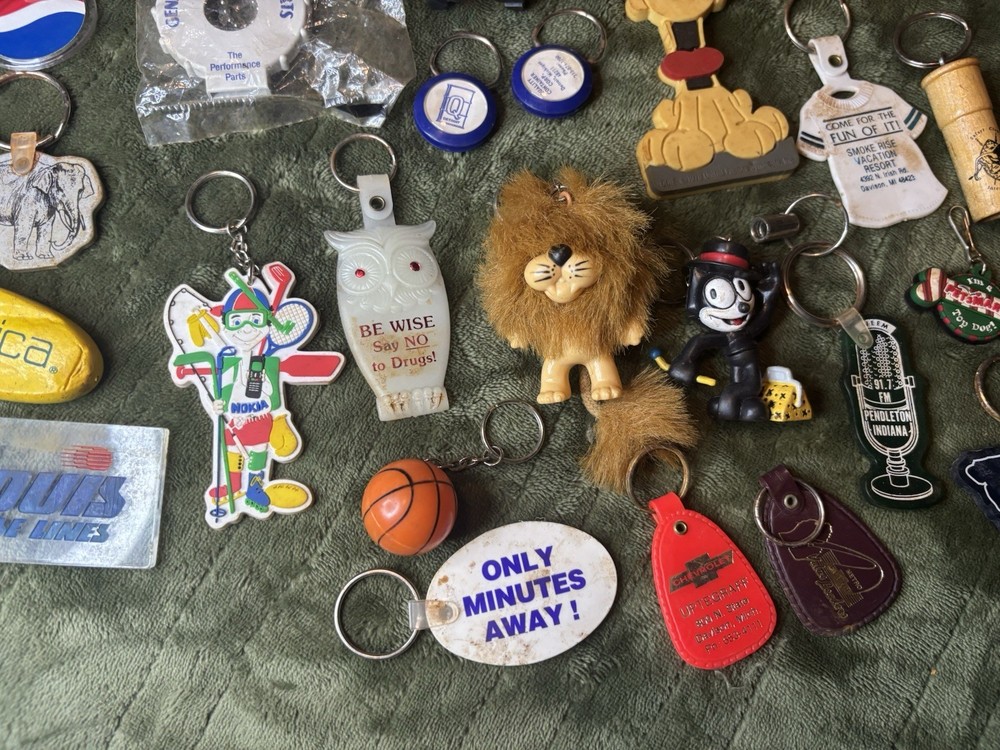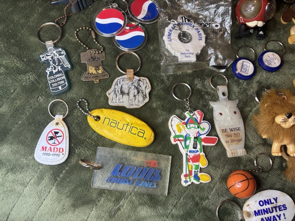This vintage keychain lot of 36 is a nostalgic throwback to the 80s and 90s, featuring a variety of promotional and novelty items from that era. The colorful keychains in this bundle showcase advertising themes and designs, making them a unique and collectible set for keychain enthusiasts and vintage collectors. Perfect for adding a touch of retro charm to any set of keys or collection, this set offers a diverse selection of keychains from the modern era.