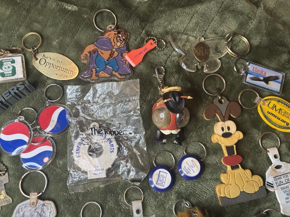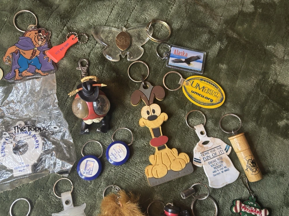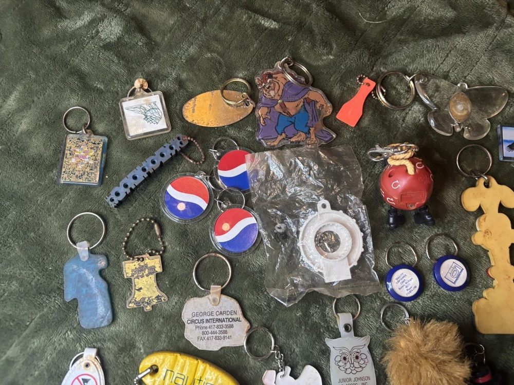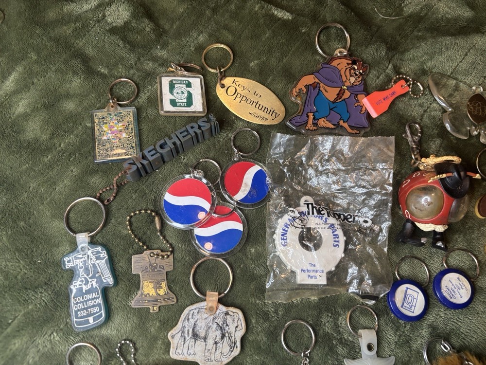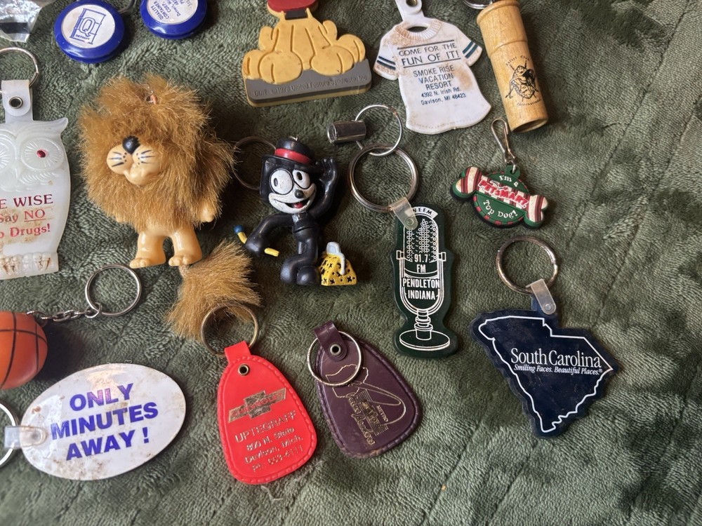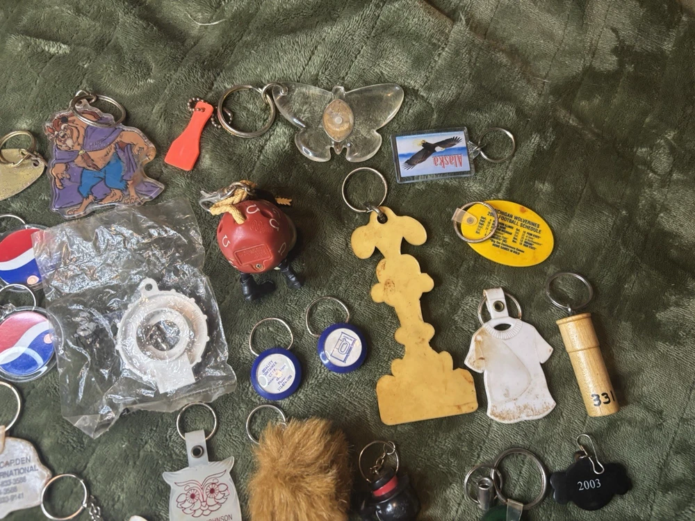This vintage keychain lot of 36 is a nostalgic throwback to the 80s and 90s, featuring a variety of promotional and novelty items from that era. The colorful keychains in this bundle showcase advertising themes and designs, making them a unique and collectible set for keychain enthusiasts and vintage collectors. Perfect for adding a touch of retro charm to any set of keys or collection, this set offers a diverse selection of keychains from the modern era.