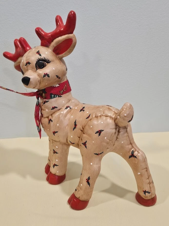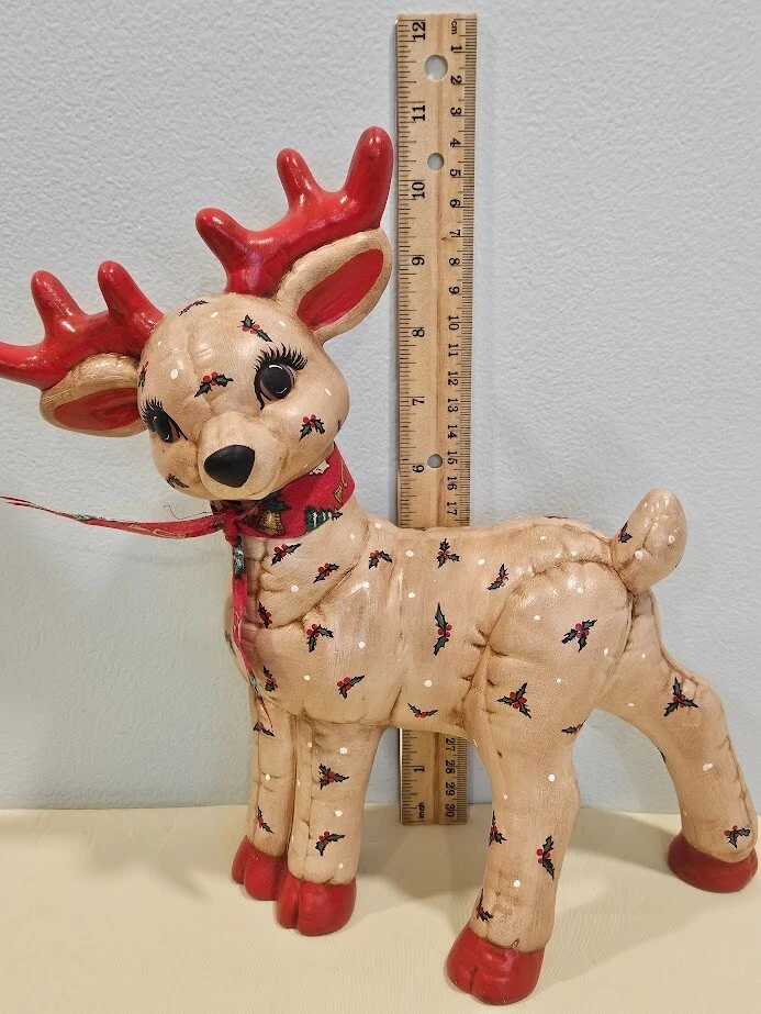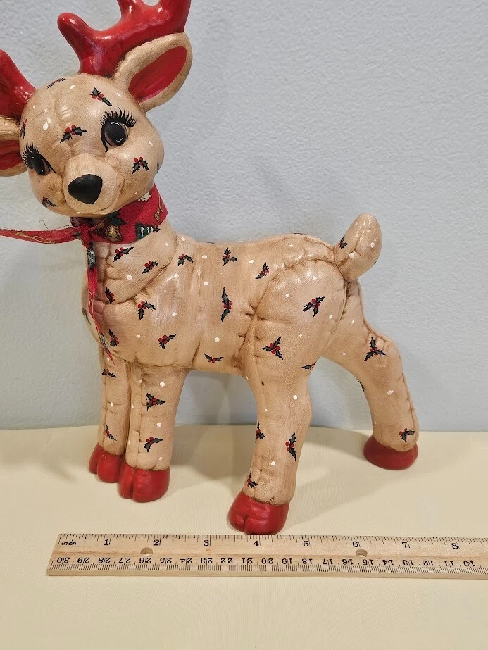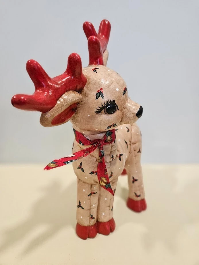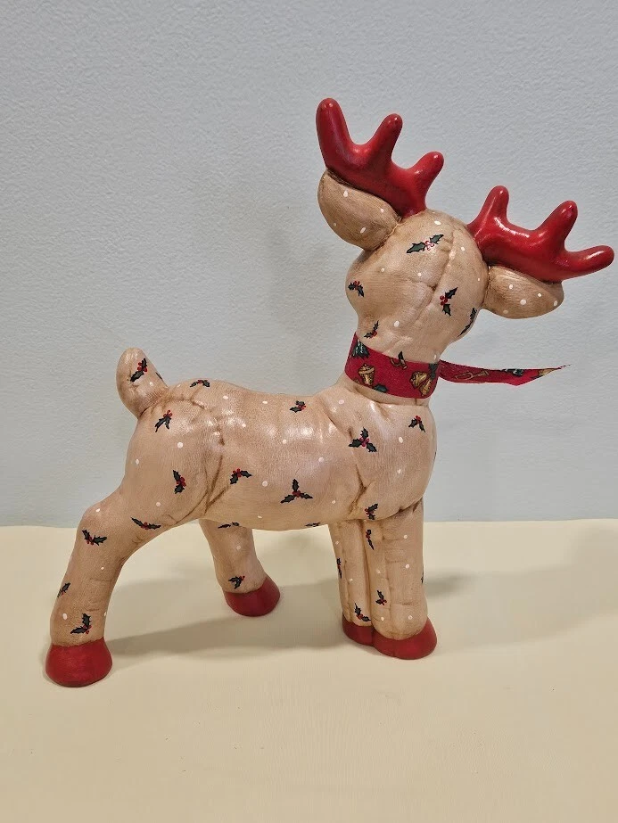 Era: Late 20th Century (1970-1999) Type: Figurine Character: Reindeer Style: 1980s Collection: Santas Reindeers Finish: Matte Department: Adults Theme: Christmas Reindeers Features: Indoor Subject: Reindeer Original/Reproduction: Original Occasion: Christmas Character Family: Christmas Item Height: 10.75 Material: Ceramic Color: Multicolor Size: Medium Year Manufactured: 1988 Pattern: Quilted Handmade: Yes Brand: Kimple Mold Country/Region of Manufacture: United States Time Period Manufactured: 1980-1989 Signed: No File number: 24-09-378 Number in Pack: 1 Item Length: 7.5 in